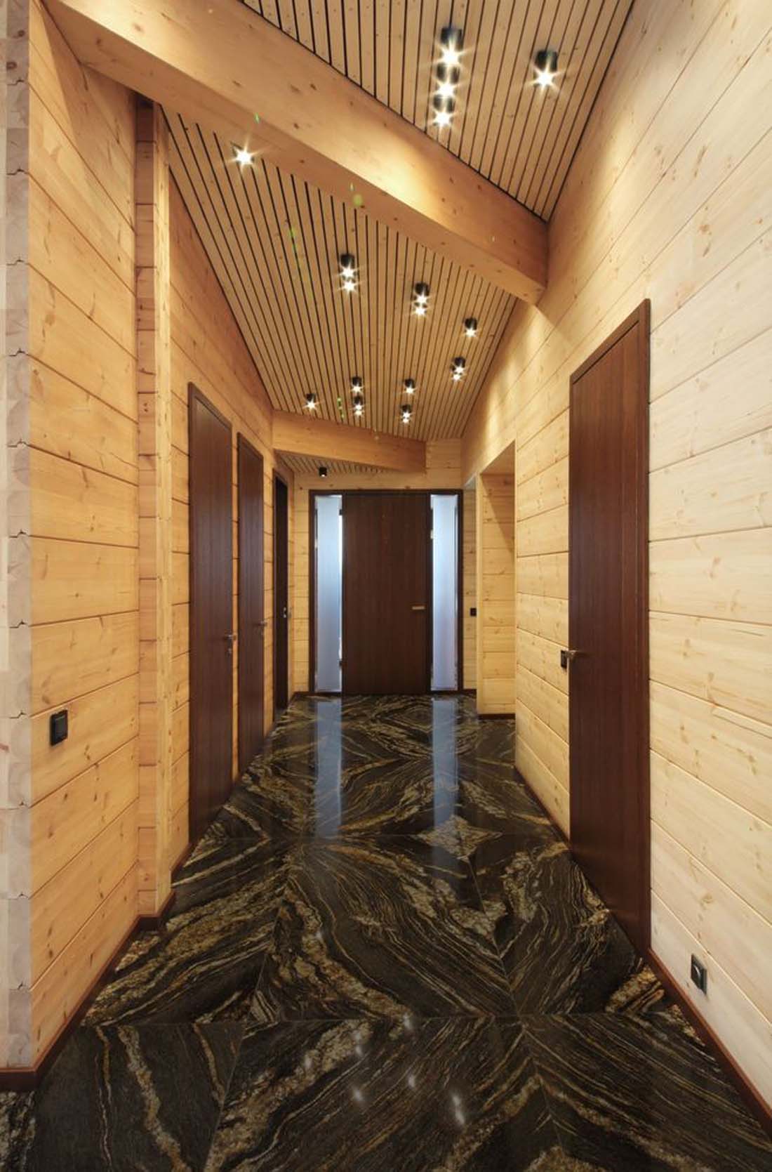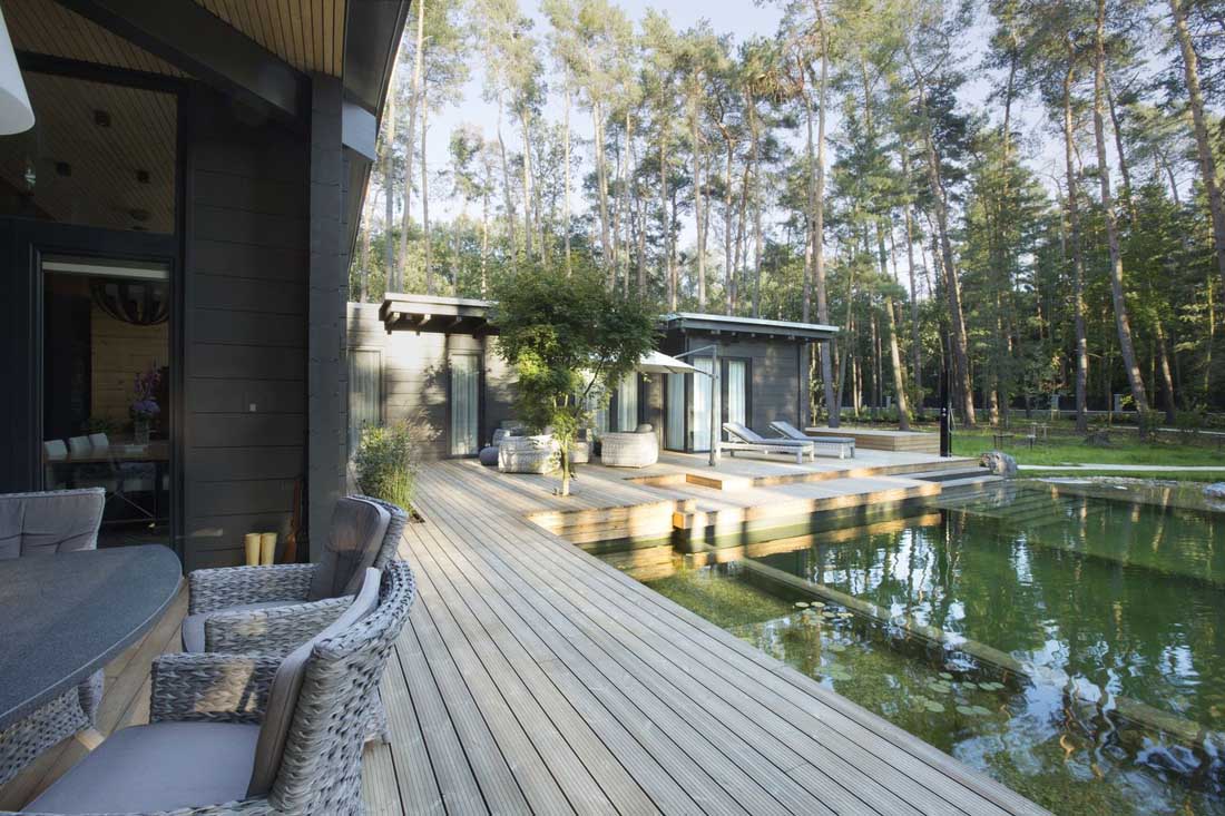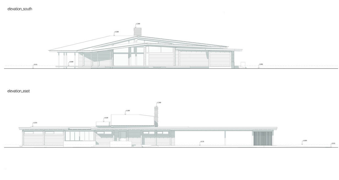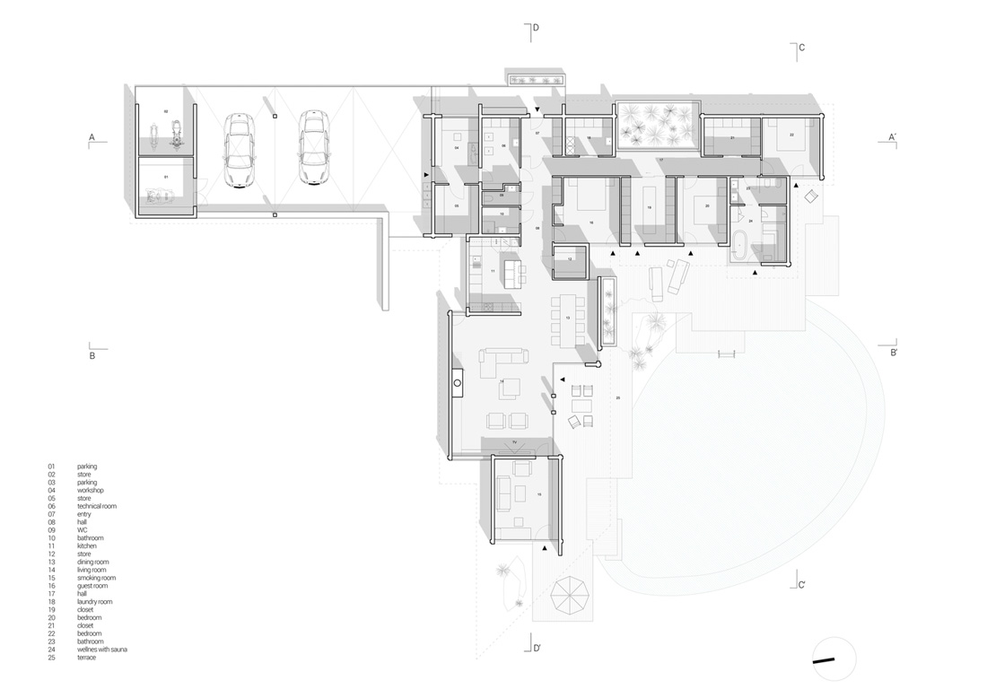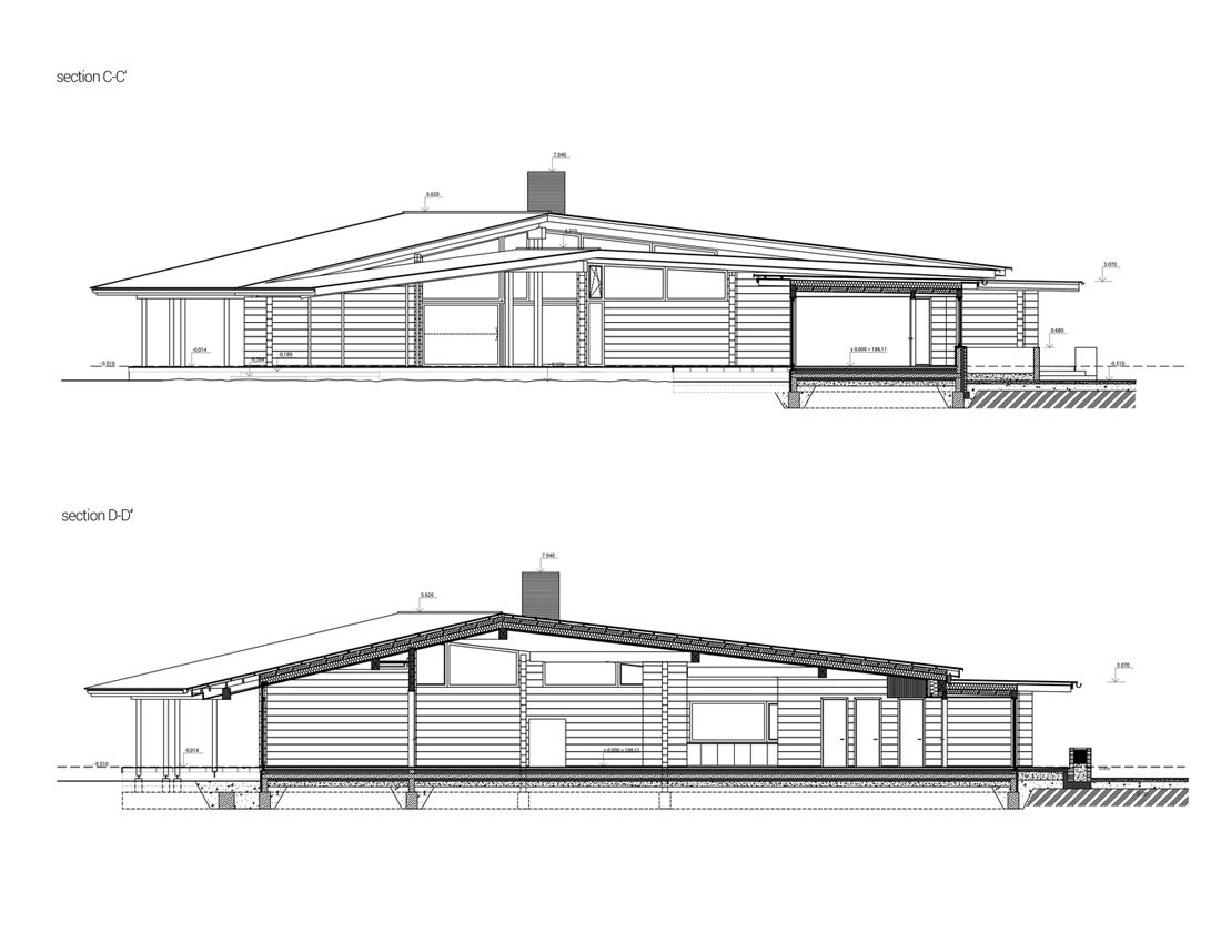这座房子位于地块的中央,它把水包裹了一半,所以这个天然池塘已经成为房子的一部分。木屋是T形的,带有三个功能和品质各异的翅膀。主入口在三个机翼的交叉点。第一部分由服务空间和房间,车库和储藏室组成;第二部分由卧室,更衣室,浴室和洗衣房组成;第三部分包括厨房,餐厅,客厅和书房。