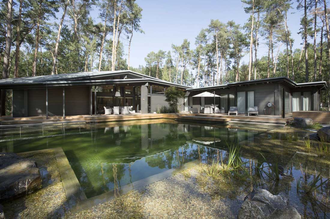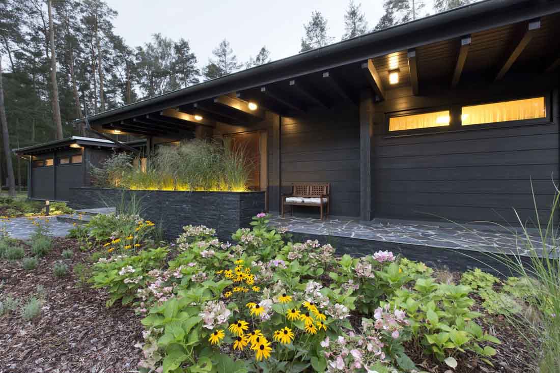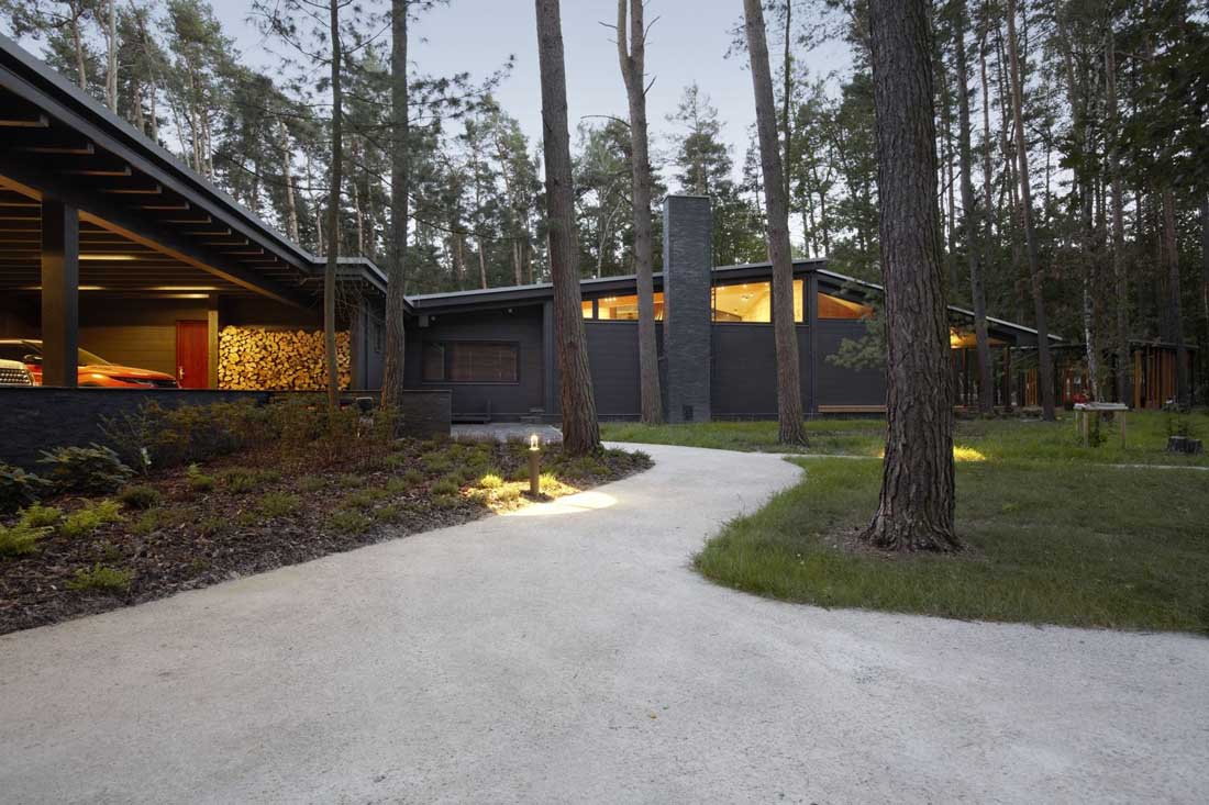 面对街道的立面长47米,但由于其高度,水平度和颜色较低,因此很好地隐藏在森林中。通过与松树的高度形成对比,它很好地融合到了树林中,并优雅地突出了高大的树木的垂直线。后面的垂直部分在水的作用下延伸到场地的中心深处,并且更具动感。它的屋顶坡度更陡,山脊与墙壁成45度角,这赋予了屋顶独特的形状。房屋的外部是种植园和梯田,大部分位于池塘附近。房子的入口处还有两个大花盆。