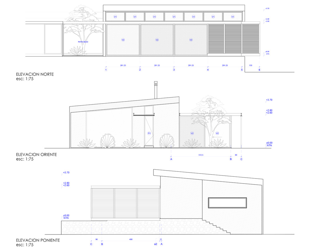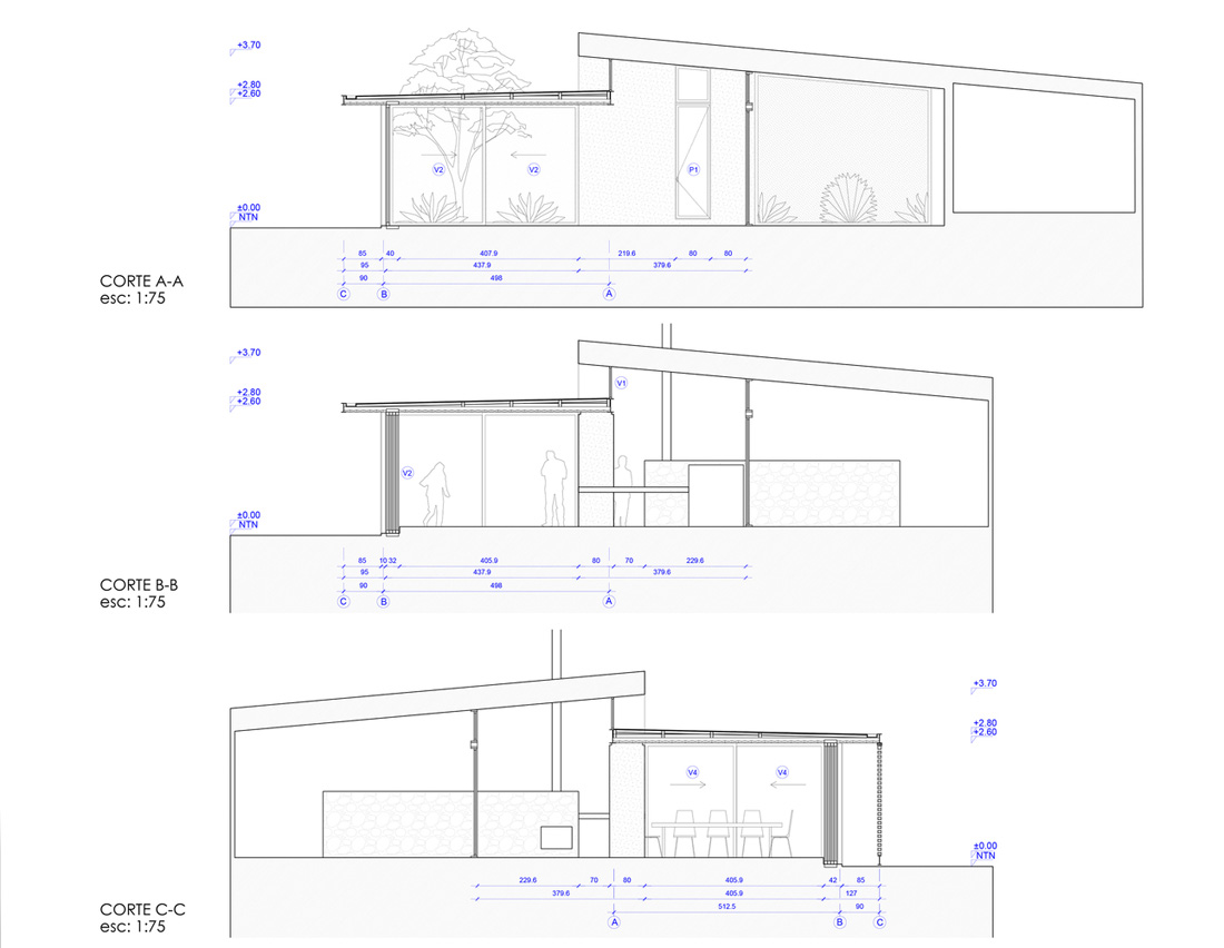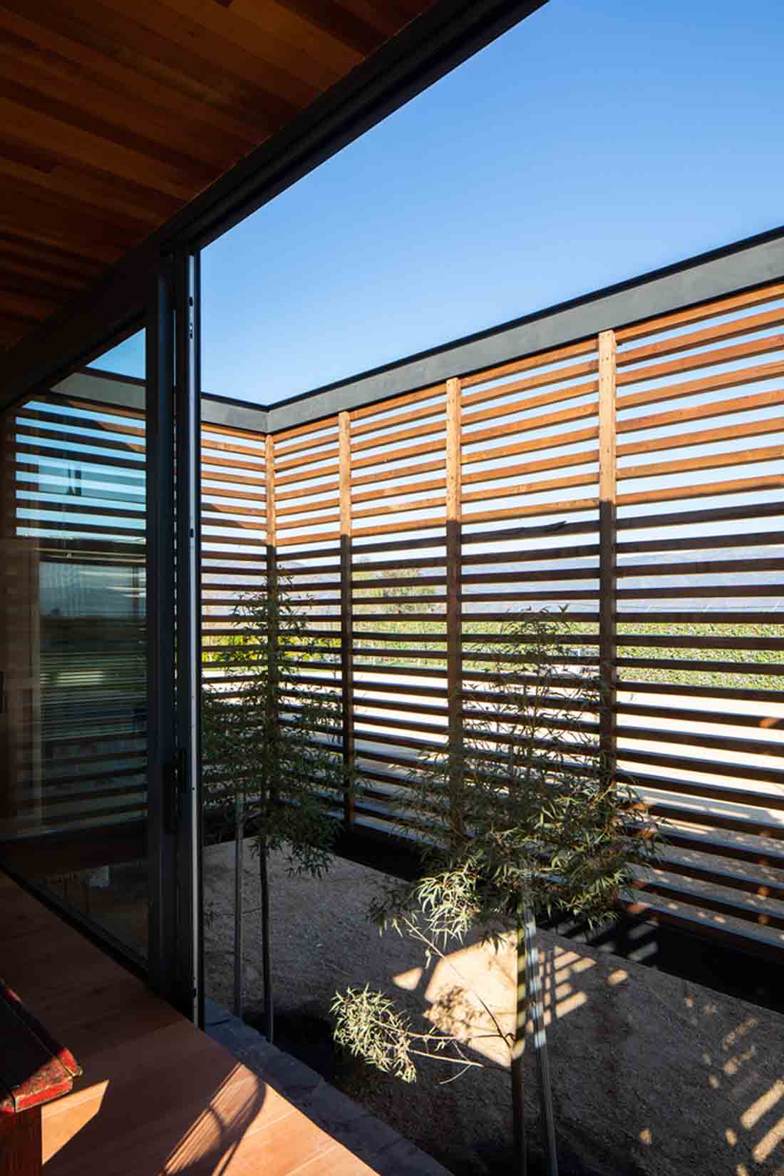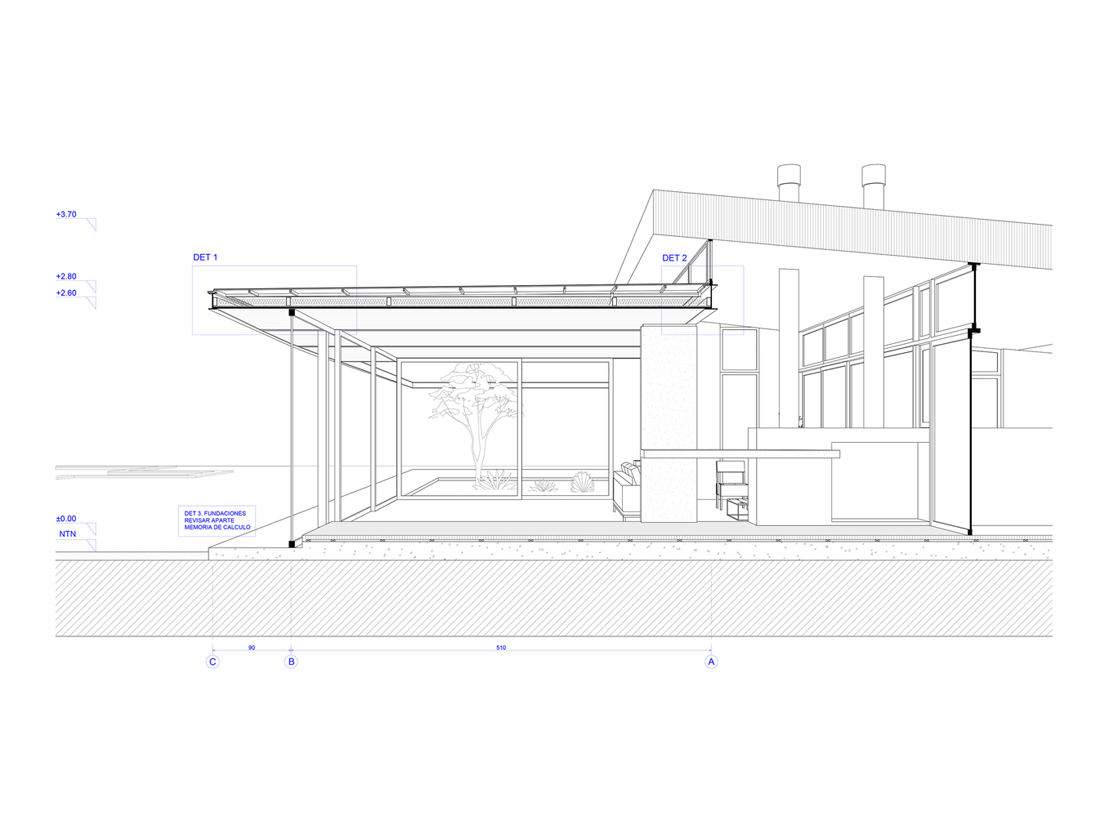 木格子是房子的另一个重要组成部分。这些被用来制作了一个漂浮的主体,并构想了一个向餐厅开放的绿色区域。幕墙可滑动整个项目,控制日光辐射。同时,滑动窗户系统可以使整个项目进入花园,因此可以在冬季聚会中使用。