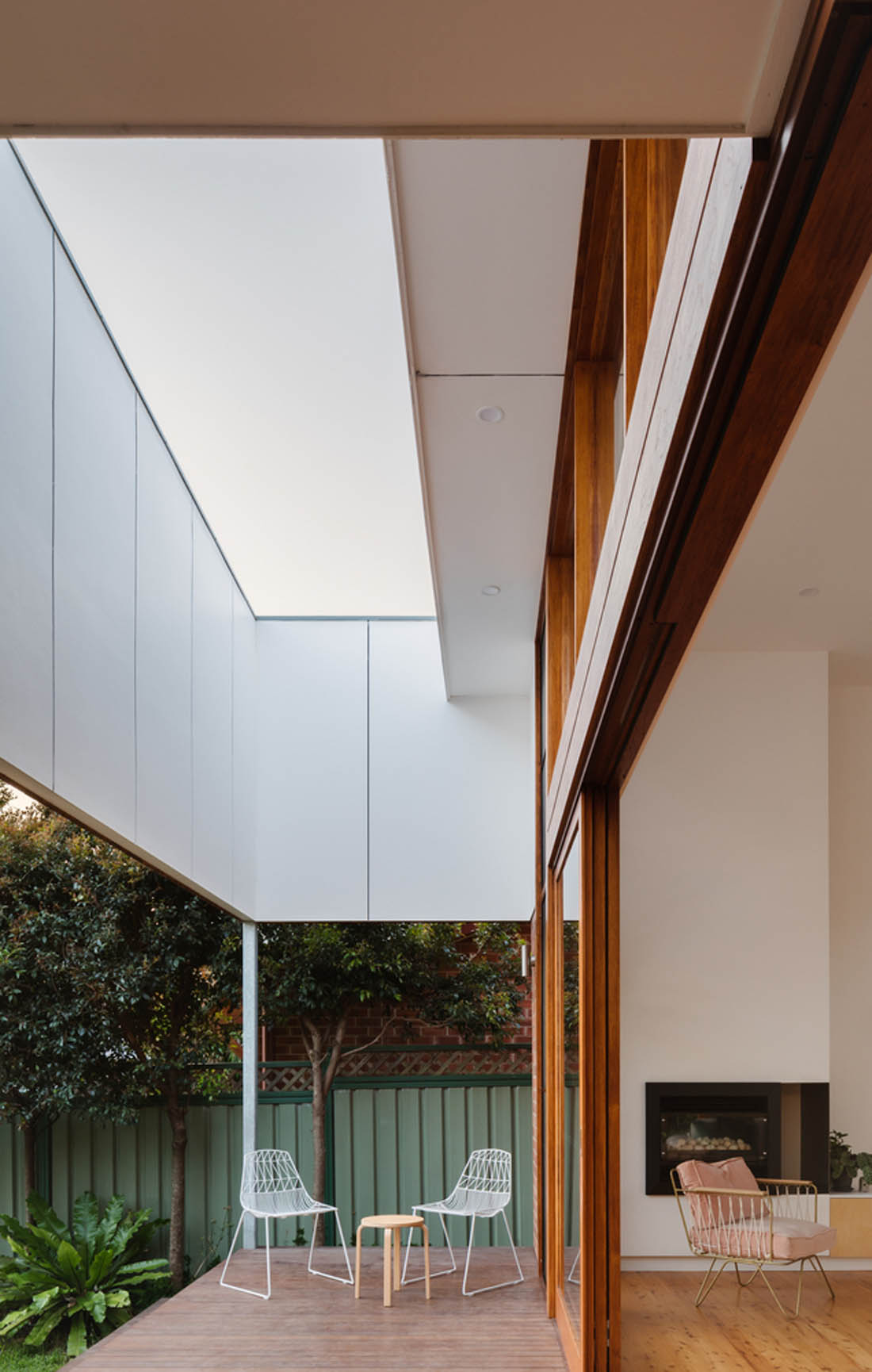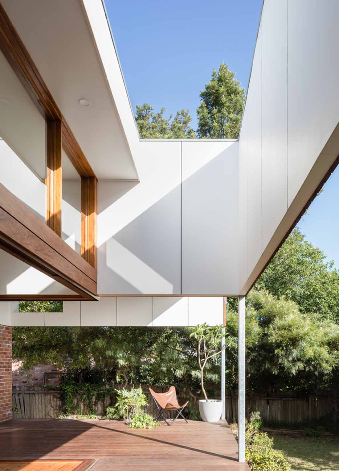 屋顶的造型,随着四季变换能带来各种有趣的光影效果。屋顶上的独特开口,还有助于框取风景和引入微风。这个后方临界区域的新设计,加强了房屋与后院的联系,并且使室内室外有更顺畅的过渡衔接。