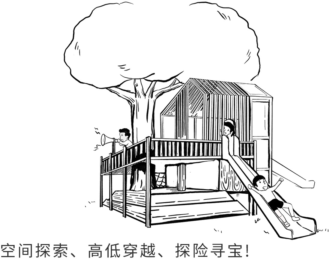 有别于常规项目, “儿童自然模块”是通过观察孩子们对同一模块中不同设计手法及材料的使用程度,来观察研究该模块的设计方向。比如,沙坑模块使用了一般沙坑的黄沙,白沙,黑色卵石,木屑,细砾石五种沙坑材料进行实验,看看孩子们更喜欢哪种材质的沙坑;而在钻筒模块中,针对攀爬,穿越,匿藏等空间需求,分别设计了多个体量近似,又略有不同玩法的“坡”;每一个孩子心中都藏着一座梦想的树屋,在这里可以和小伙伴们躲迷藏、高低穿越、探险寻宝,在这里有一处属于自己的秘密基地。