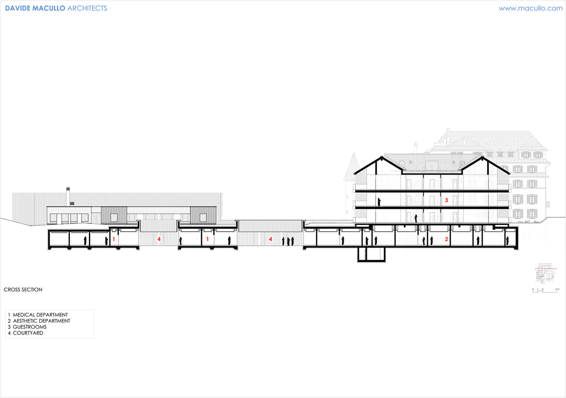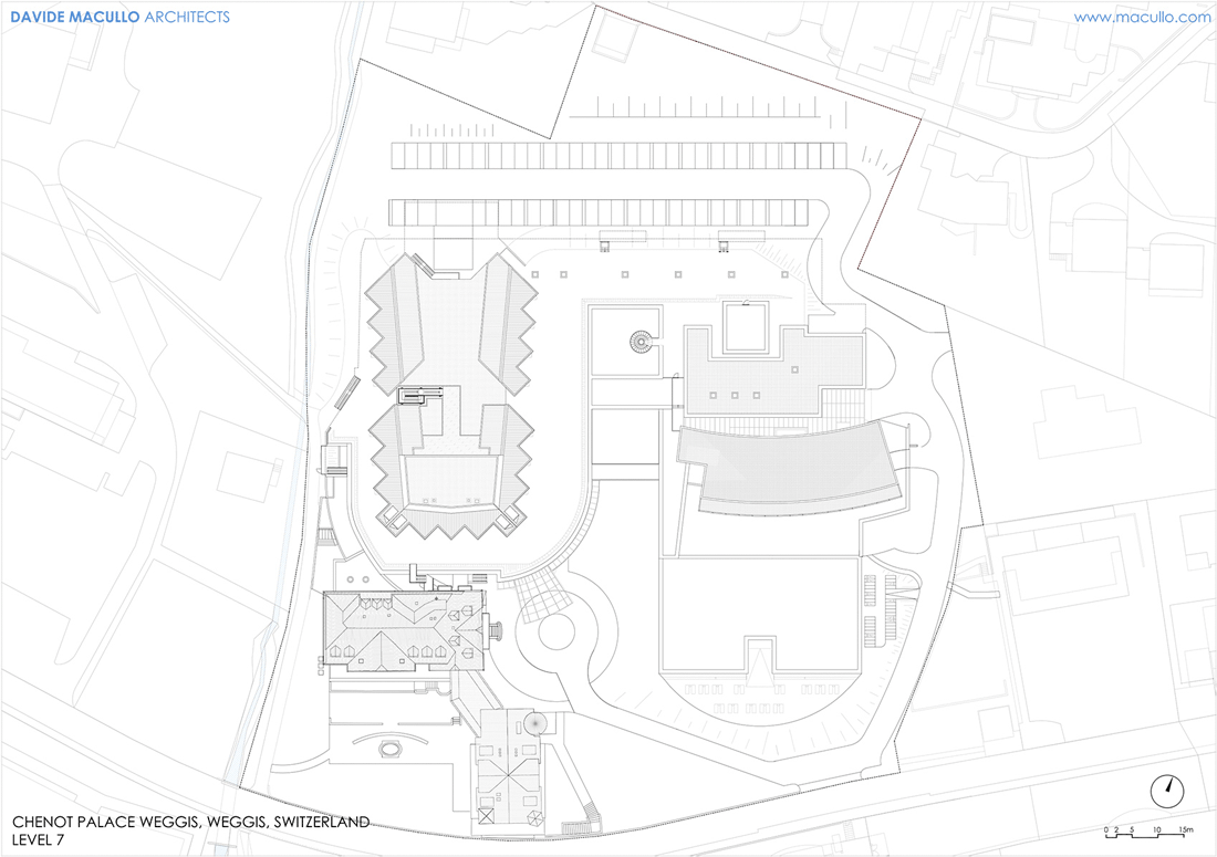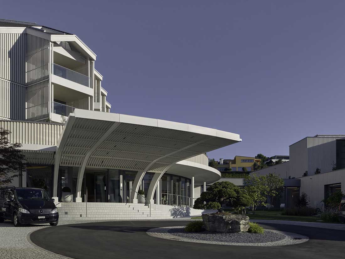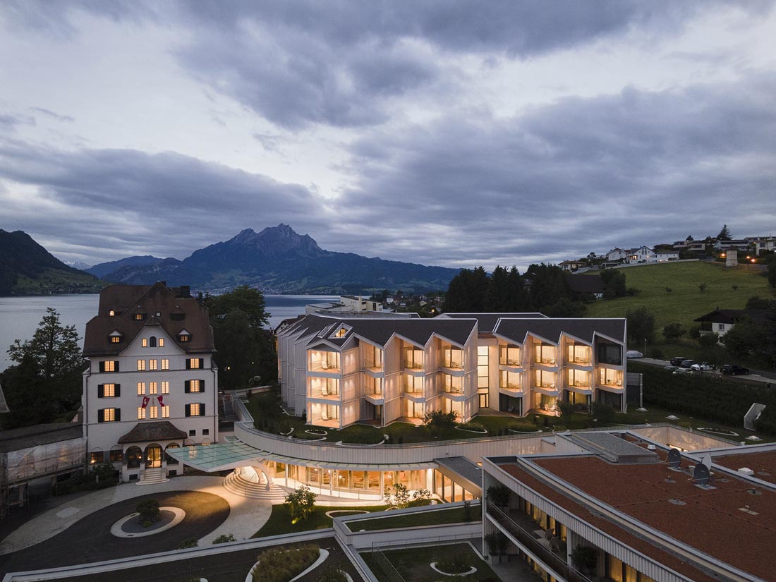 酒店的占地面积超过2万平方米,是基于原有酒店改造而来,并增加了一座新的客房建筑,以及一座设施先进的医学水疗健康中心。项目的介入手法敏感而克制,谨慎地考虑了周围的自然环境。东面区域的建筑群在尺度上进行了缩减,以便更好地与村庄外沿的住宅区肌理形成对话。西面的区域朝向湖畔,酒店原始的经典外观被保留下来,并通过从视觉上削减新建筑的体量和设计语言的复杂性得到进一步强调。从湖边望向酒店时,其外观与原先并无二致;新的客房建筑被后移至酒店入口上方,错落的体量从不同的角度看均是一幅独一无二的画面。