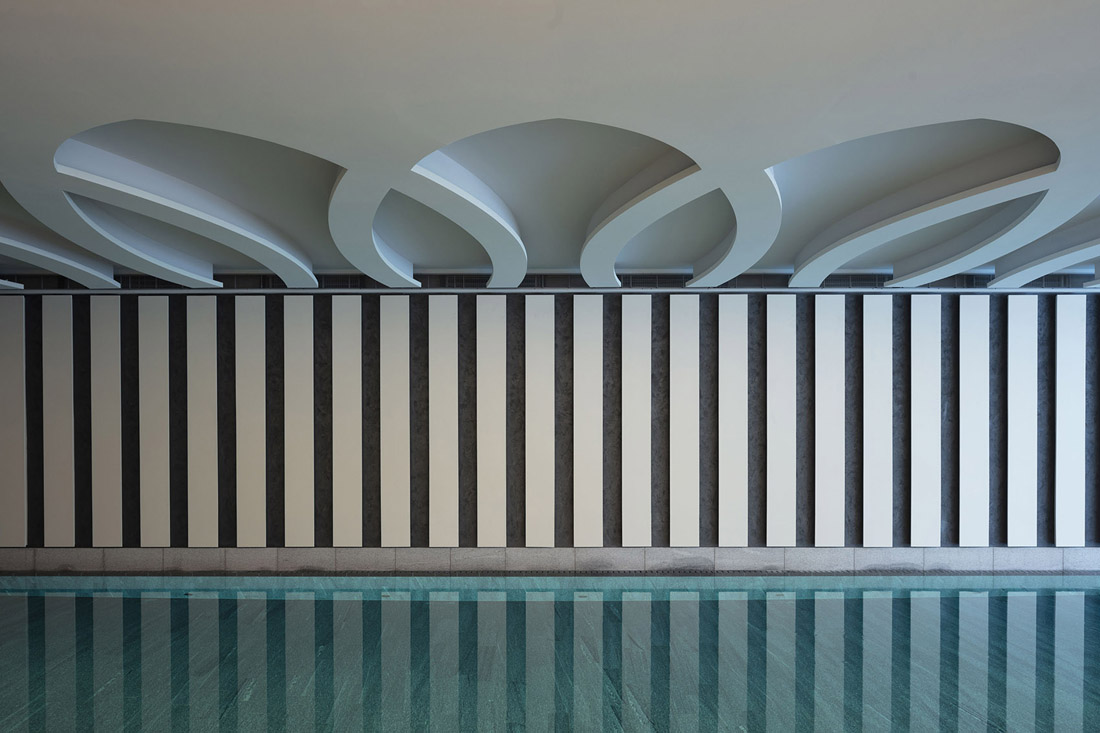水疗中心所在的建筑被花园掩埋,唯一能够提示其内部空间的线索是一系列盆栽庭院。水疗区和水池与酒店新楼的木制饰面之间形成了光影的互动,并在葱郁的花园中形成肌理显著的景观。旧建筑与新元素的统一主要体现在形式与材料上的简洁感,确保不会对客人的感官体验造成干扰。新建筑的设计延续了既有建筑的品质,重新找回了当地建筑的尺度与特征,并通过现代的手法,将有机与几何形式融入到和谐统一的观感之中。