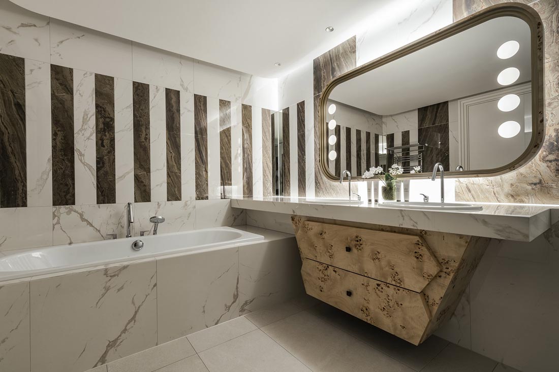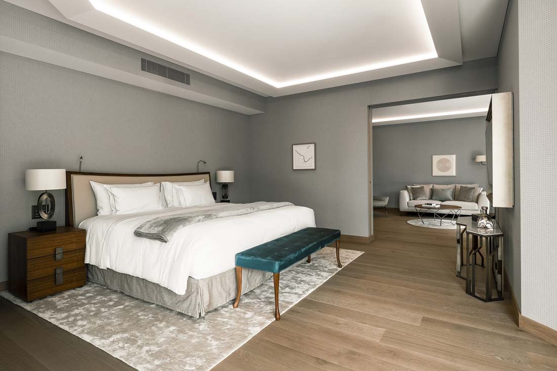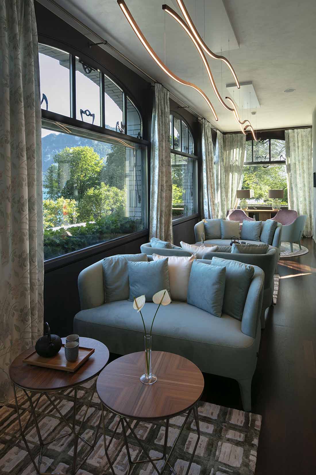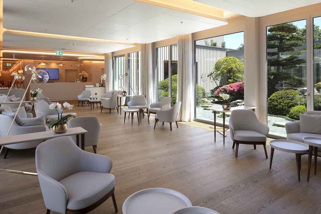 酒店内部的空间借助形式、色彩和光线的变化在私密程度不同的环境之间形成自然的过渡,让客人得以慢慢地走向最远处的景致,沿着湖泊体验阿尔卑斯山那足以净化人心的美。在进入建筑时,人们将置身于一个更加人性化的尺度之中:从花园的自然环境走到宽敞的接待区域,随即感受到盆栽庭院所带来的宁静而充满情致的美。这种微妙的流动性将人们从开阔的山景带入私密而温馨的内部空间,丰富的感官刺激将拉长人们对时间的感知。