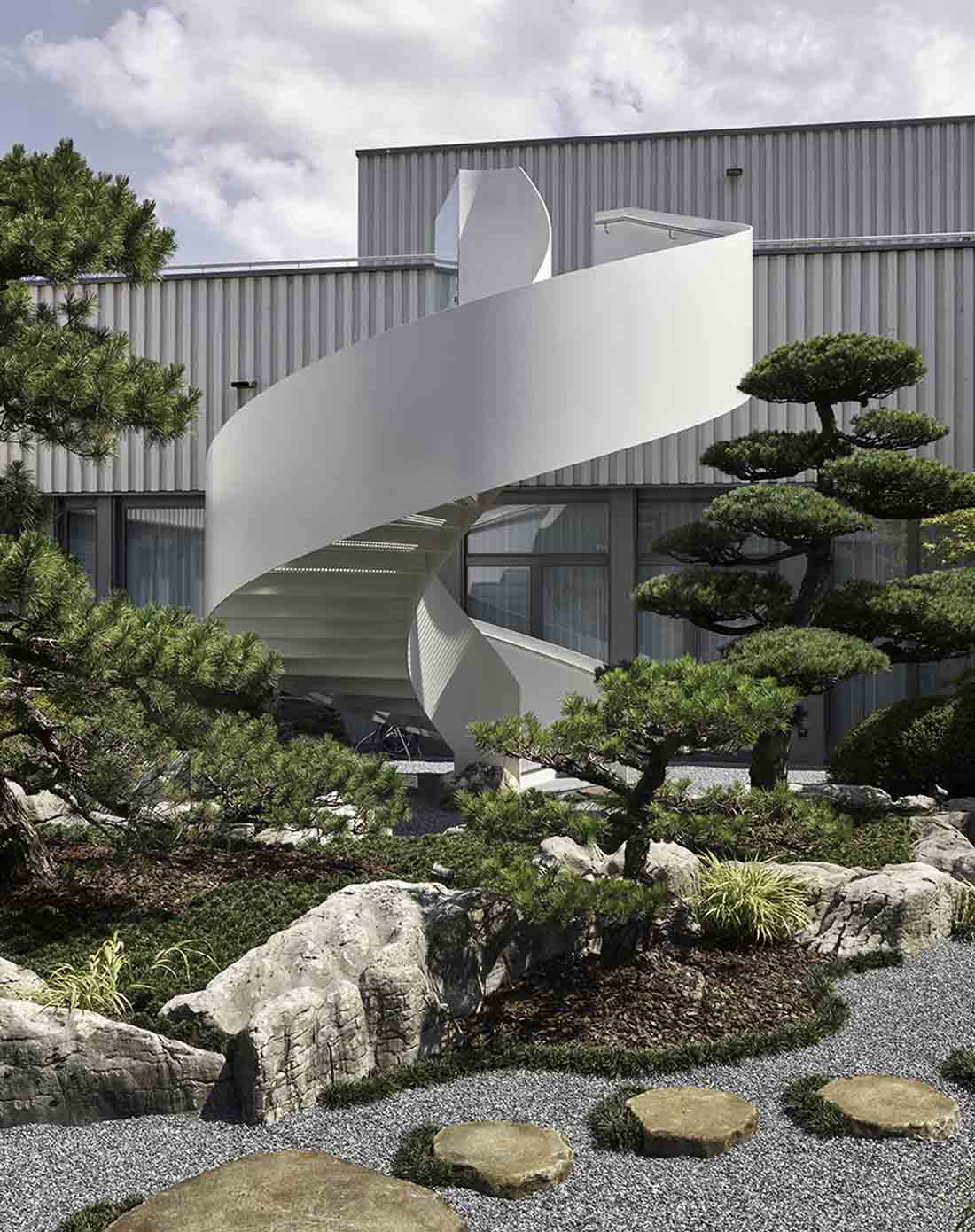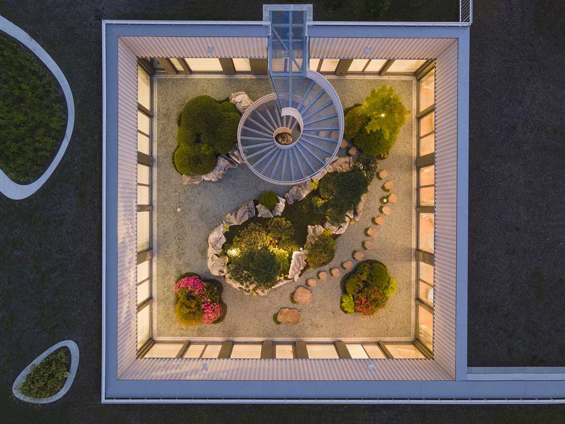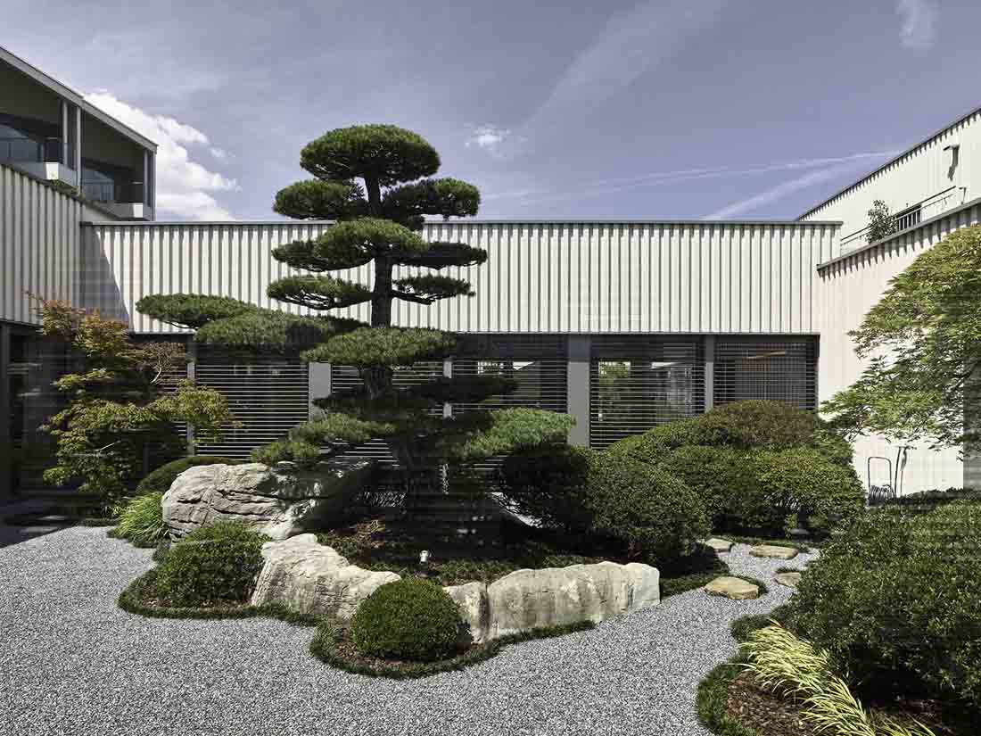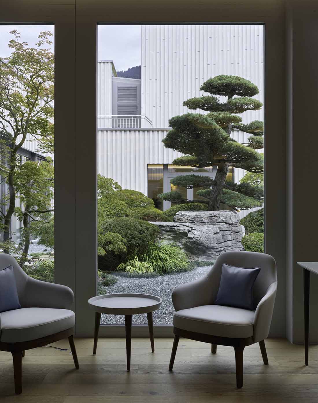 每间客房都享有湖景,使客人随时与自然互动,将自身与开阔的湖面以及更远处的阿尔卑斯山环境联系起来。另一方面,在向内部看时,客人又可以在盆景庭院和花园的微观世界中找到另一种更加亲切的自然景观,从而始终保持一种轻松自在的状态。
