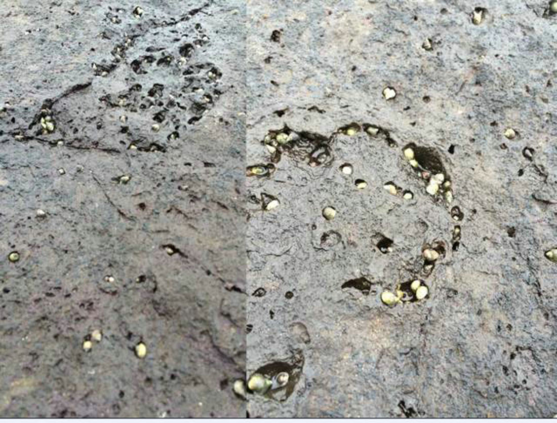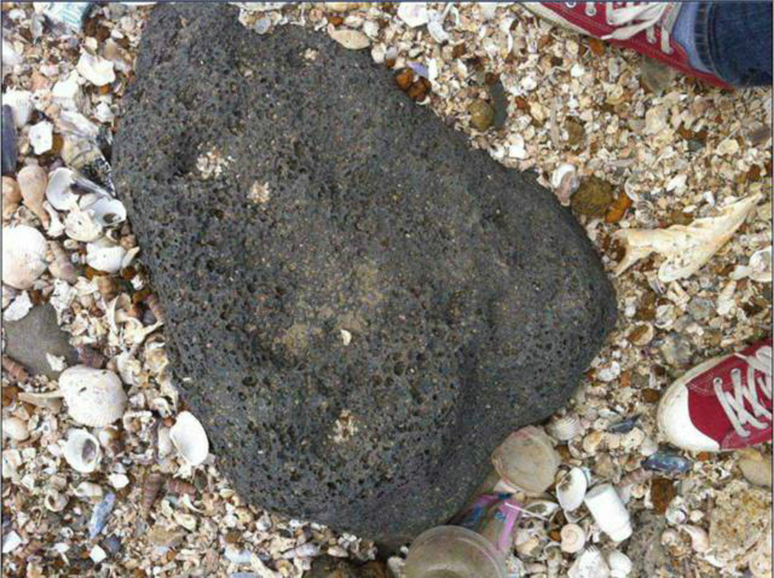 这里想到一个问题,一个叫做打洞的问题。每个人,每个动物、植物都是跟这种打洞的行为有关系。简单来说,古代就有各种各样的行为,包括自然界的各种各样的行为,各种各样的动物、植物,也会制造这种洞穴,(图片上)这块岩石是我在海边拍的,上面有各种的孔洞,可能是火山爆发,岩石会有这样的密密麻麻的孔洞。但事实上在海边的人会发现在这个岩石上有很多的裸体,长年累月地侵蚀这个岩石。