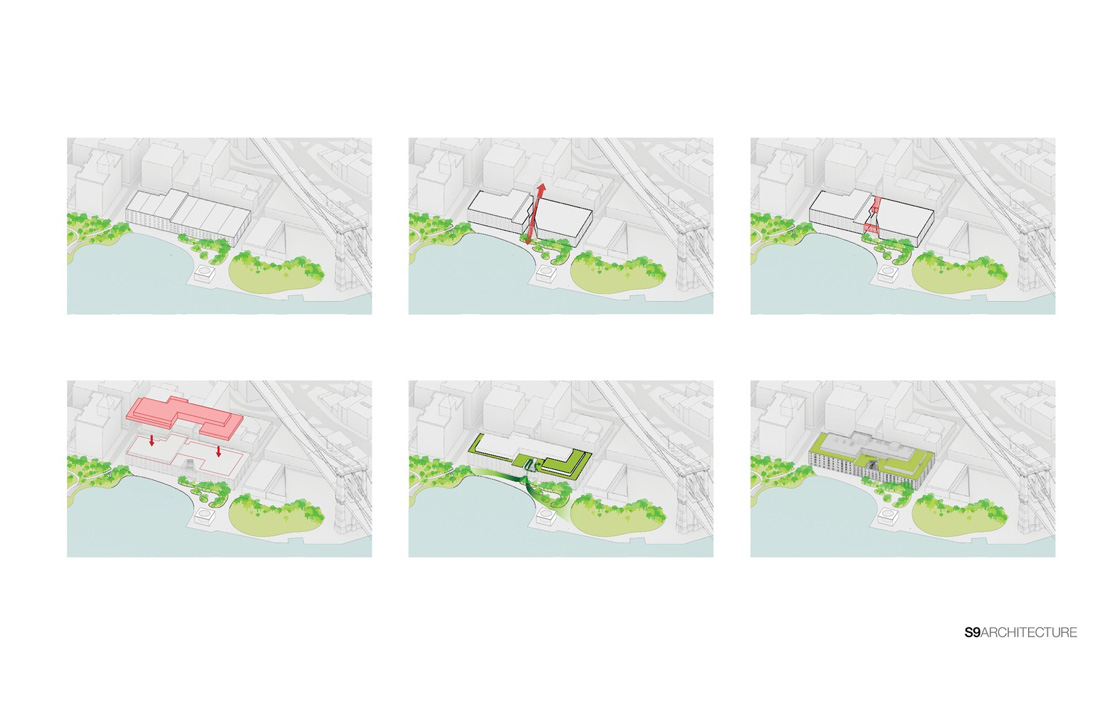 建筑方案将这个曾经是社区和公园之间的一道屏障的大体量建筑,改造成连接两个区域的门户。从砌体结构中雕刻出的一条通道在街道和水岸之间创造了人行路。隐藏在建筑中心的四层露天庭院为大厦租户、社区成员及公园访客提供沉浸式的公共空间。