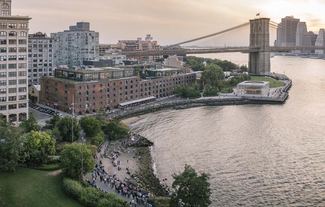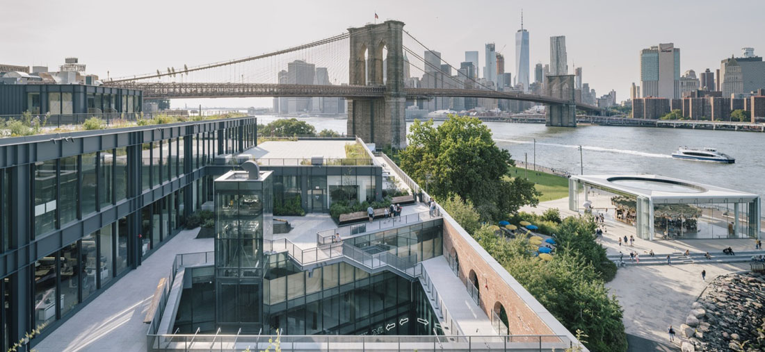 屋顶被改造成可以从庭院进入的景观公共平台,布鲁克林大桥公园被有机地延伸到建筑中。这个空间,可以欣赏到布鲁克林大桥和曼哈顿天际线的标志性景观,并增添了餐厅和啤酒花园等娱乐设施。