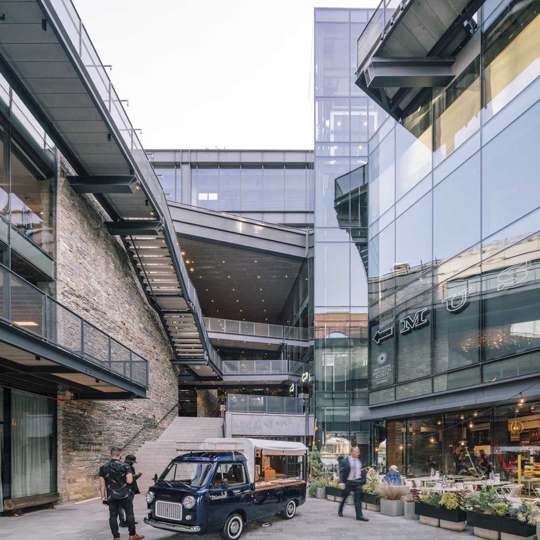 玻璃幕墙线性地划分了庭院,融合了当代和历史并使建筑的条理清晰可见:一层是公共美食庭院,二层是布鲁克林历史学会的画廊,上面是多层开放办公空间。