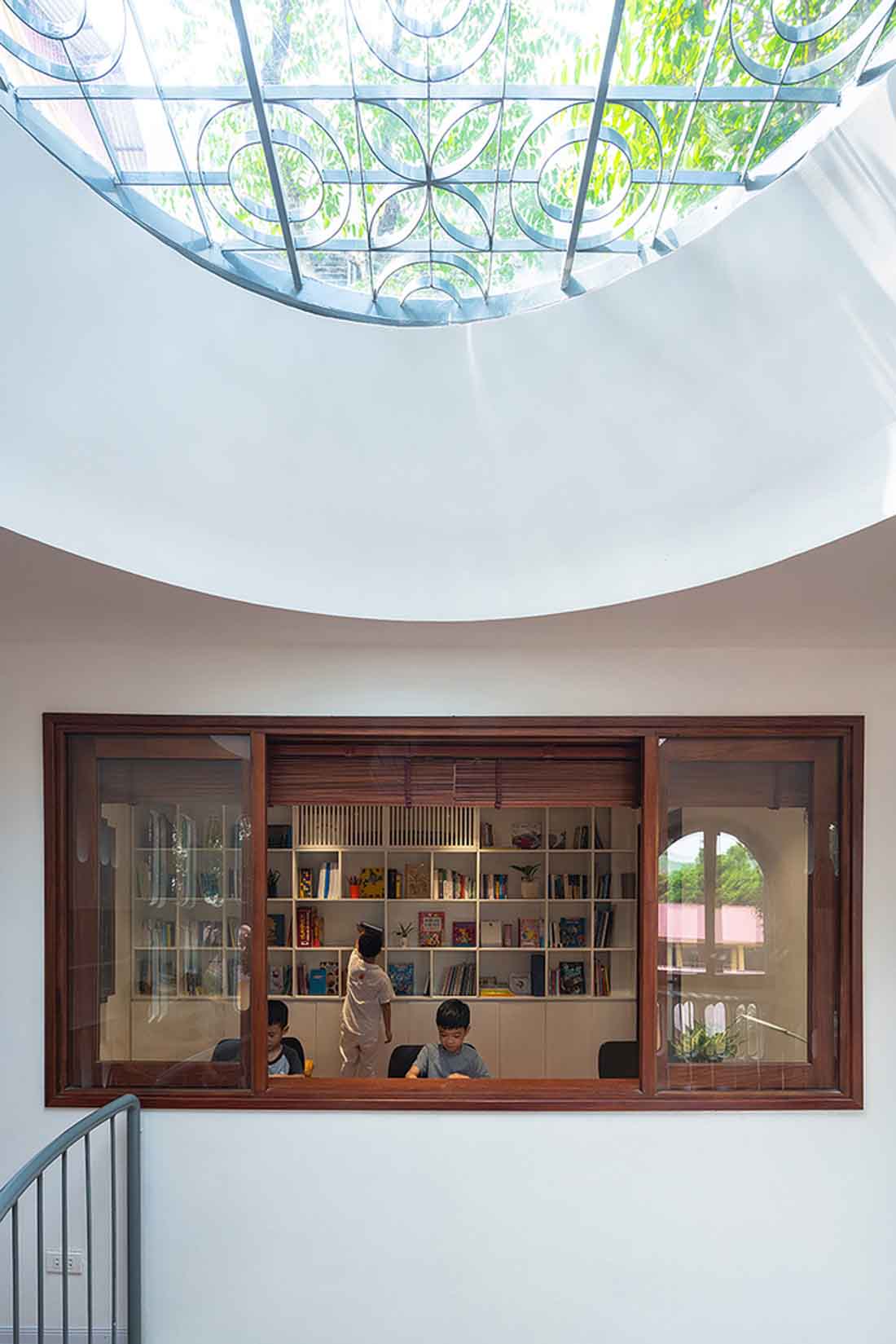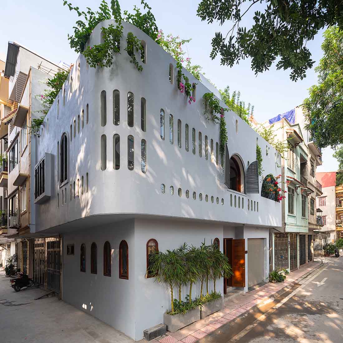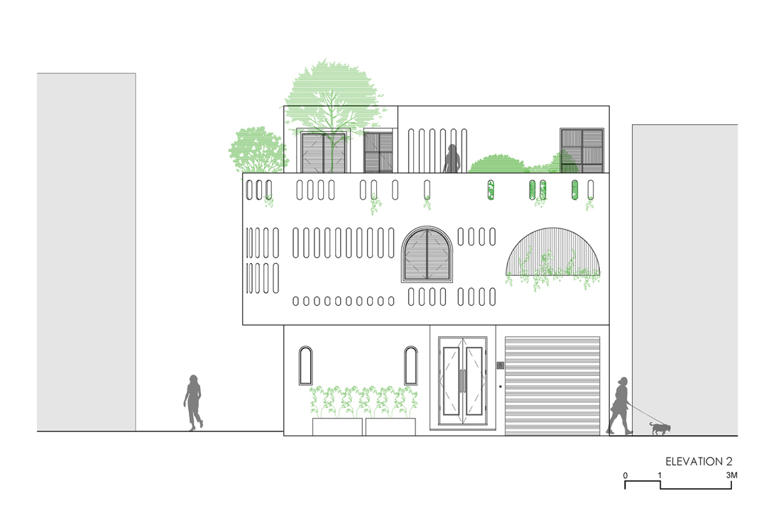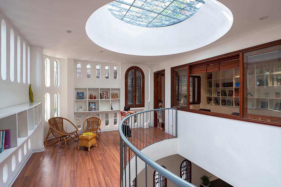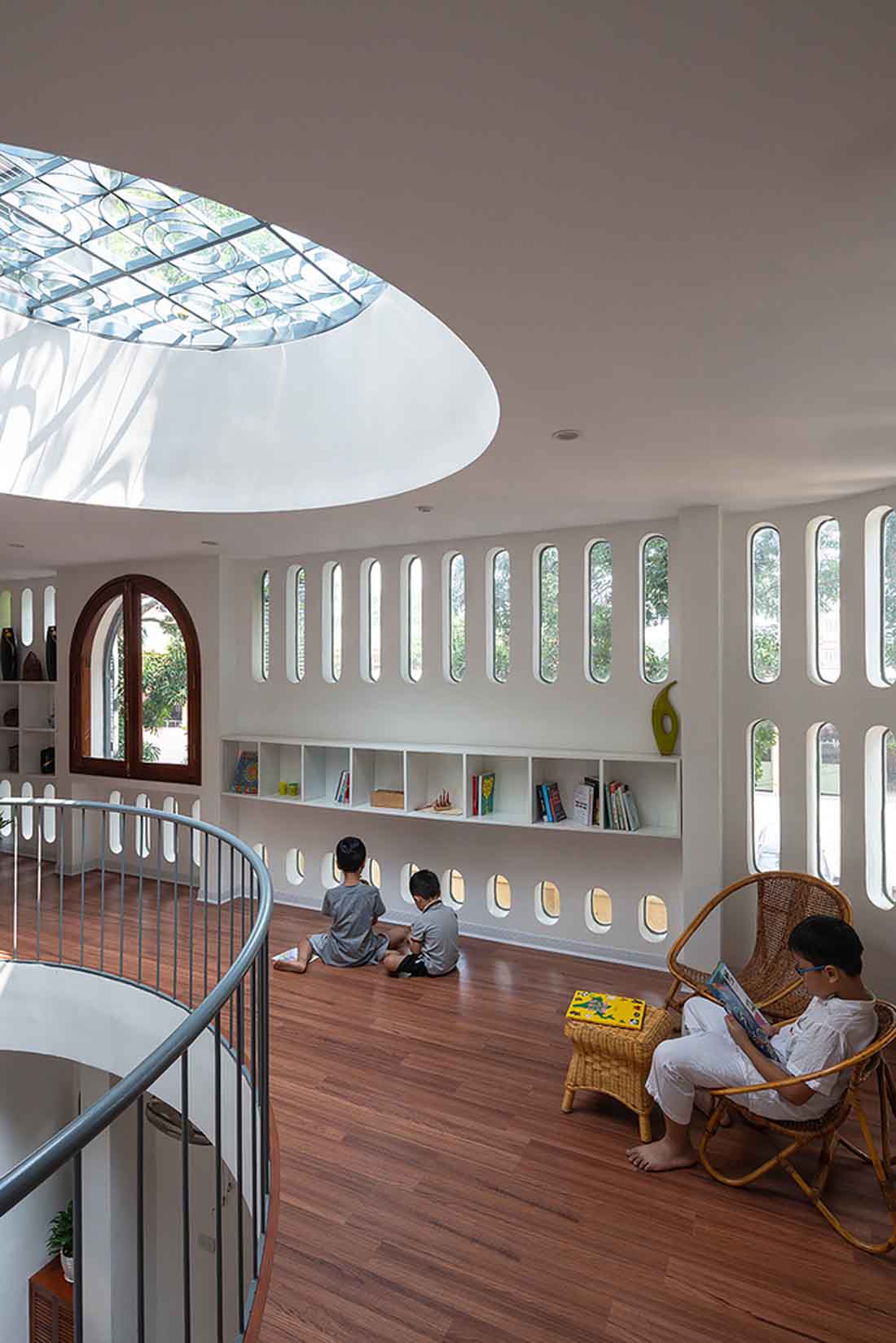交互公共空间,椭圆形开孔立面设计,自然光与自然通风,以及周围的绿色环境。花园住宅的核心在于创建一个像是图书馆的公共空间,房子里充满自然光与绿植,人们可以在其中一同工作学习,引发许多互动。房子坐落在越南河内市龙边郡的一个街角,屋主是对年轻夫妇带着两个小孩。