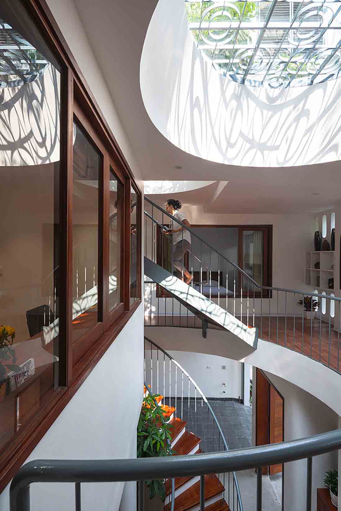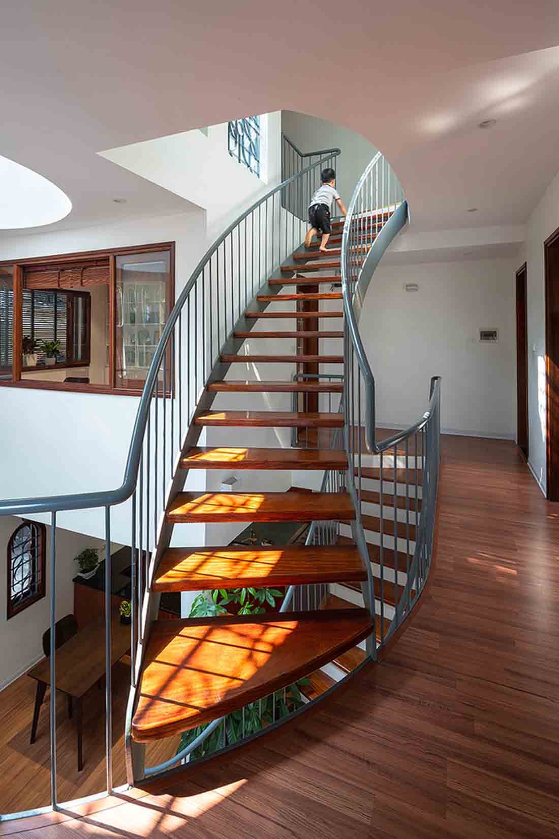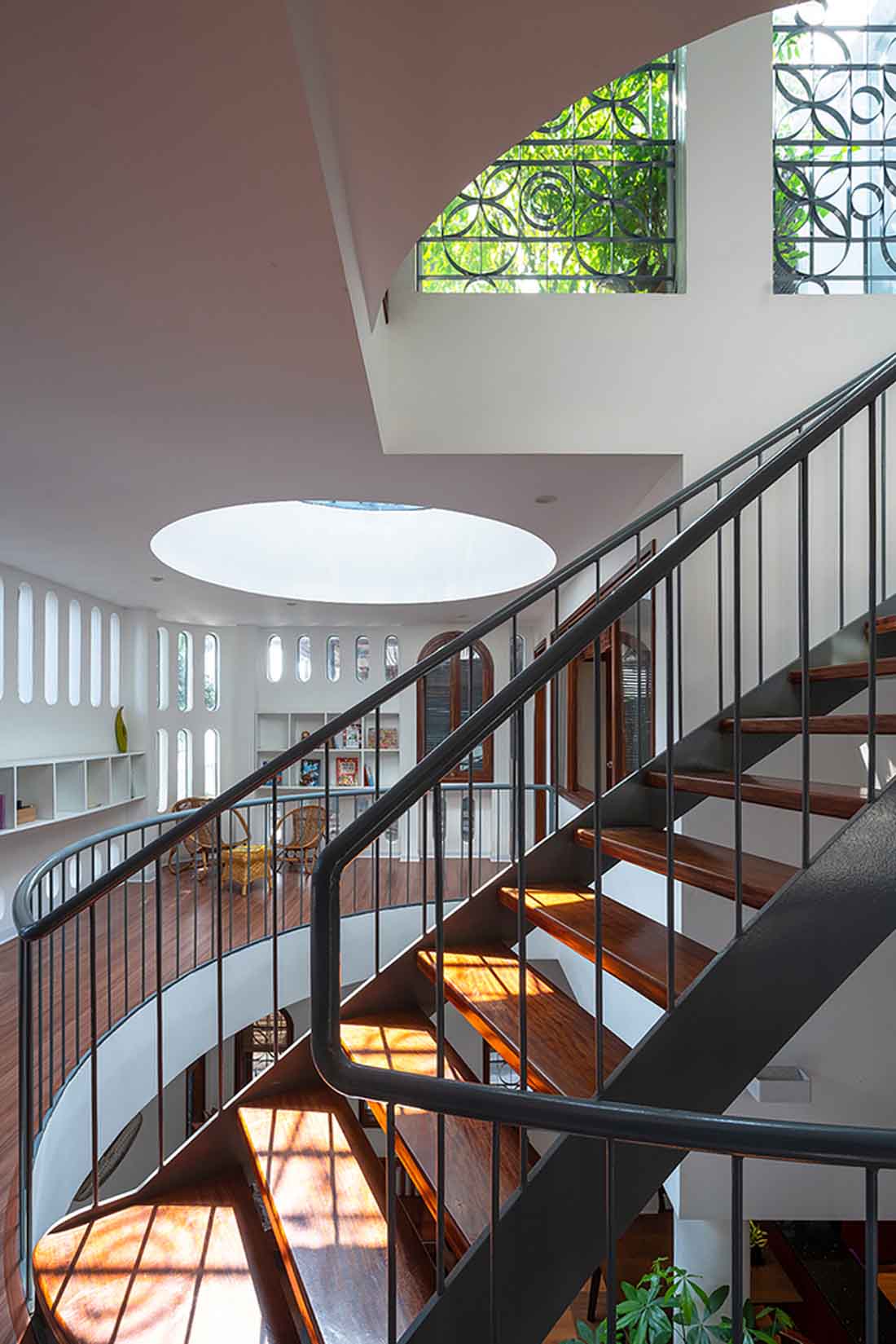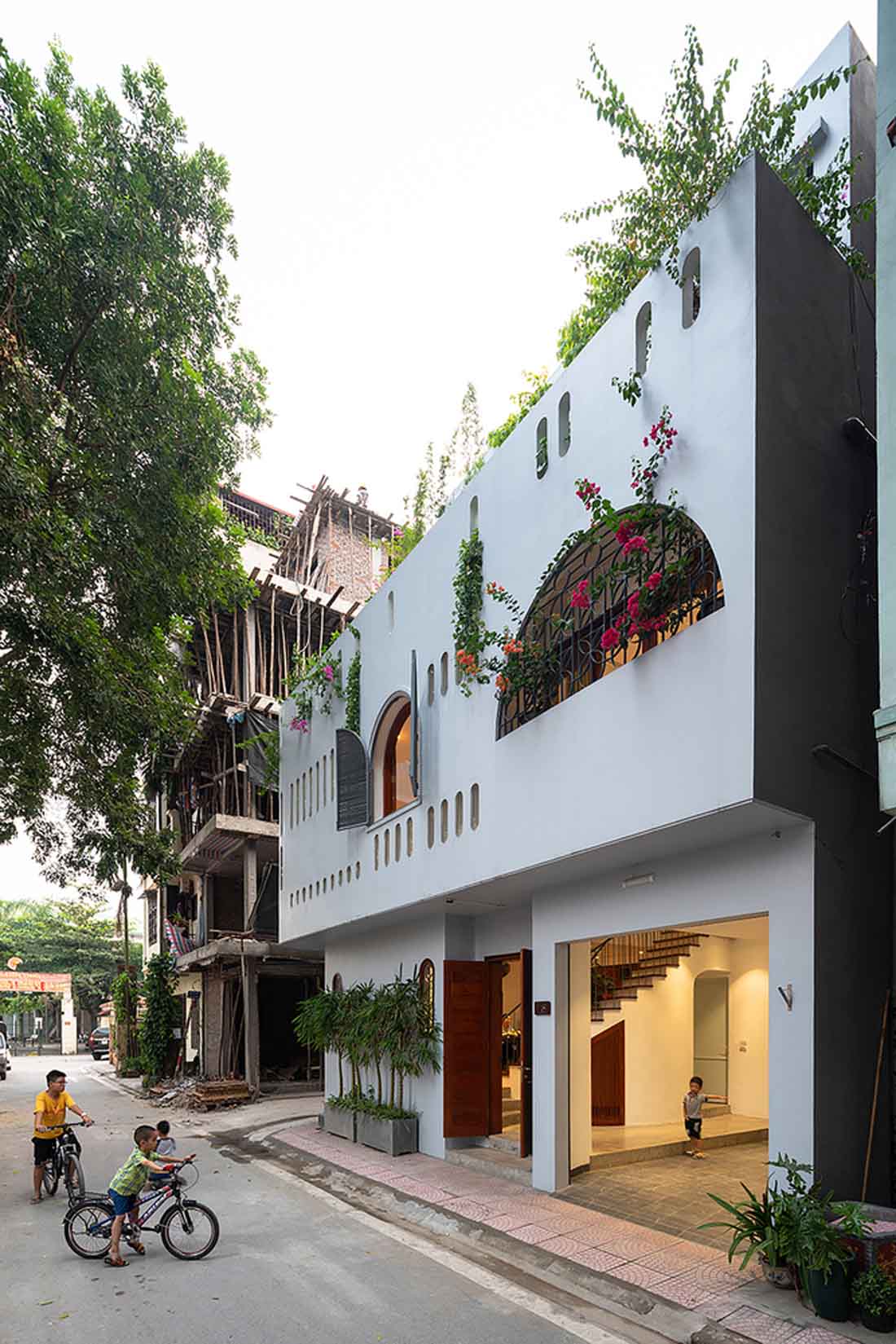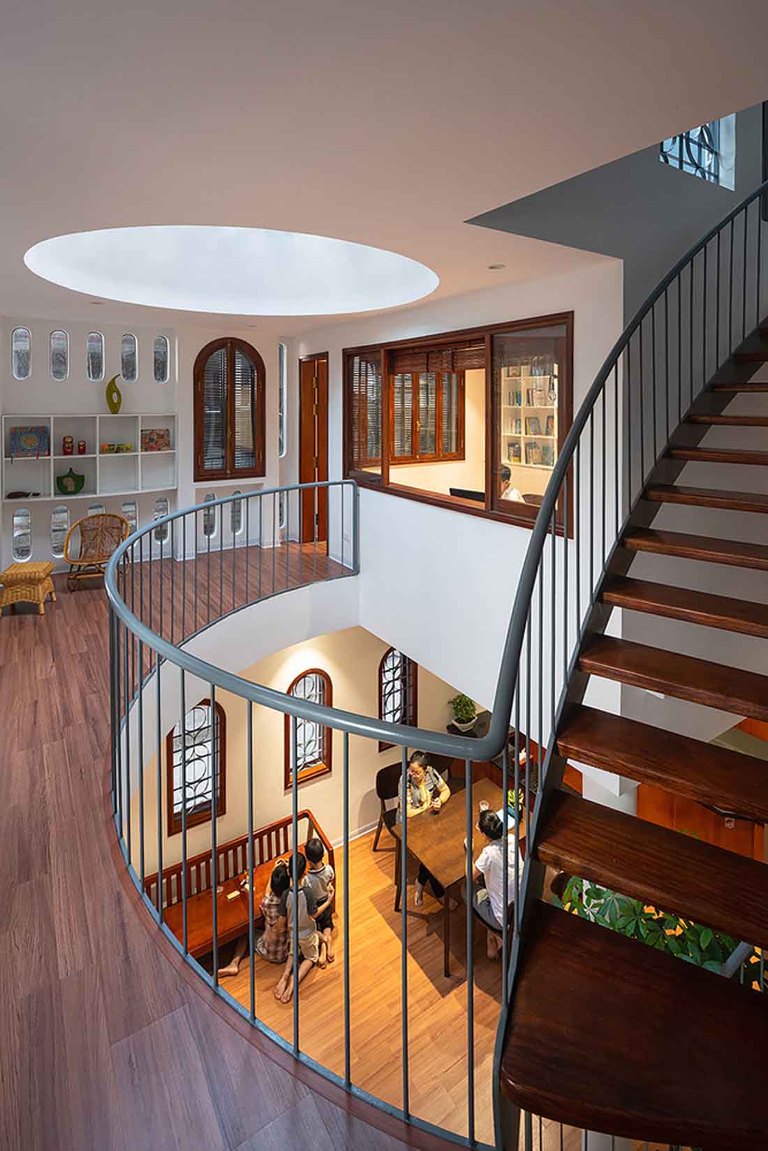 交互公共空间,椭圆形开孔立面设计,自然光与自然通风,以及周围的绿色环境。花园住宅的核心在于创建一个像是图书馆的公共空间,房子里充满自然光与绿植,人们可以在其中一同工作学习,引发许多互动。房子坐落在越南河内市龙边郡的一个街角,屋主是对年轻夫妇带着两个小孩。
