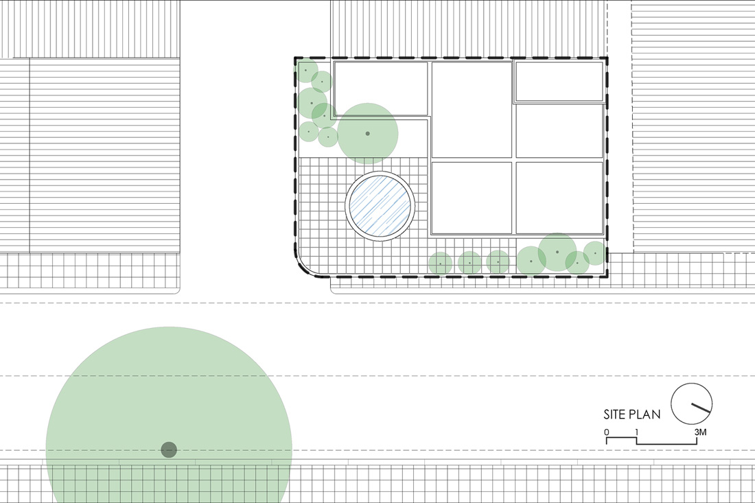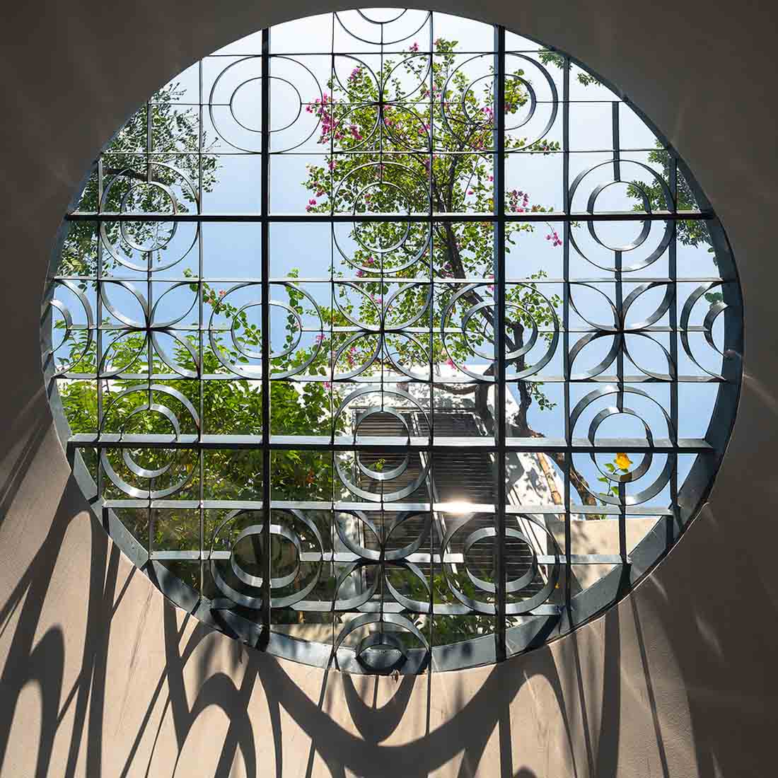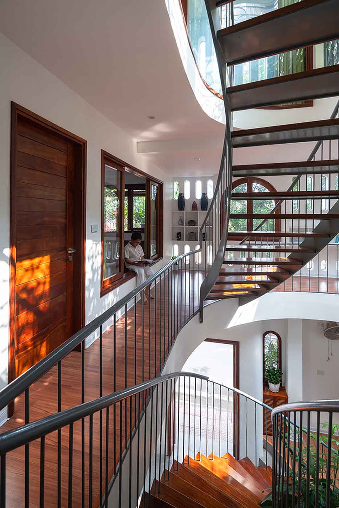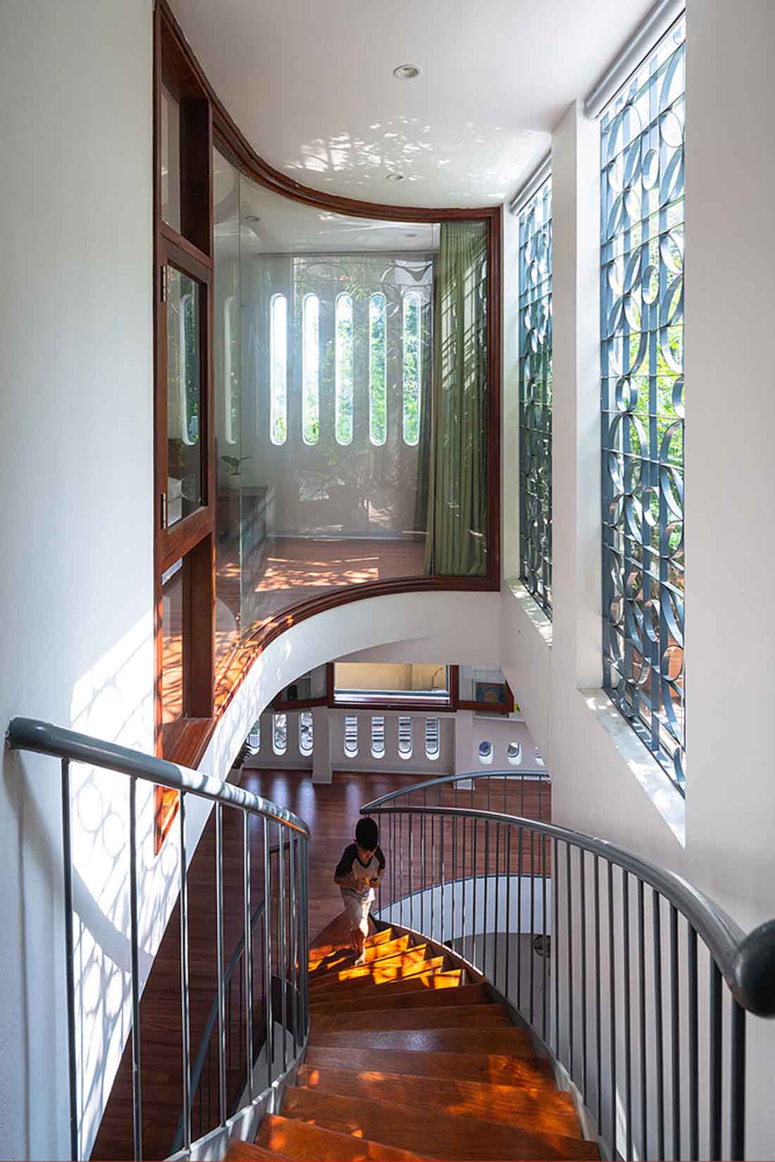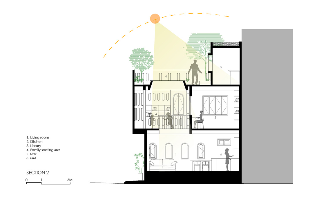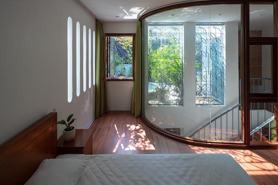 交互公共空间,椭圆形开孔立面设计,自然光与自然通风,以及周围的绿色环境。花园住宅的核心在于创建一个像是图书馆的公共空间,房子里充满自然光与绿植,人们可以在其中一同工作学习,引发许多互动。房子坐落在越南河内市龙边郡的一个街角,屋主是对年轻夫妇带着两个小孩。
