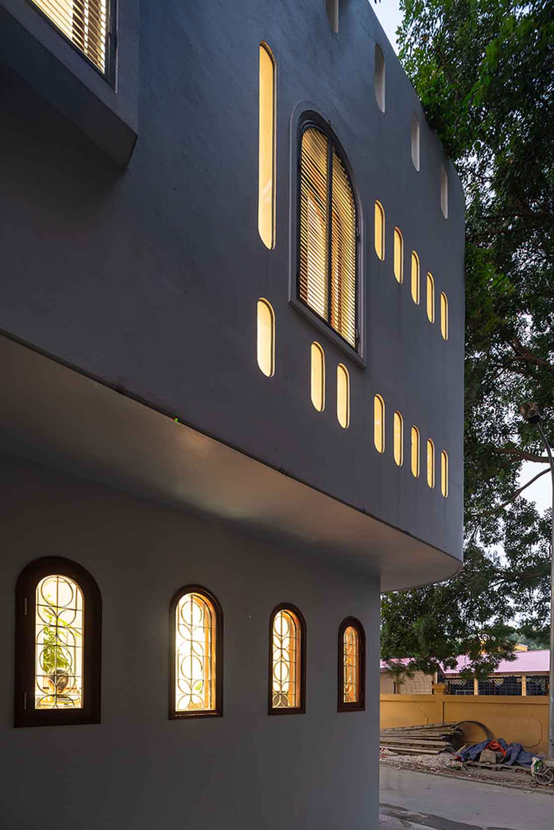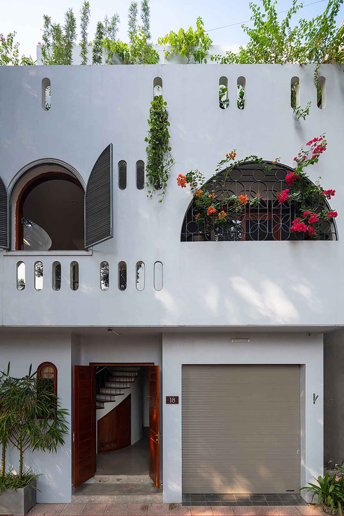 二楼和三楼的卧室朝着绿意盎然的阳台和屋顶花园,所以空间中总是充满新鲜空气。屋主享受照料屋顶的花园,那里也有助于保护房子不受阳光直射。建筑外立面设计了许多椭圆形的洞口,让自然光进入的同时保持了屋子的安全性。傍晚从屋子里发出的亮光和阳台还有天台花园上探出的绿植使得街角更加温暖、生动。