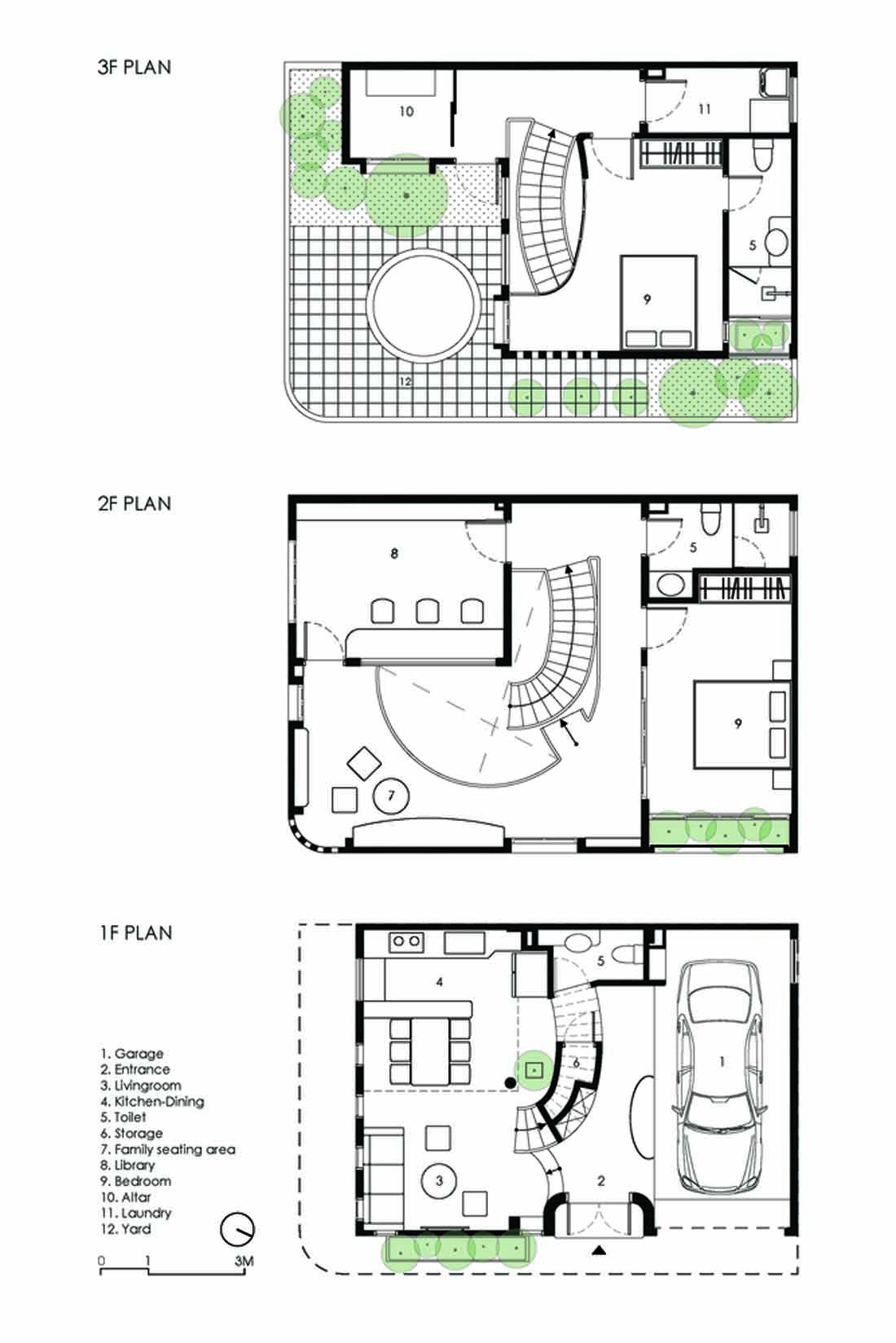 家具和书柜沿着环形流线摆放,在屋子里就像座小图书馆一样,人们可以选择在哪儿学习、工作、或是翻阅喜欢的书籍。家长在桌前工作的同时也可以照顾孩子。通过在二楼留出空口并在上房置入圆形天窗,整座建筑便布满了自然光与来自周围的绿意。3层楼都被空口连接了起来,促进屋内的交流互动。餐厅位于一楼,自然光可以通过空口从天窗照下。
