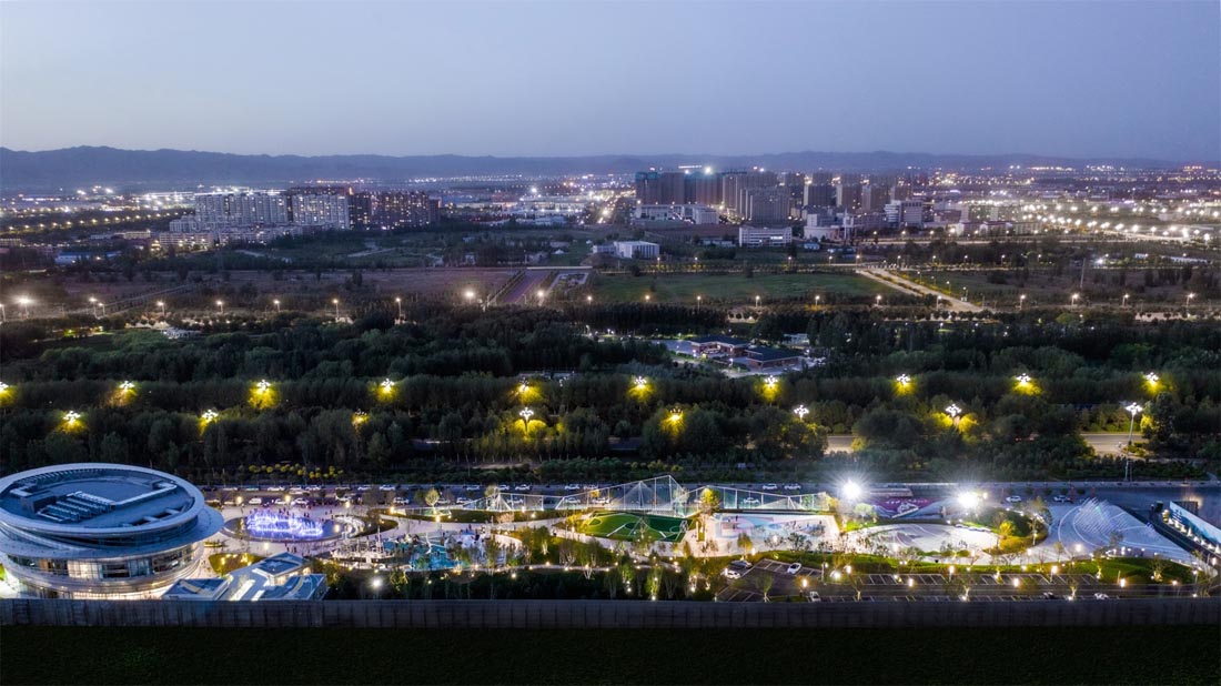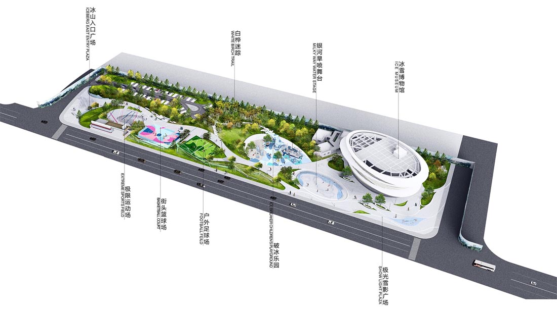 设计师将地形的塑造将使场地更加立体,丰富主次动线行进体验的同时,也提供给初入场地的人们一个透过白桦林俯瞰全景的“眺望台”。在功能设置上,极限运动场、篮球场和小型足球场的灵活布局可强化公园户外运动的全域概念。而面向聚揽人气的亲子客群,设计考虑在毗邻冰雪博物馆侧融合隆起的地形中嵌入一处约800m²的“半谷地”,打造一个主题为极地科考的儿童活动区。在公园的主入口,设计构想了一座极具冰雪特色、同时结合参与性的主题雕塑,以增强场地的吸引力和昭示性。