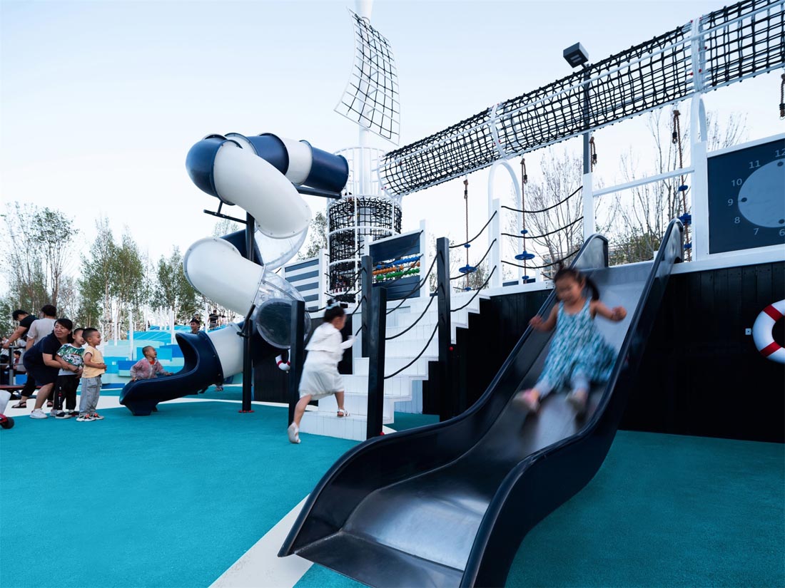 设计师在这里模拟了一艘停靠在浮冰之中的巨大破冰科考船、白沙滩岸边照亮四周的灯塔、可藏和钻的极地洞穴群、拾级而上的“冰岩桥”、沙滩里的玩沙游具和坡地上的冰雪攀岩…共同为孩子们营造了一场关于探索冰雪极地风貌的科考旅程和玩乐体验。