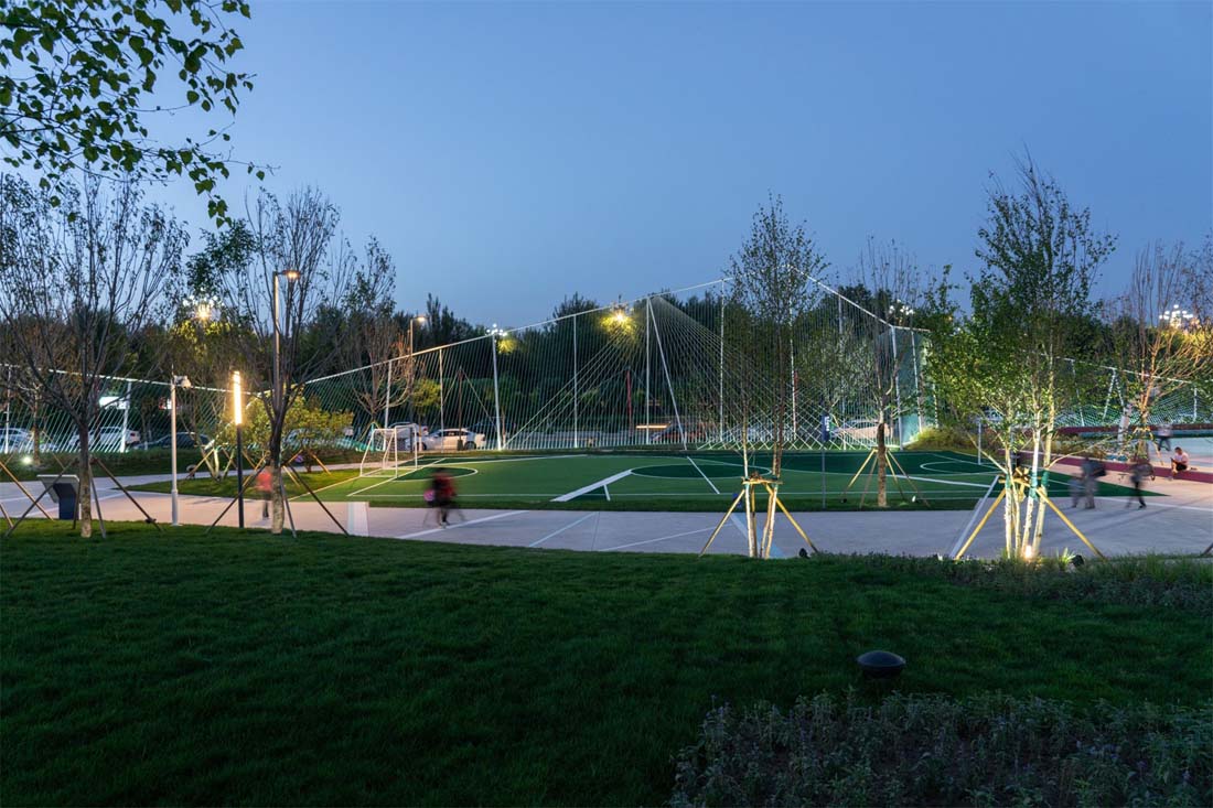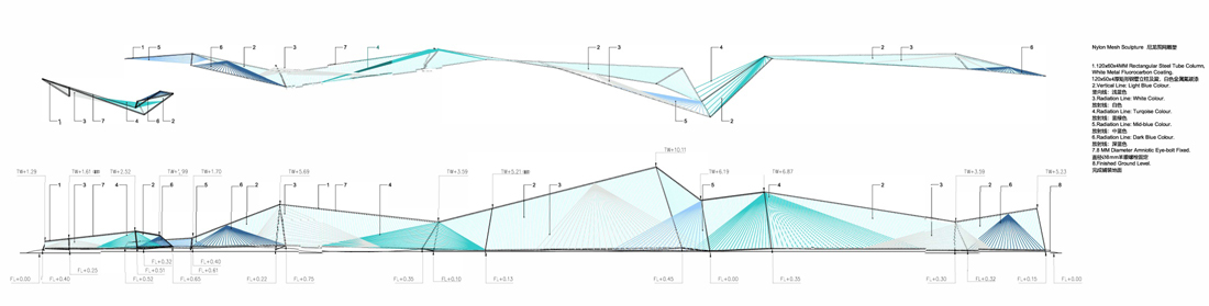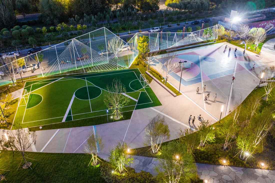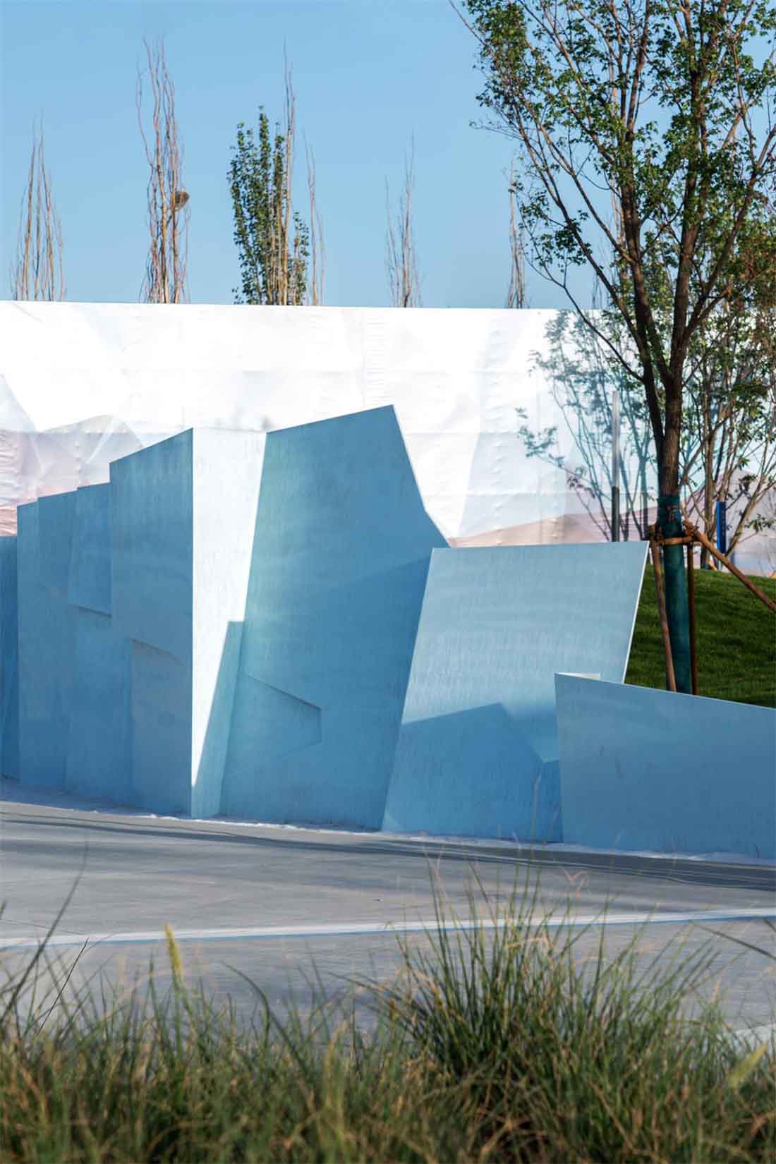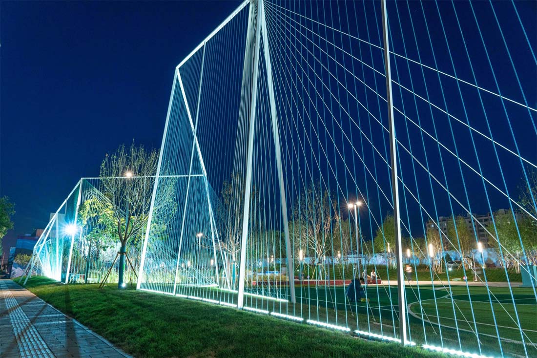 这段模拟冰山天际线、最高处10M、由近4800M蓝色系尼龙绳打造而成的通透“边界”,不仅承载着对外快速主干路的城市形象界面展示,同时也承担着公园内部球类运动的安全围挡。