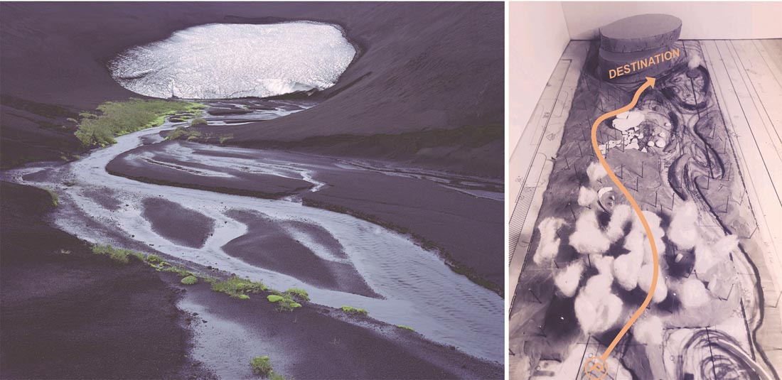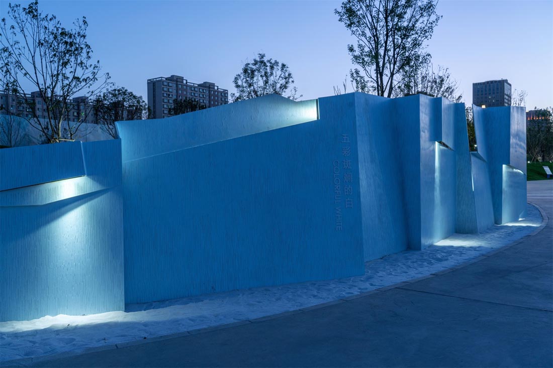 以雕塑感的草坡地形、绿意林带和“蓝冰”景墙作为背景,白天时分的大小冰山显得格外晶莹剔透。