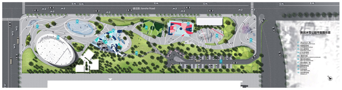 然而面对这样一个正对近百米宽的城市快速路和平整细长的场地,如何规划内外交通和功能布局,对外展示界面形象特色,同时在节点上强化冰雪概念,以创造出所有参与者对于项目的归属感便成为设计师整体重点考虑的目标。