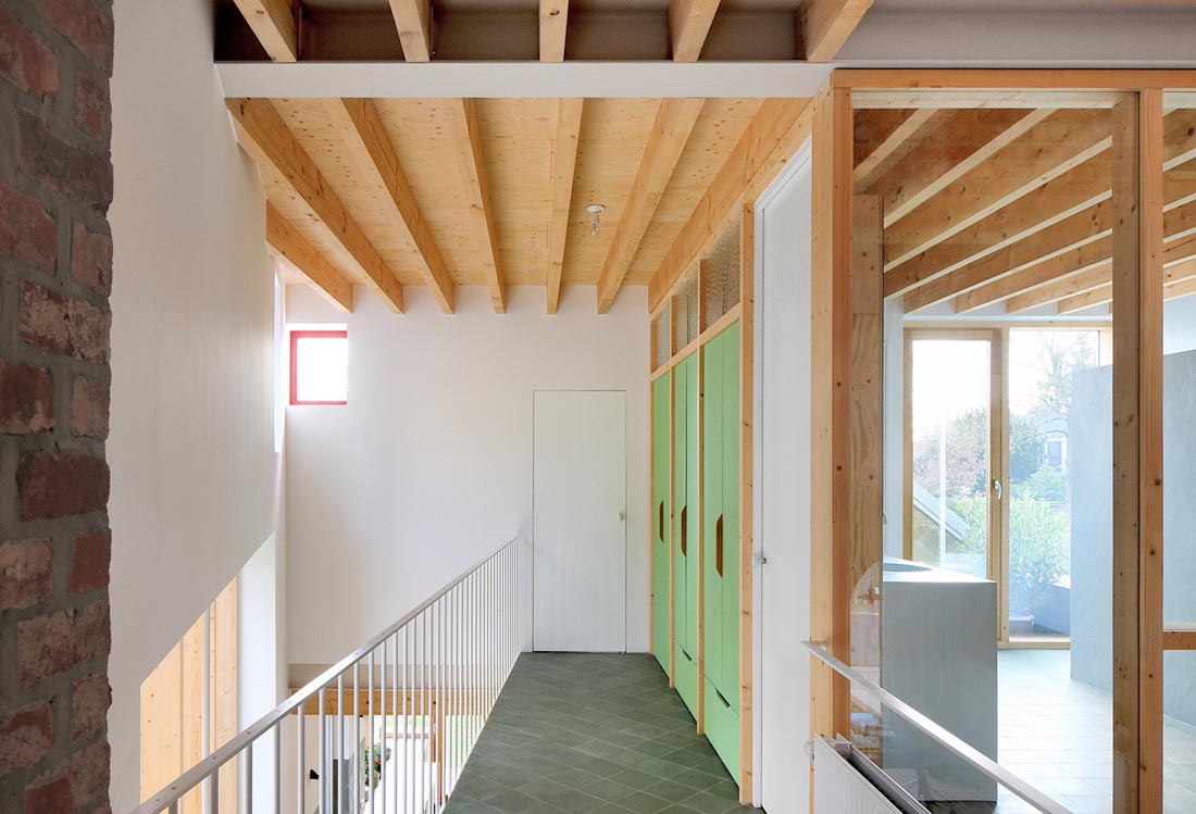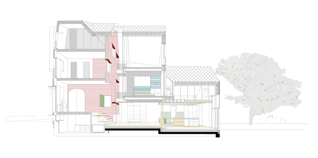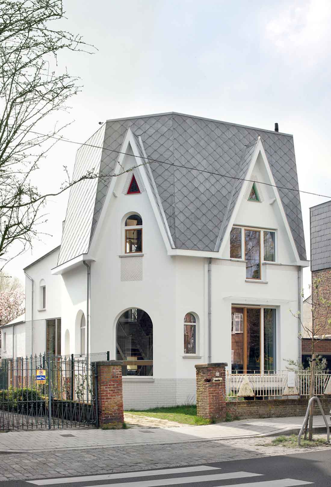 为了凸显对比的关系,扩建部分主要由白色砖砌主体和红砖基座组成。这些材质都引自前半部分房子但又凸显自身的特征。同样地,新体量一些拱型和长方形窗户使用了红、绿或白的粉刷以及局部雕花。另外,三角屋顶成为一个由前到后的连续表面,水泥瓦覆盖屋顶和部分墙面。