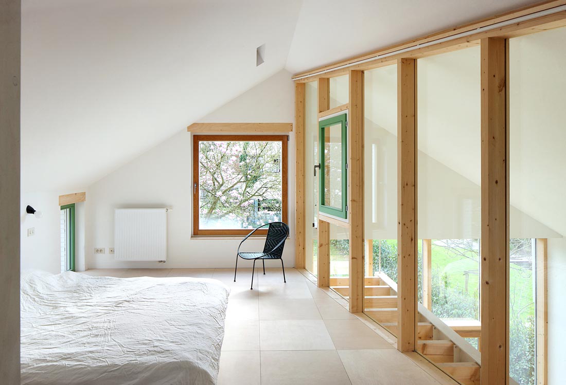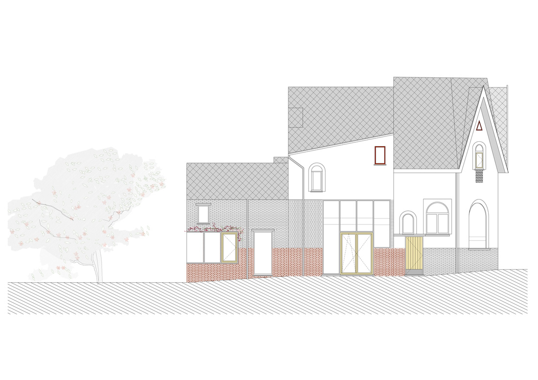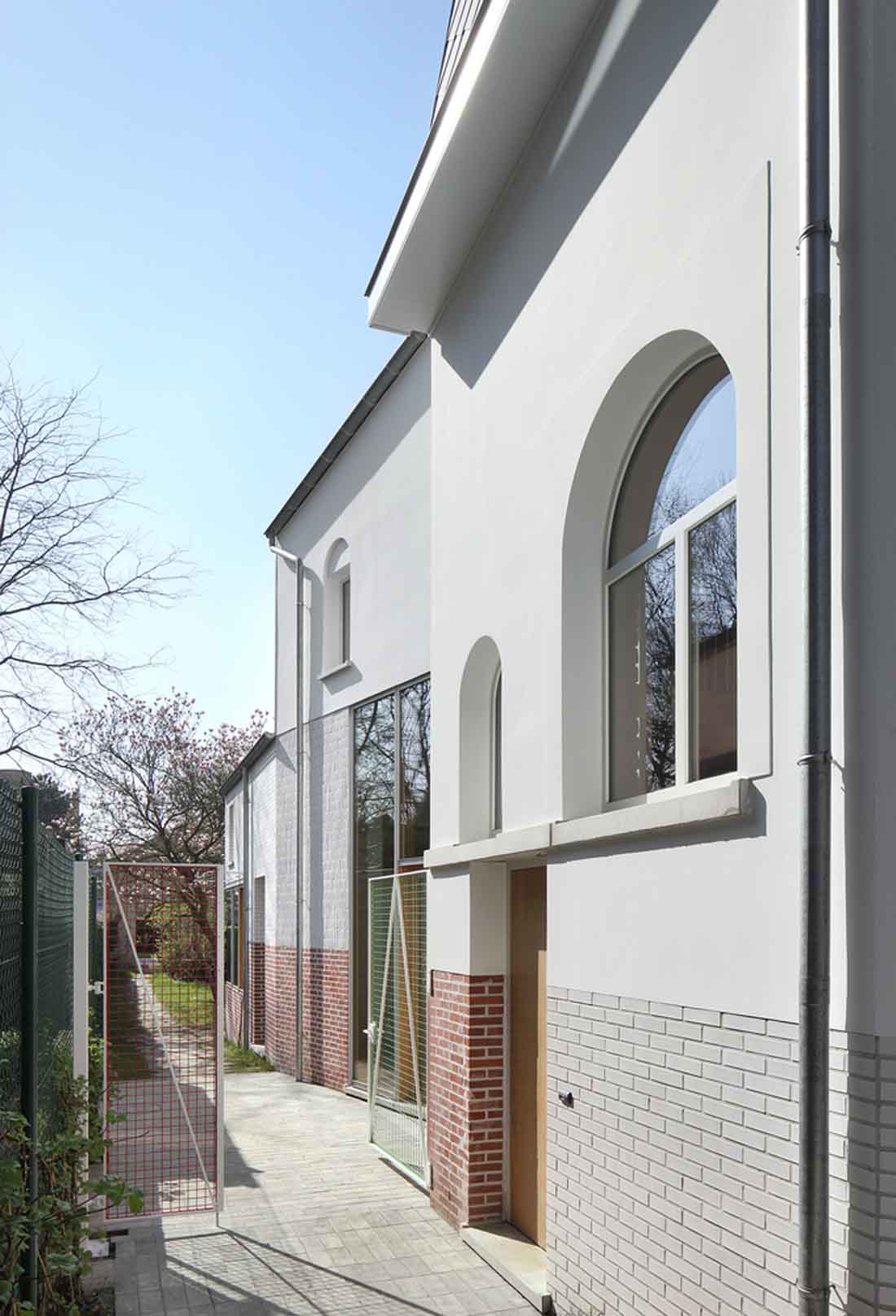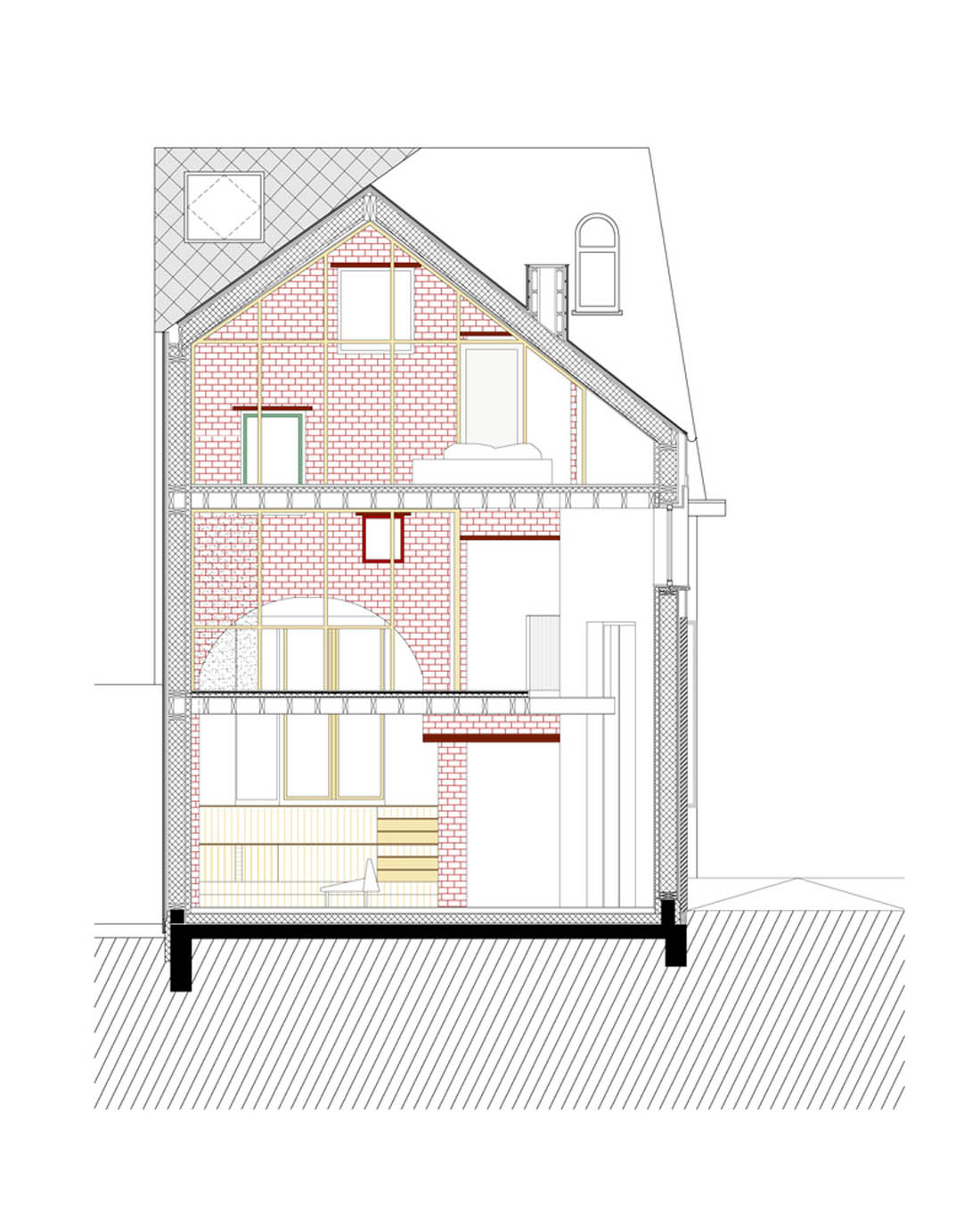 住宅项目是对建于1930年代的一座小而堂皇的房子的改造。改造工程需要将既有建筑除结构砖墙外的部分尽数移除。改造后砖墙在室内仍然处处可见,而其外立面则包裹着白色抹灰保温材料。在背面,两个扩建的新增体量沿着基地的坡度方向,朝着花园逐步降低。