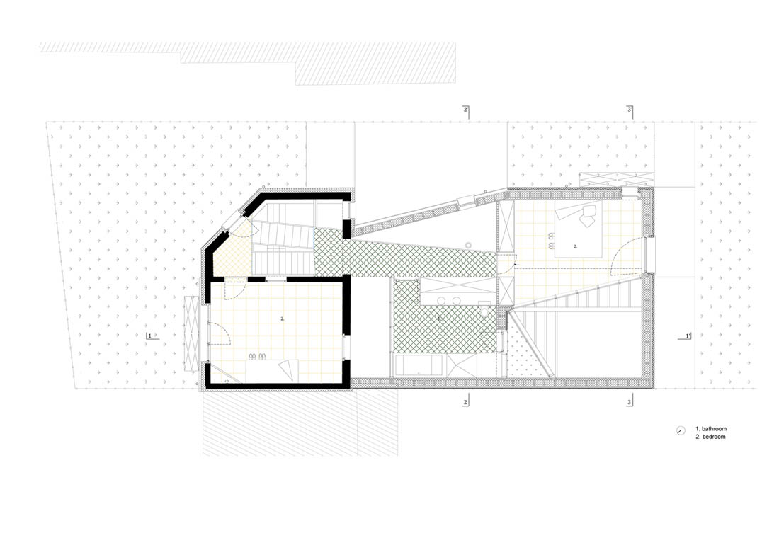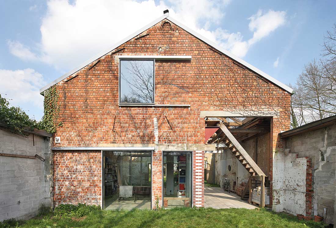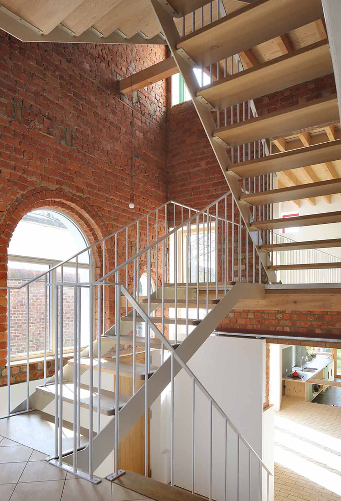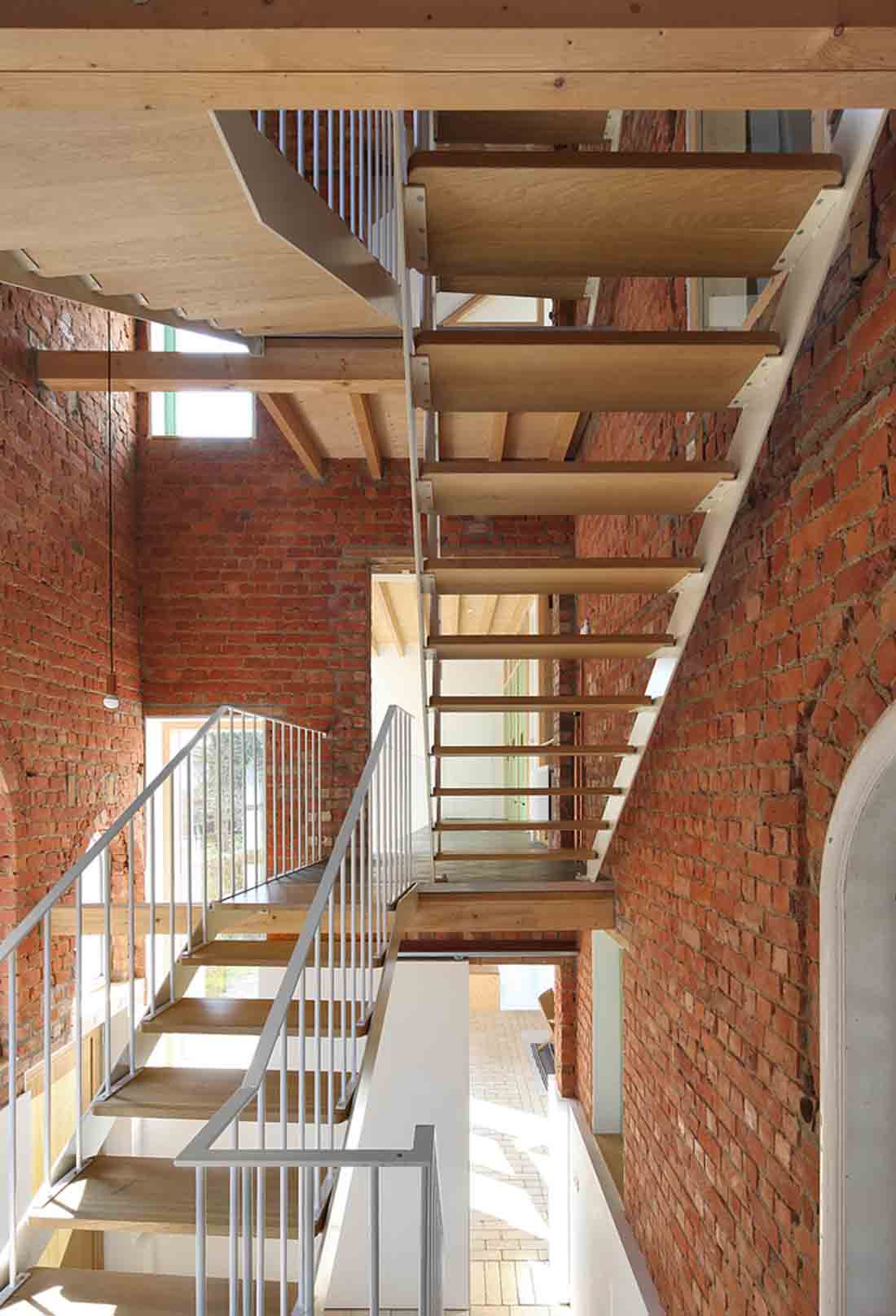 住宅项目是对建于1930年代的一座小而堂皇的房子的改造。改造工程需要将既有建筑除结构砖墙外的部分尽数移除。改造后砖墙在室内仍然处处可见,而其外立面则包裹着白色抹灰保温材料。在背面,两个扩建的新增体量沿着基地的坡度方向,朝着花园逐步降低。