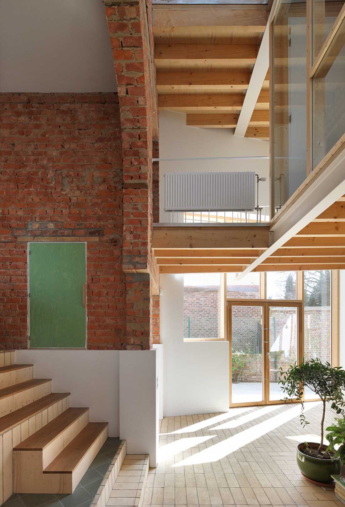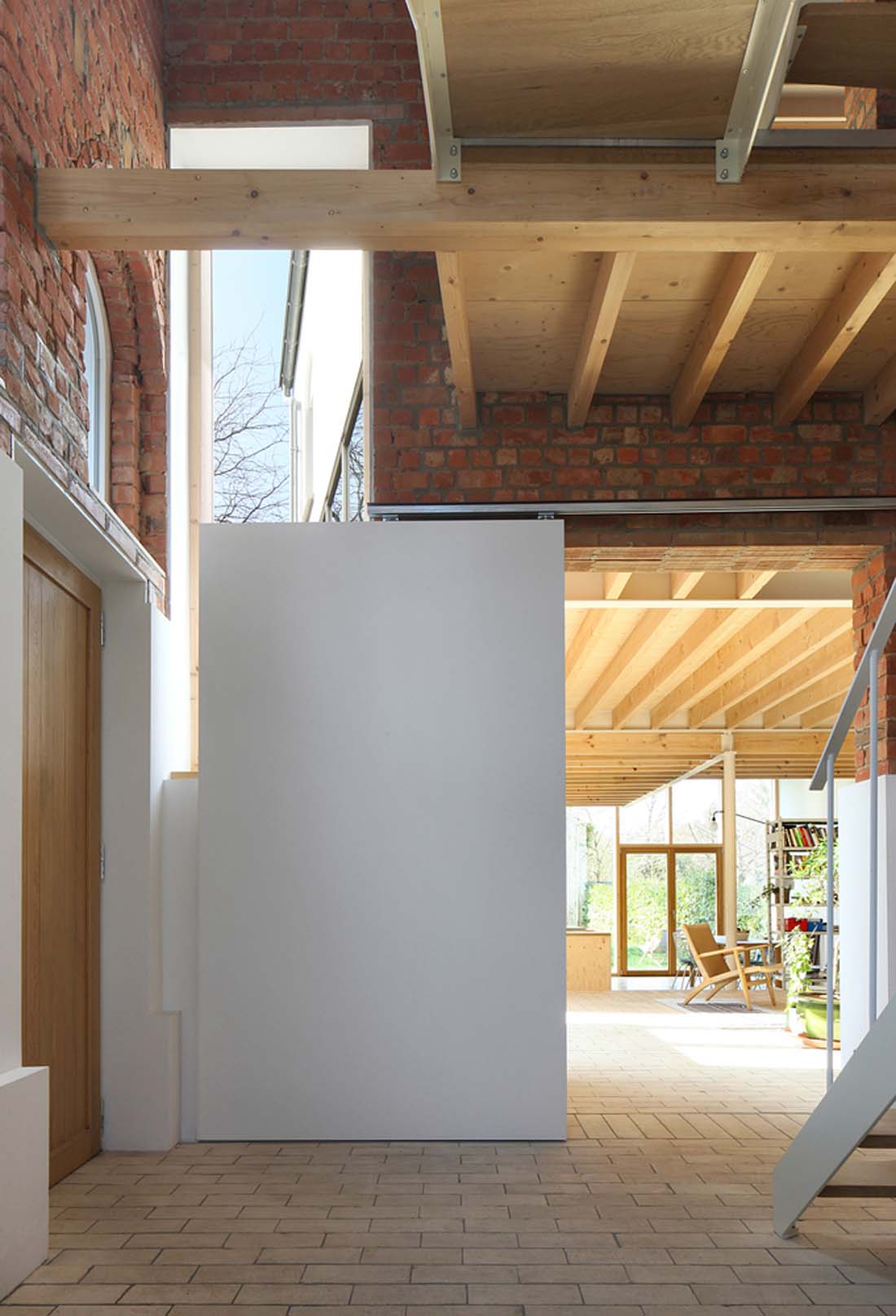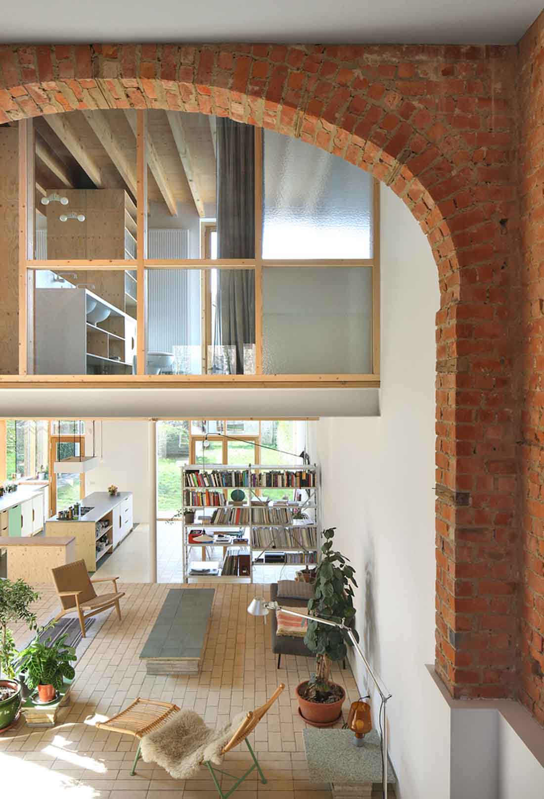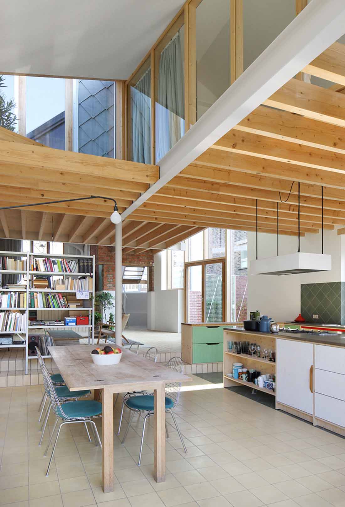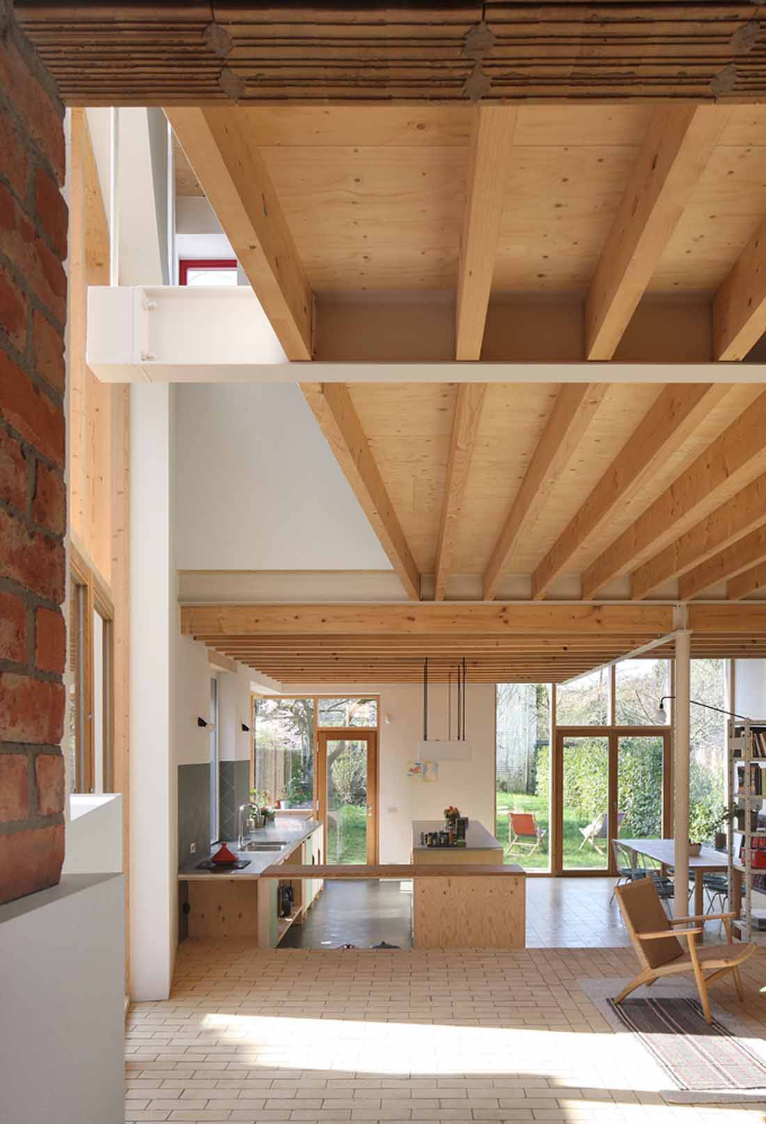在房屋内部,原始砖结构的重量感与扩建部分的轻型木构架形成对比。连续的起居空间沿着整个底层展开,房间经过一系列台阶到达中部的休息区域,再向延伸到后部的厨房与餐厅。大窗户朝向花园开放视野,引入充足阳光,室内的窗户则提供可以看到不同房间的视野。