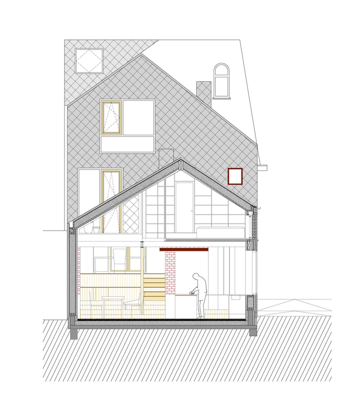 此外,在窄而深的基地尽端,一座旧棚屋被改造为一个花园。棚屋剩下的部分被围合为一个温室构筑物作为避暑屋,可以用于儿童游戏空间。在温室墙体和旧立面之间的室外空间,提供回到花园和房子隐秘衔接。