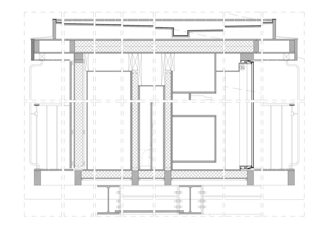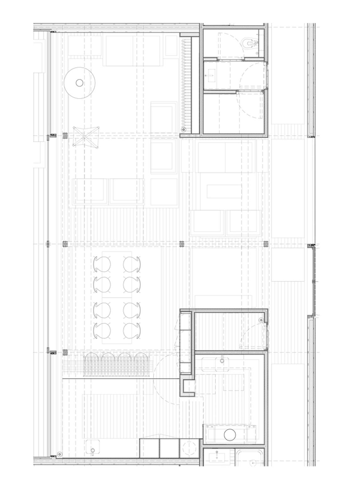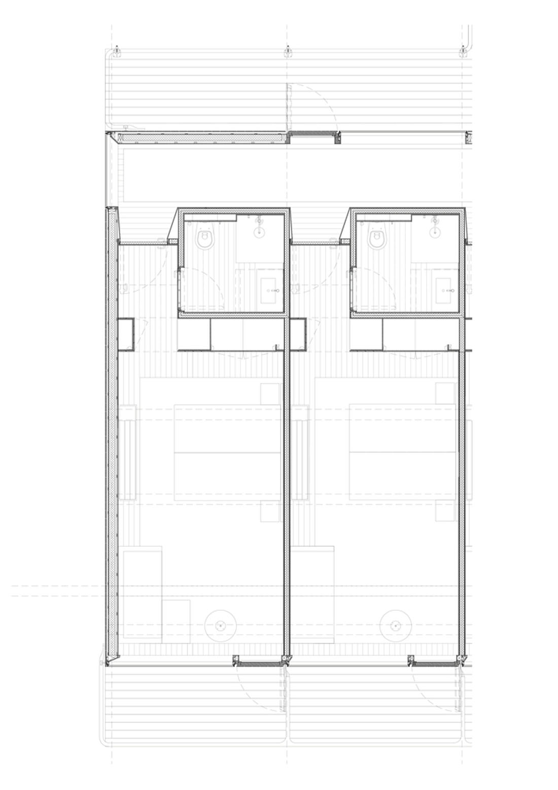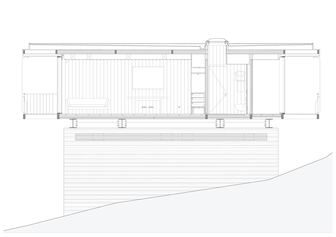 阳台,长露台等形状的外部空间可确保出入和流通,并能防止日光照射和防风雨。在支撑所有木结构的下方,有一个金属框架,该框架搁置在两个支柱中。这些支柱内部有可居住的空间,可容纳所有技术区域和必要的服务。