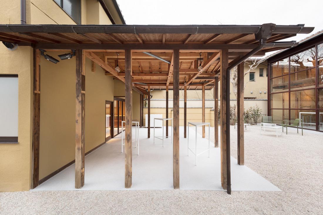 建筑原有的地板高出地面50厘米,是日本传统建筑的特色。改造中地板被拆除,以地面为建筑新的地平。为了在视觉上将室外的鹅卵石地面延伸至室内,建筑室内采用了有同种鹅卵石花纹的水磨石地面。遵循与其他店铺相同的理念及来此日本与美国的文化背景,京都咖啡店柜台内的地板与顾客用餐区持平,以此保证员工与顾客拥有相同高度的视线。水磨石板不仅被用作地板,还在某些区域凸起成为柜台及长凳。