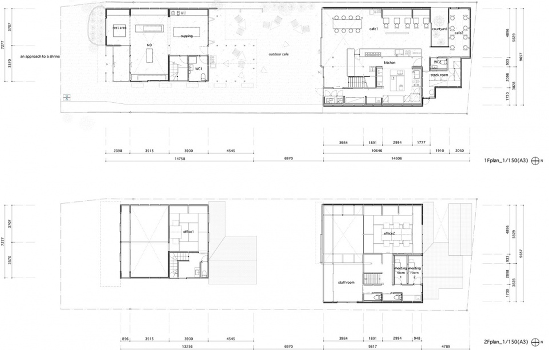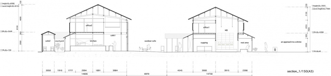 这间町屋(machiya)原有的两栋建筑被分别翻新为咖啡厅及商业建筑(MD Building)。建筑二层空间用作办公室,空间内不必要的墙壁全部被拆除并安装上玻璃,以保持上下层之间的视觉联系。