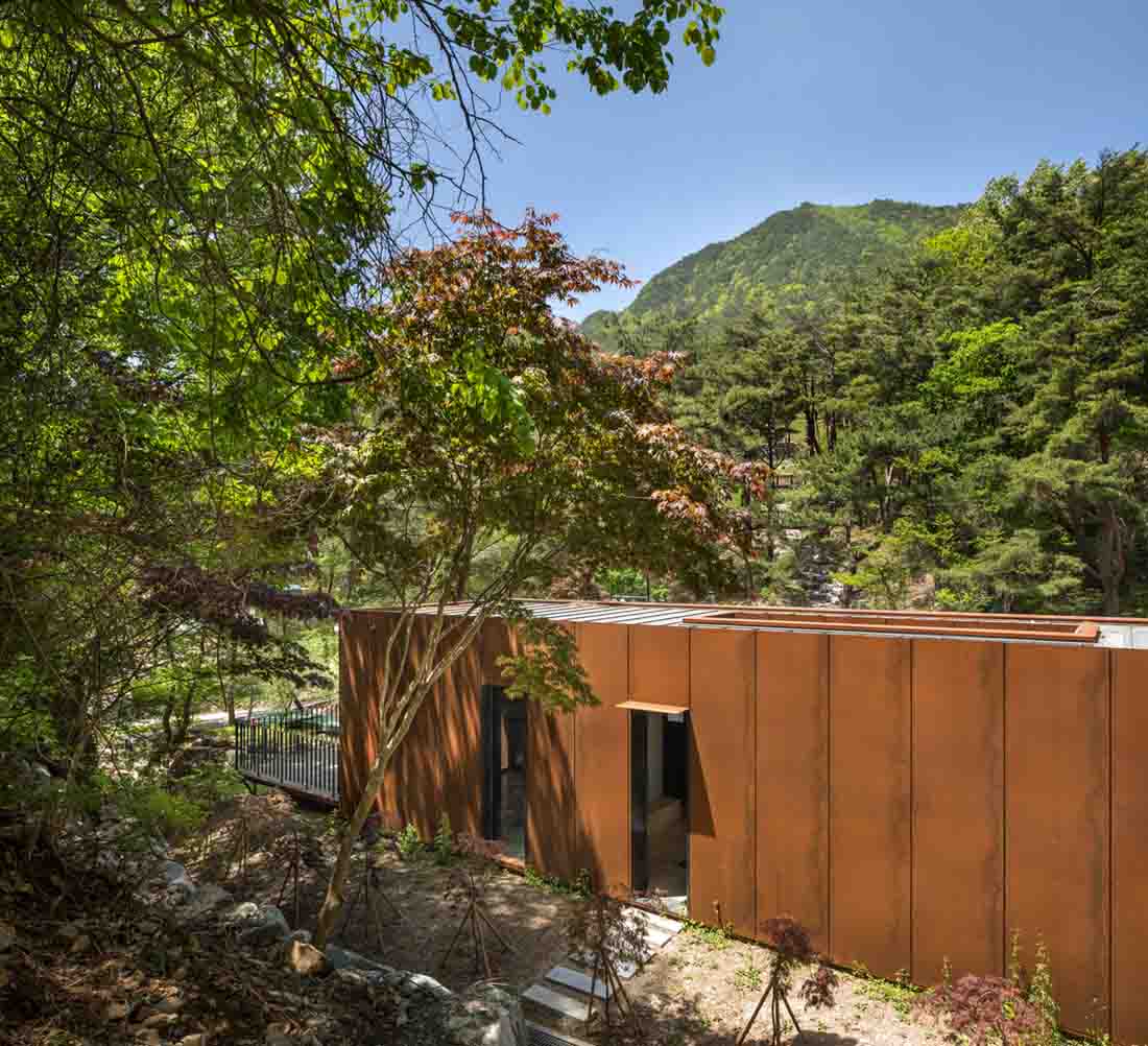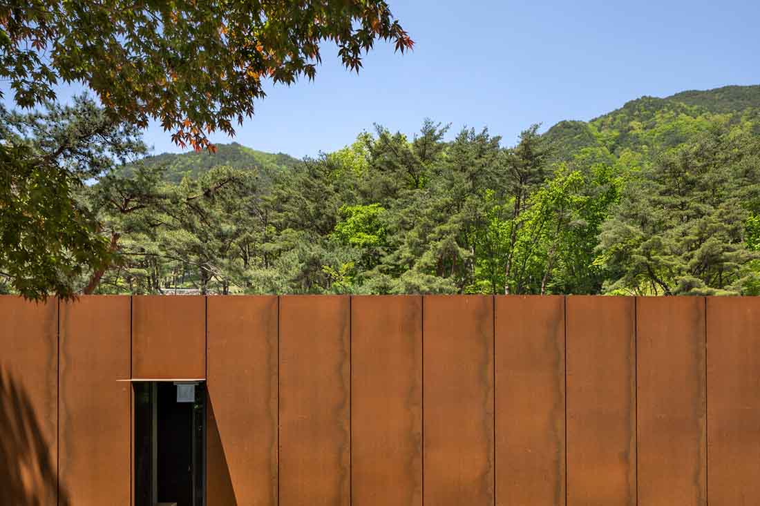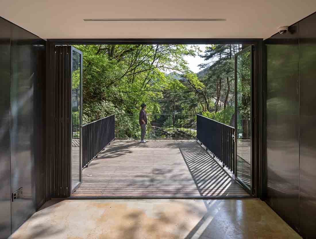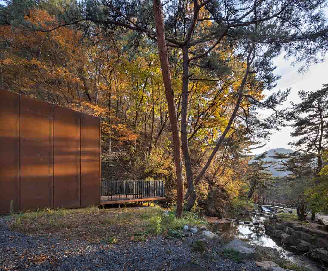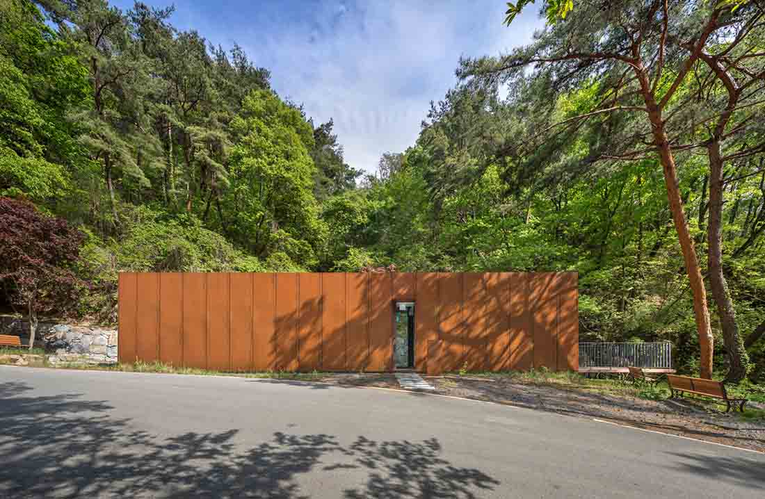 这是一栋小型公共建筑,仅70平方米。该建筑形状像盒子,为参观韩国庆尚南道的大户山的徒步旅行者提供了展示和休息的地方。它均匀地围绕狭窄的室外区域居中,并在两侧创建两条简单但实用的路径。