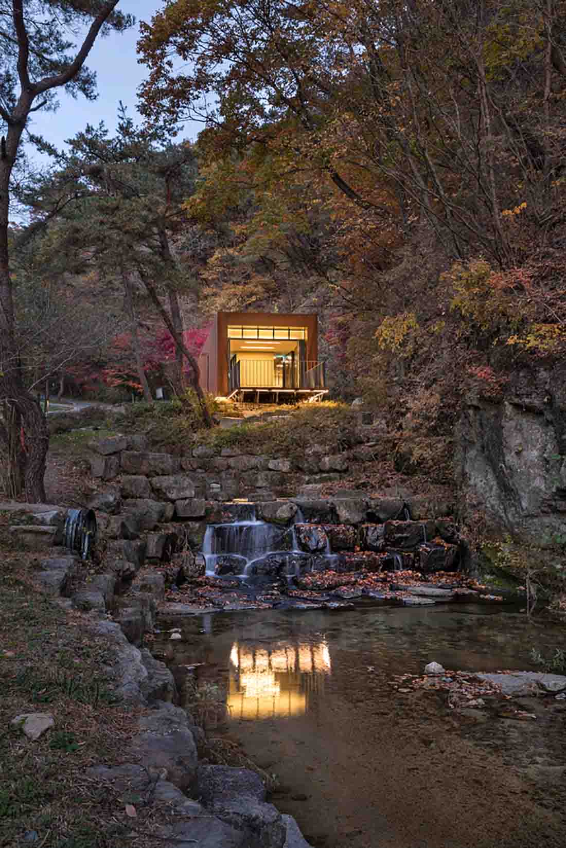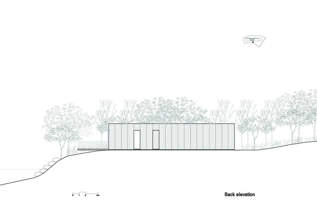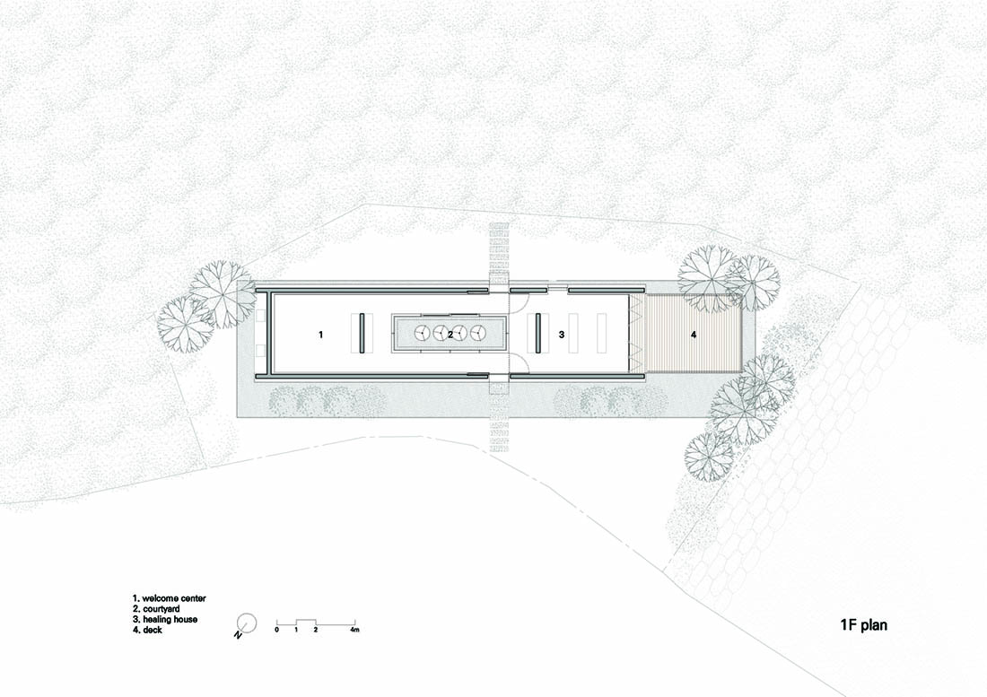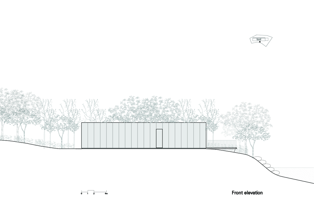 这是一栋小型公共建筑,仅70平方米。该建筑形状像盒子,为参观韩国庆尚南道的大户山的徒步旅行者提供了展示和休息的地方。它均匀地围绕狭窄的室外区域居中,并在两侧创建两条简单但实用的路径。