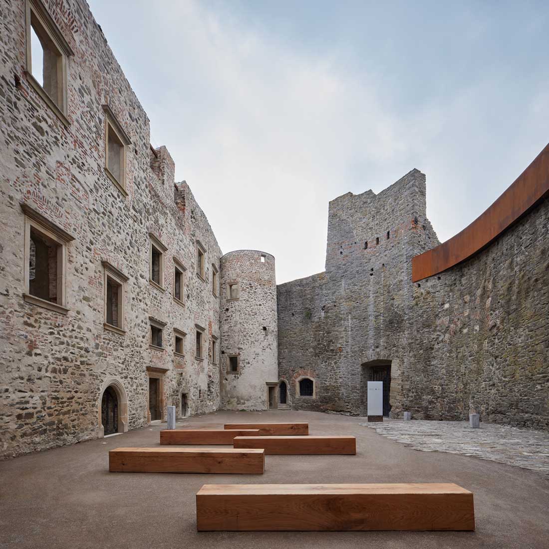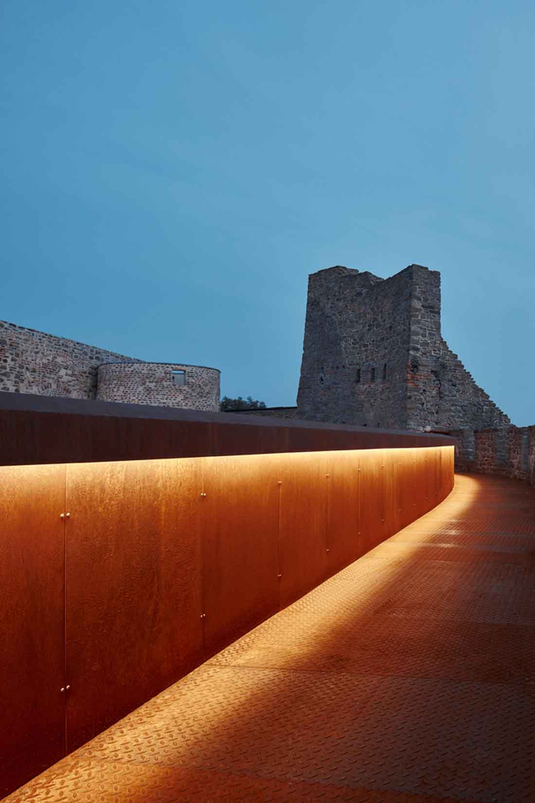 耐候钢板人行天桥的添置,使得游客可以更好地环游整座古堡,并同时欣赏到古堡周围的地貌景观。地面层混凝土小径的设计,使得游客可以去往古堡的各个角落。而处于笔直耐候钢板和蜿蜒古城墙之间的小径则给项目本身增添了不少趣味性。建筑师还选择用砾石铺路的方式来呼应这种有所控制的不确定性。