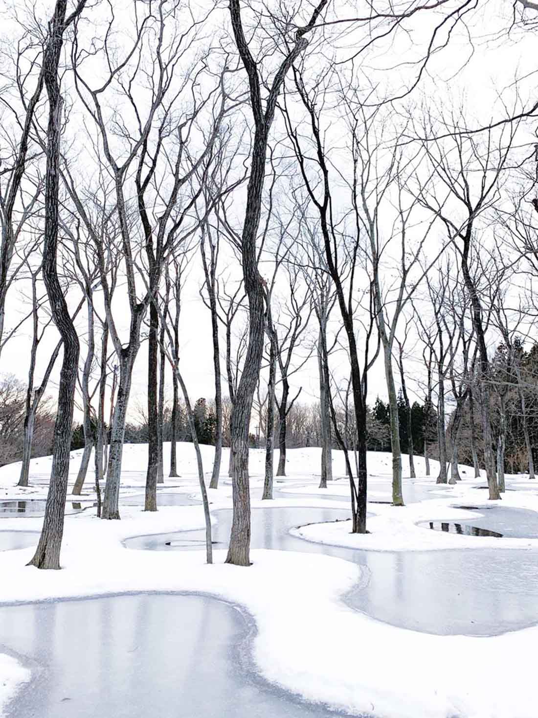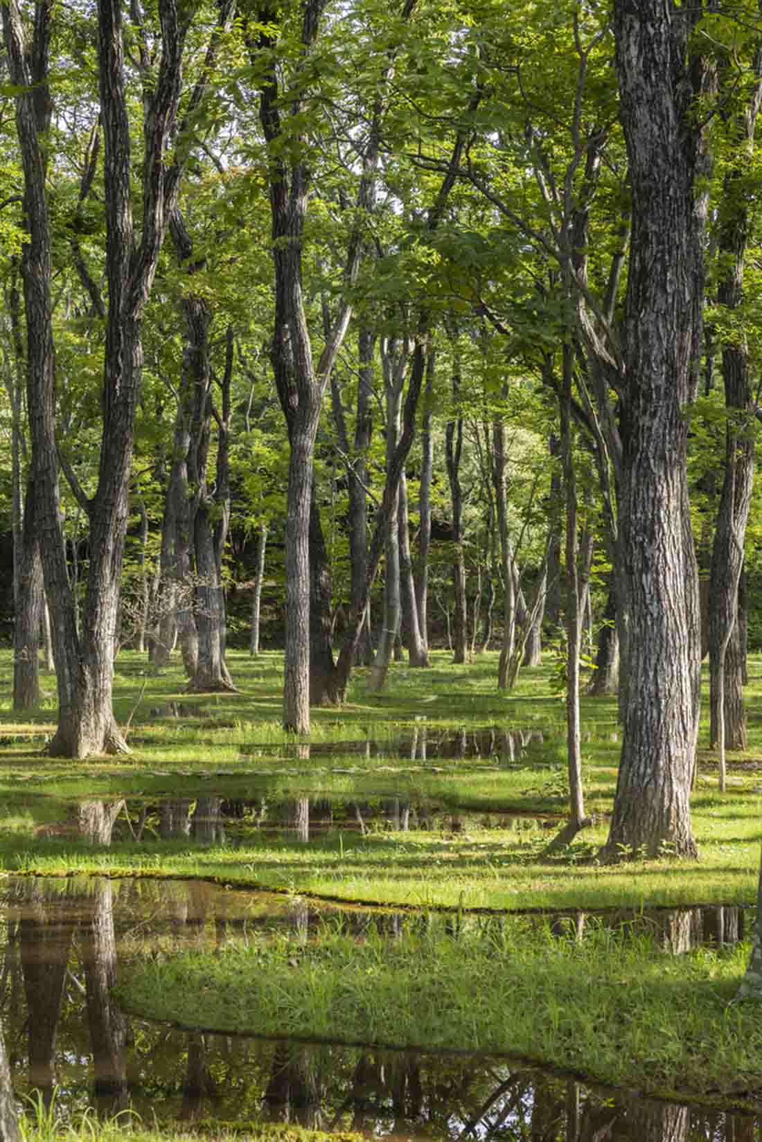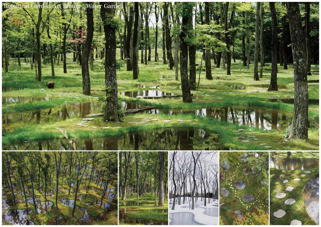 这里的池塘和树木以无法在自然界看到的高密度布满了整个场地,空隙也被苔藓所填满。这样一座拥有无数树木和无数池塘的苔藓森林,形成了既崭新,又集合了场地原本自然景观的独特风貌。