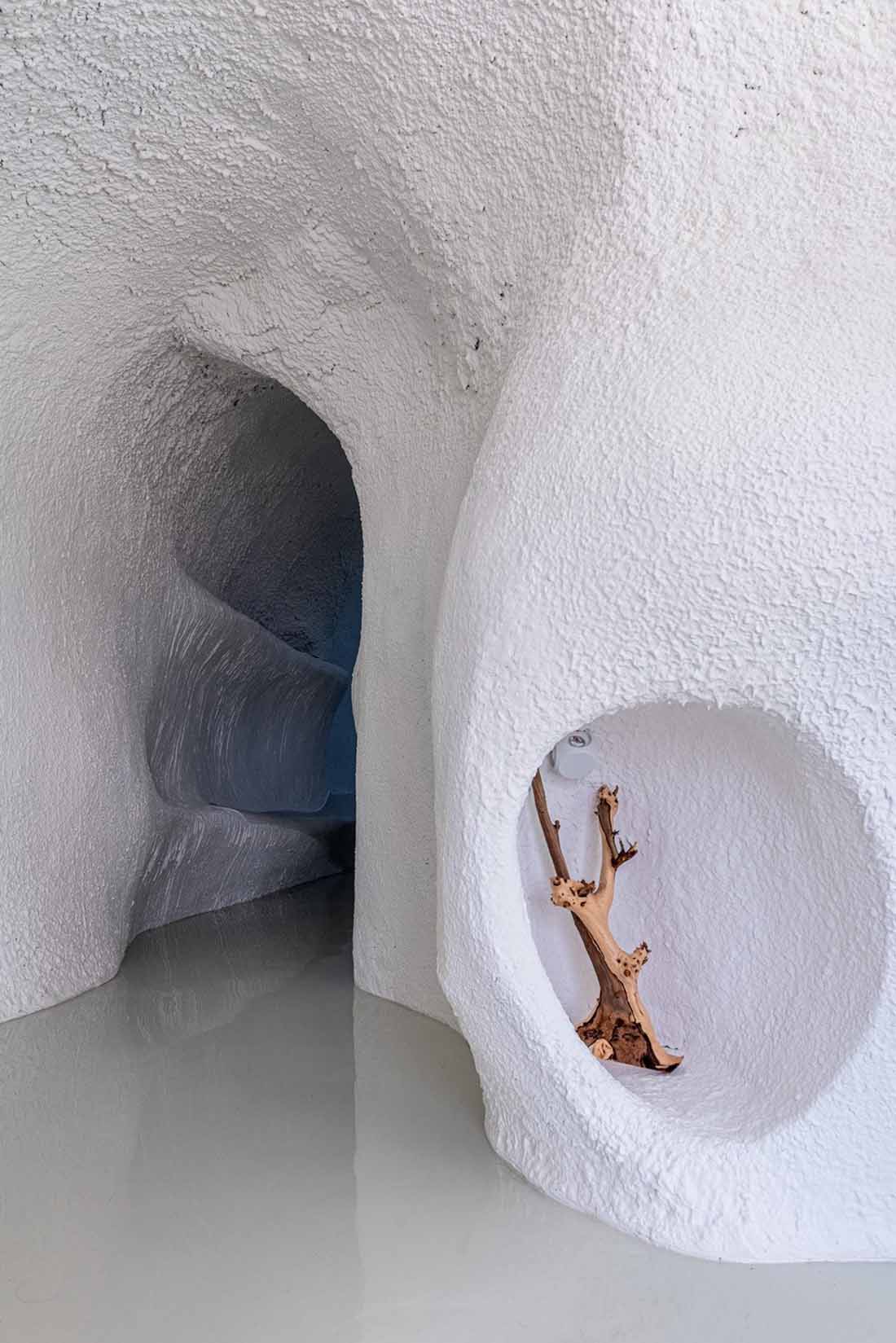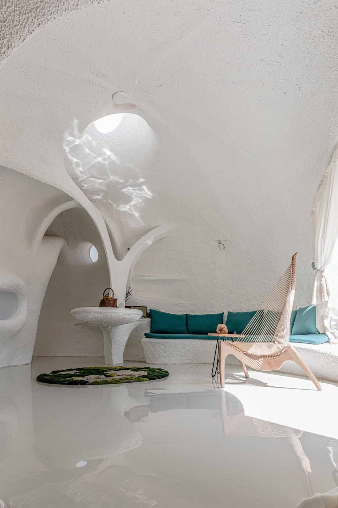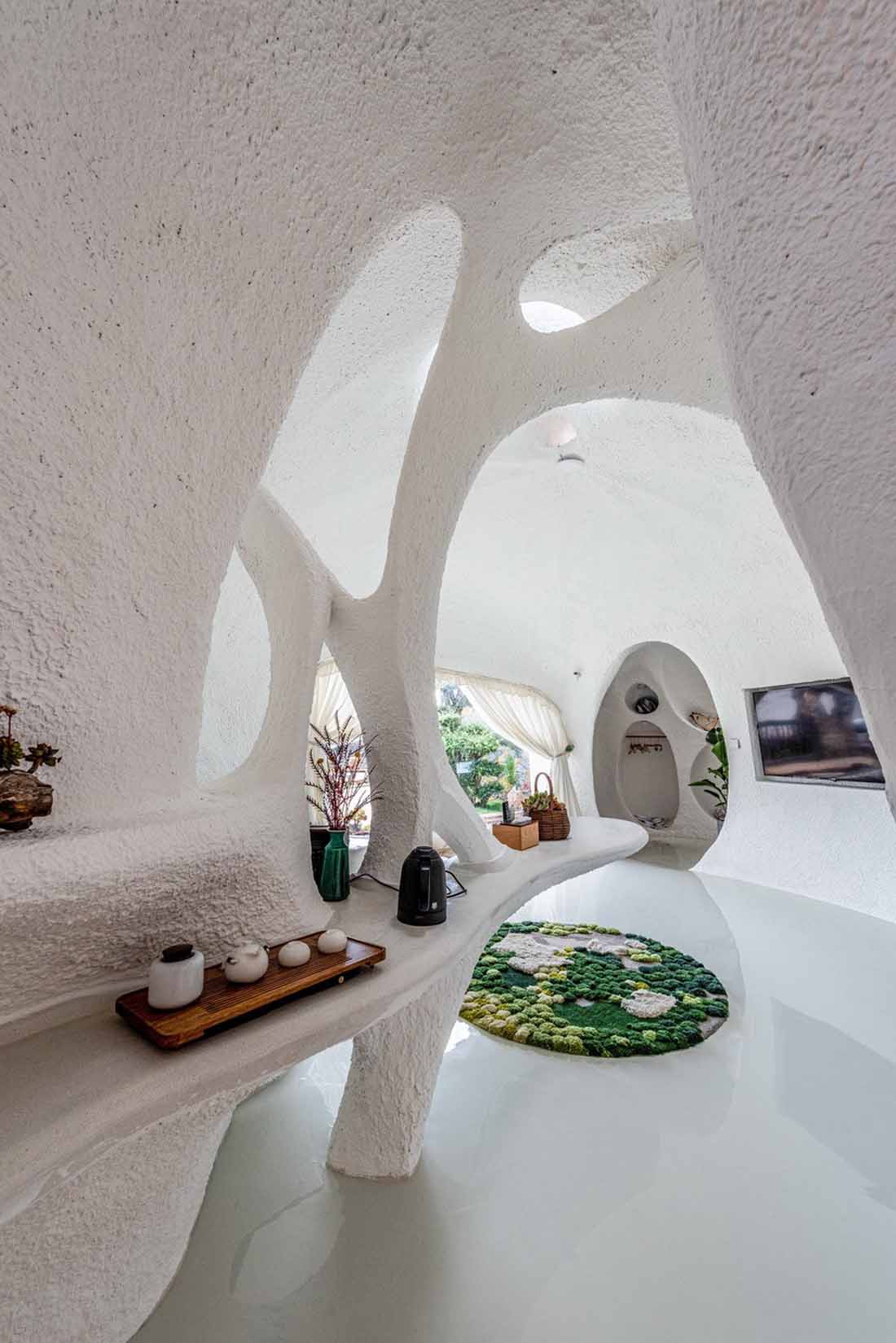 当曲面构造的空间体量被赋予朴实的功能,超现实主义的空间便能柔和的刺激人的感官。肌理、光线、空间相互交织,能给人柔和的触动。
