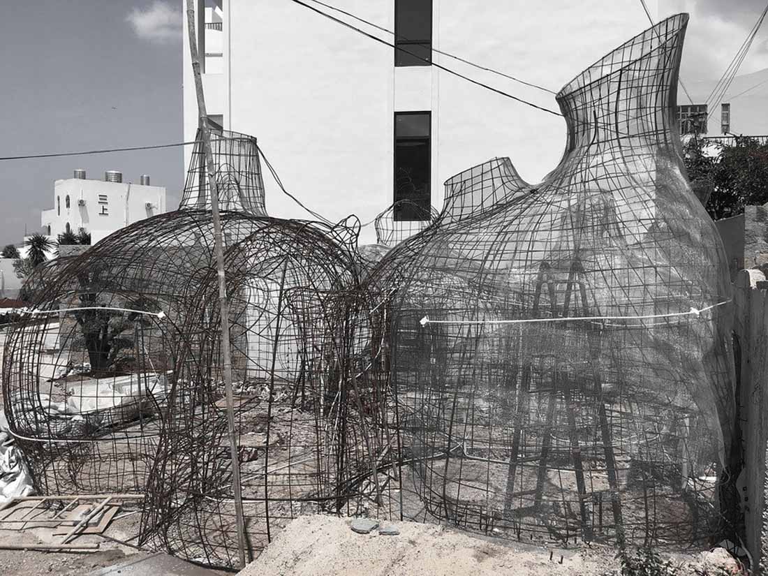 手工编钢筋“脊骨”,包裹金属网,喷涂表层水泥,整体浇灌,采光井和通风井,完成形体建设后实地测试、定点装设光源。