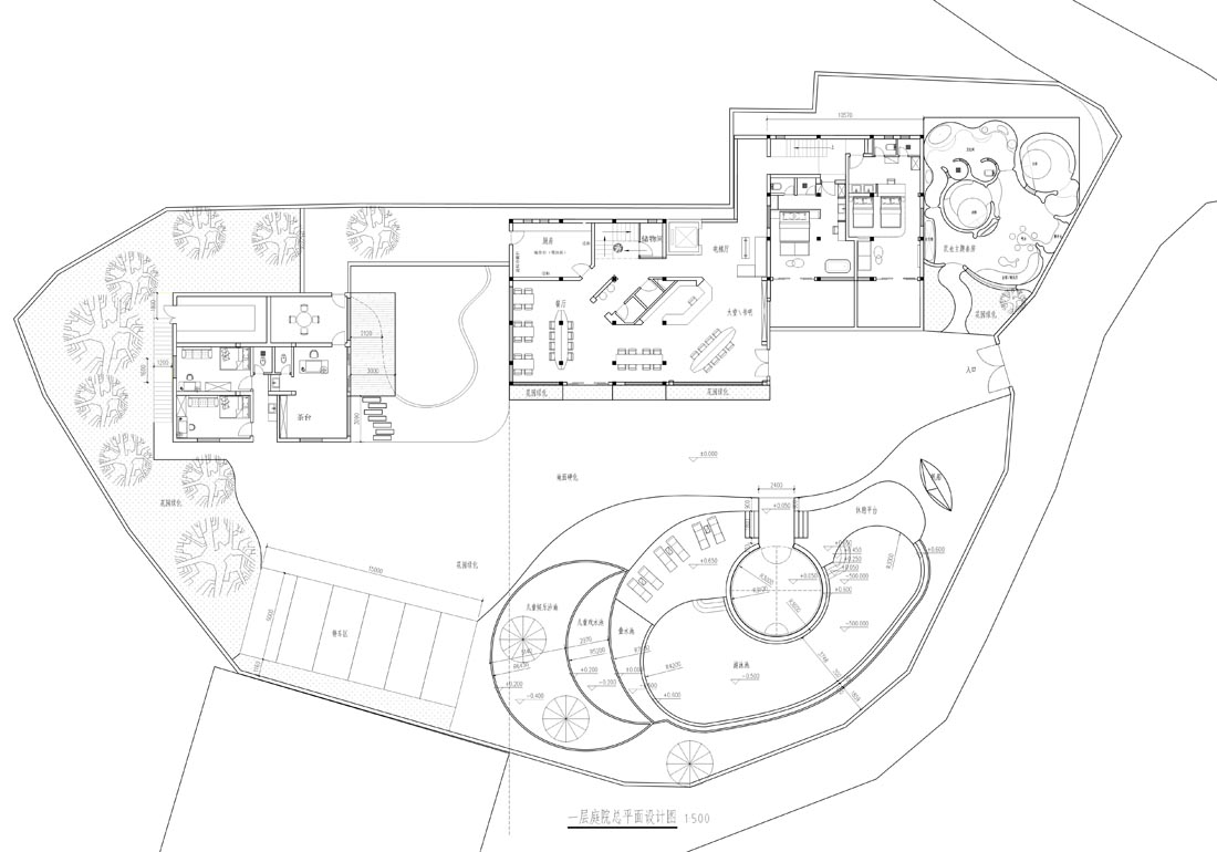 建筑造型灵感来源于蚁穴。在一幅蚁穴主题的童画中可以看见儿童对于蚁穴空间功能和交通的想象,通过三维设计构造,使得常人眼中的童趣、设计师看法里的光影交织空间过渡融合一体,从而让不同的使用群体都能在其中感受空间组织变化带来的冲击。