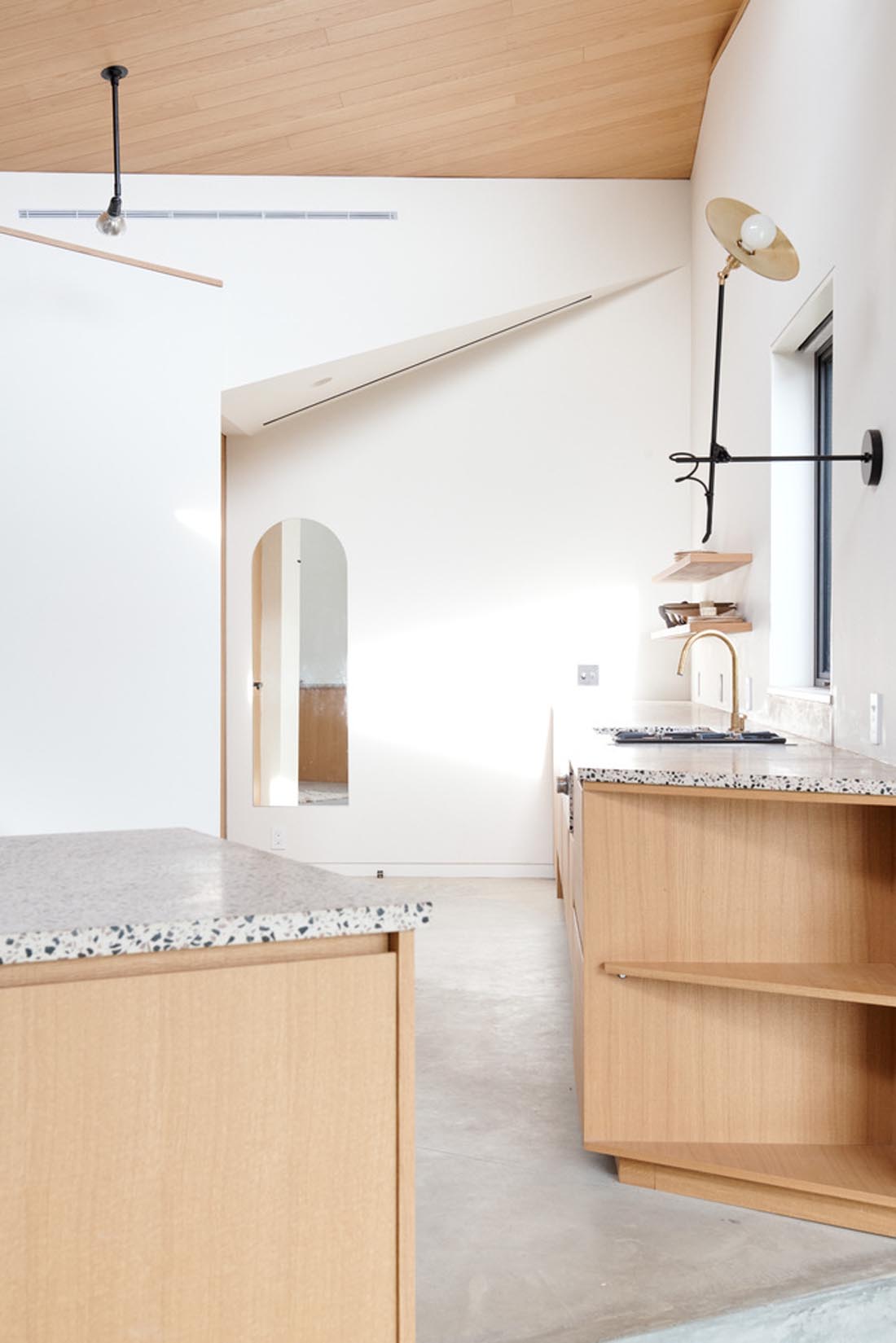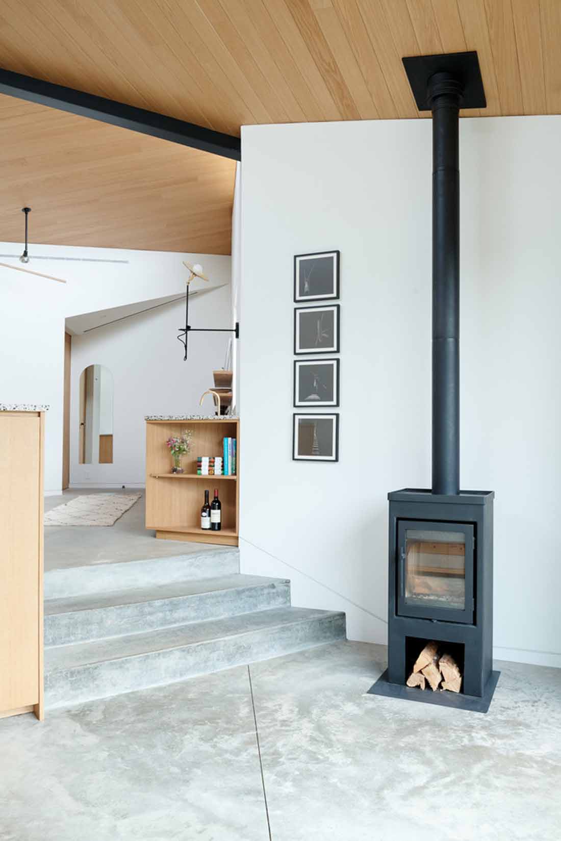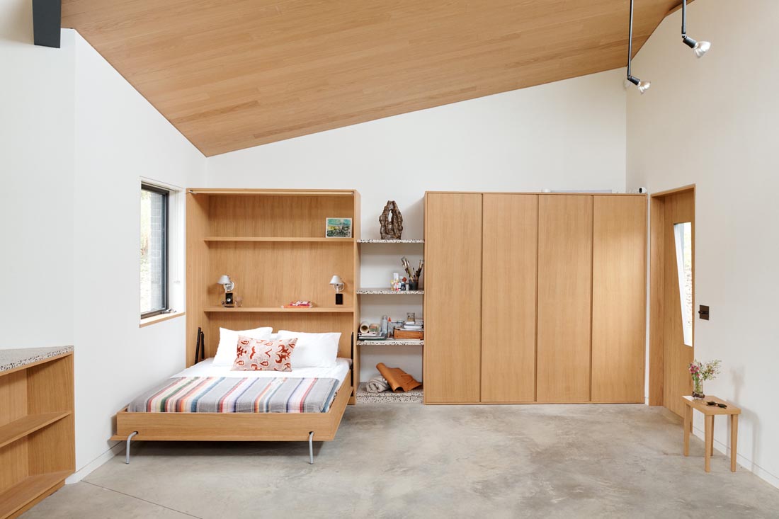 设计师用风车组成了三个相等大小的体积,以创建一个800平方英尺的开放式工作室。每个质量块在喙状的窗玻璃窗顶上都有一个相同的屋顶,但是根据该位置引入了不对称性。质量块在一个中心点相遇,以三个钢梁的风车相交为标志,但是内部被认为是三个隐含的房间,每个房间都面向不同的视图。南部群众走下坡路以遵循地形,窗户的大小和位置都经过调整,以平衡视野与隐私。内置元素执行墙通常会执行的许多角色,这意味着在不分隔空间的情况下创建房间,并为烹饪,生活和睡眠创造了空间。