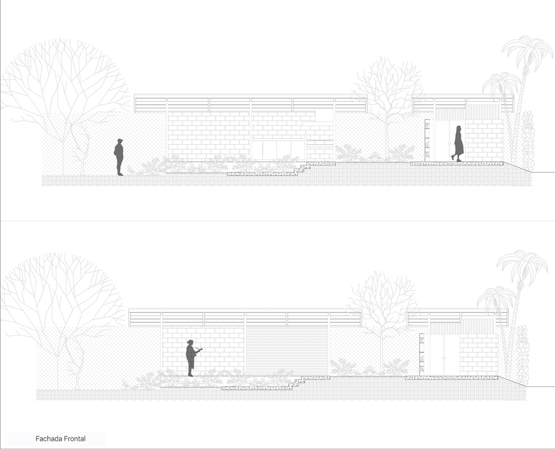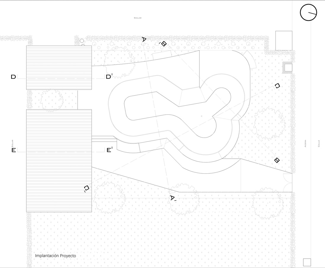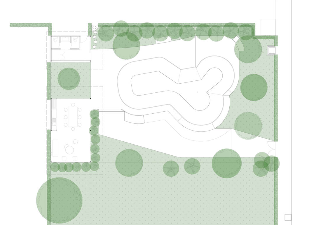 NB2是一个单层建筑。由于业主是一位滑板爱好者,项目的主要元素被确定为一个可供使用者“在混凝土中滑板”滑板碗池。项目的其它组成部分为一些基本空间,建筑体量被花园分成两个互不相连的部分:一边由烧烤区域和会客厅组成,另一边则是卫生间和地窖。使用者可以在使用烧烤区域和会客厅的同时感受“滑行碗”带来的青春活力,体验被绿植环绕的舒适静谧。