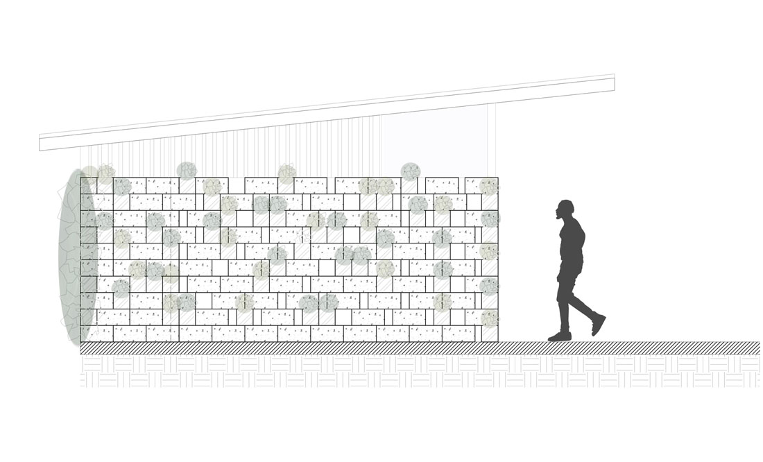 建筑材料方面,设计师主要在灰色黑色和绿色这三个色系中进行选择。除颜色之外,预算也是影响材料选择的重要因素。抛光混凝土表面被用于地面和“滑板碗池”。黑色则出现在金属结构,轮廓以及屋顶区域。抛光水泥和金属板被用于裸露的混凝土砌块和建筑物上部,在加固屋顶处节点的同时也起到了减轻自重的效果。这些特殊设计将避免日后可能的维修作为优先考虑因素,是为对项目整体设计概念的回应。
