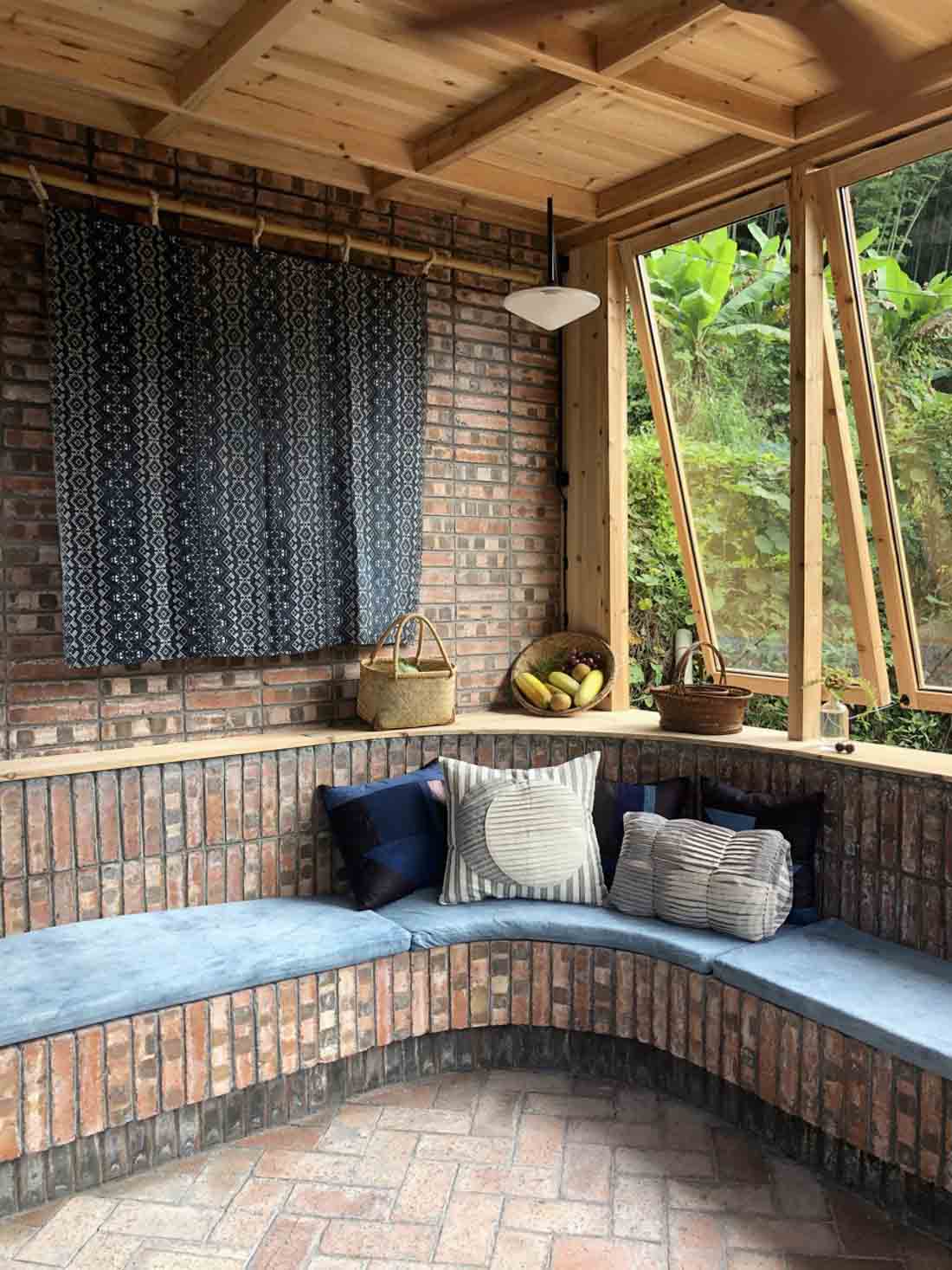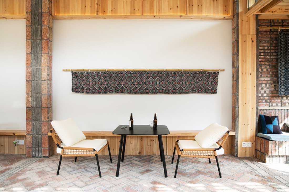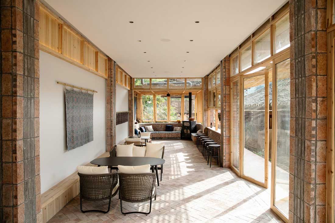 材料上,除了大量使用杉木之外,建筑师也大胆尝试了当地带有烧结黑斑的红砖作为民宿一层空间的主要饰面材料,透过细心的安排,这个常见于猪舍墙体的砖材尽可能的展显出了材料的本质与秩序,打造出属于大利村的公共空间氛围。