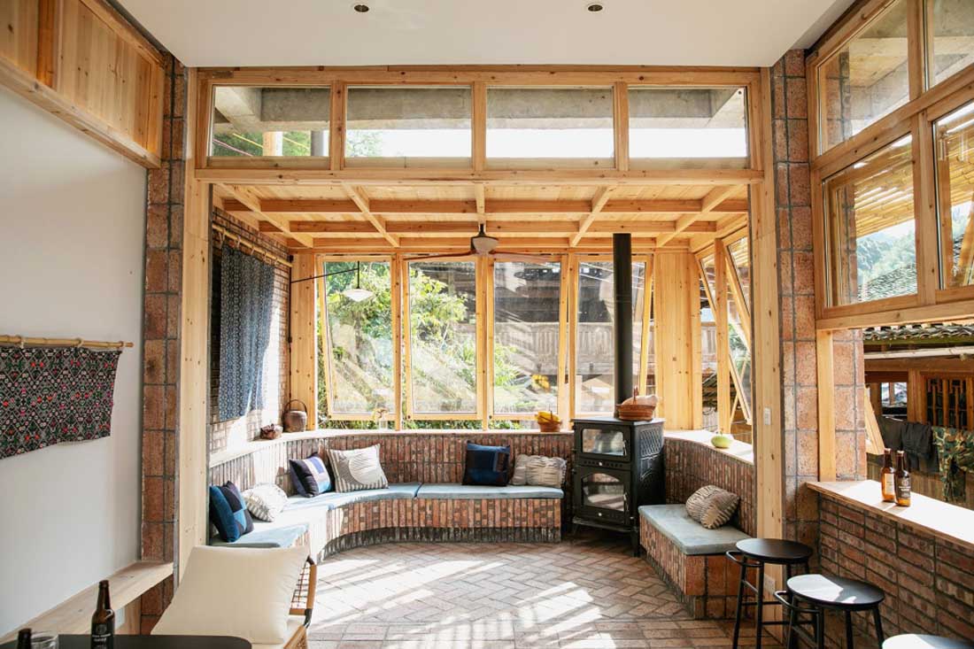 面对物理环境,传统西南民居透过架高的竿栏与火塘、烟熏等方法去除冬日的湿冷体感,设计师进一步尝试透过现代的方式将原有的单层拼板墙改造成具隔音防振与保温隔热等现代需求的多层墙体,并透过立面上外凸的飘窗与风板来捕捉平行于山脉的谷风,营造被动式通风,有助于夏季室内外的空气对流,缓解室内的闷热感。