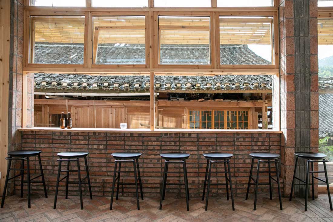 井上民宿座落在村子中很显眼的半山腰上、一座古井的正上方,面向村落的中心-鼓楼坪,拥有非常辽阔的视野,同时三层楼的量体也对整体村落风貌有一定程度的影响力,因此这次的增改建中,设计师谨慎地在传统民居与新的旅社机能当中取得平衡,在保有室内良好视野的同时,也维持立面上村落原有的构造节奏。
