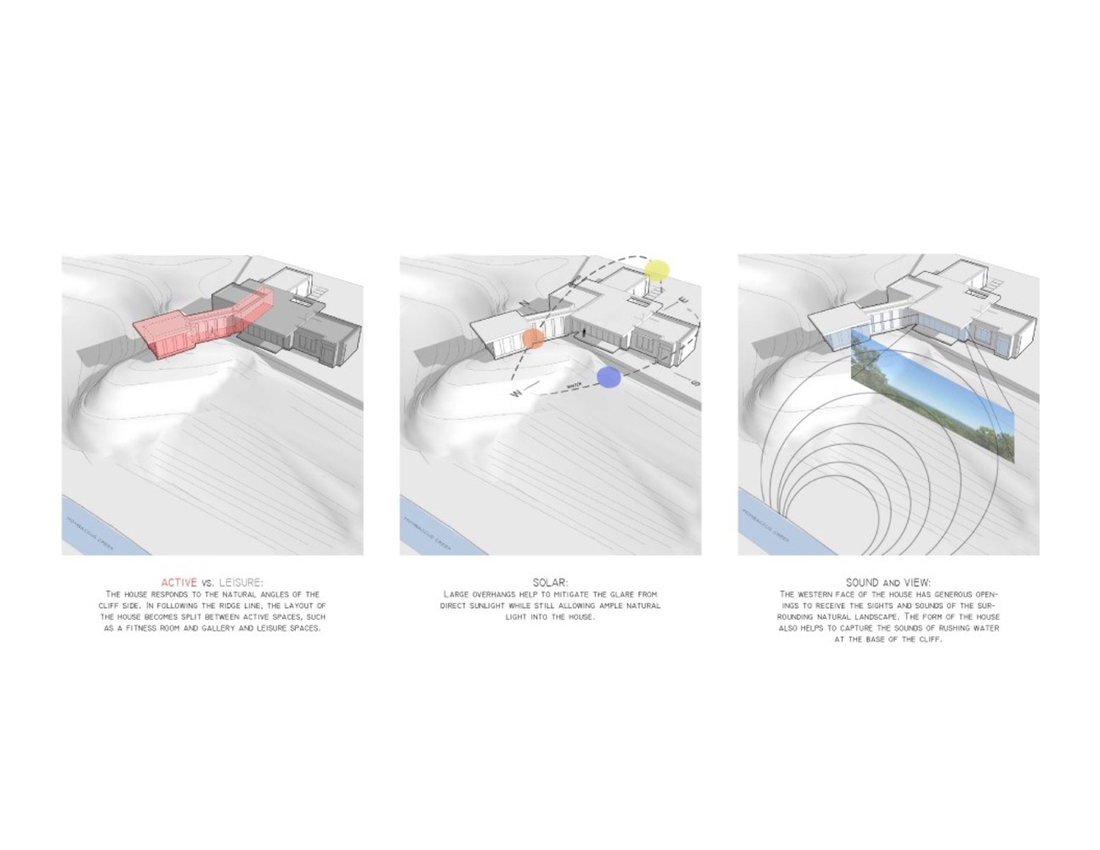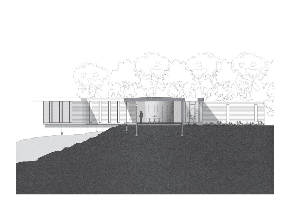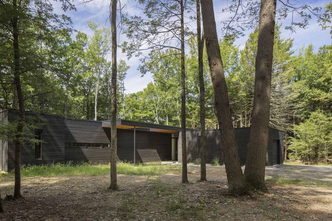 从不同的角度以不同的方式与自然相关,建成的环境成为一种互动的容器,可以体验动态的场所感。高高的山脊上有一个凸出的小丘,一直延伸到远处,然后才下车,高处俯瞰卡茨基尔山脉,下面是一条小溪。直接地响应地形,房屋的主要部分与山脊平行,而画廊和工作室则沿着小丘水平延伸。