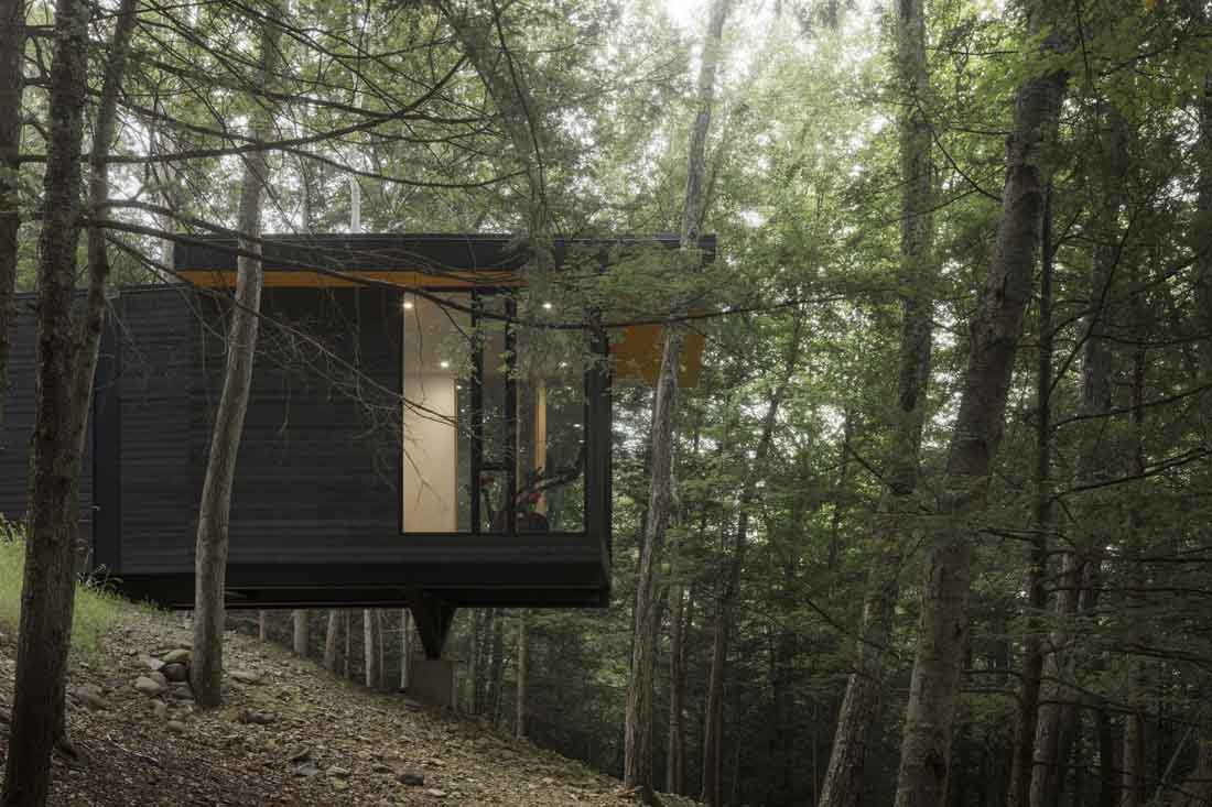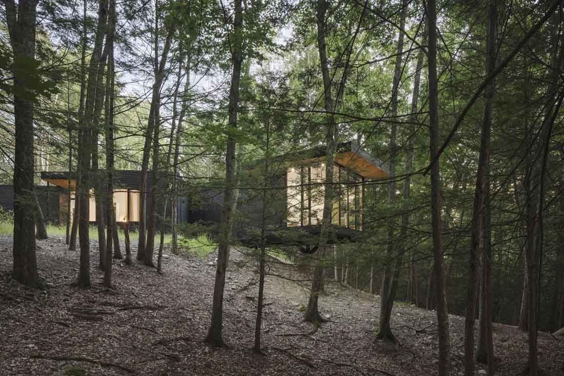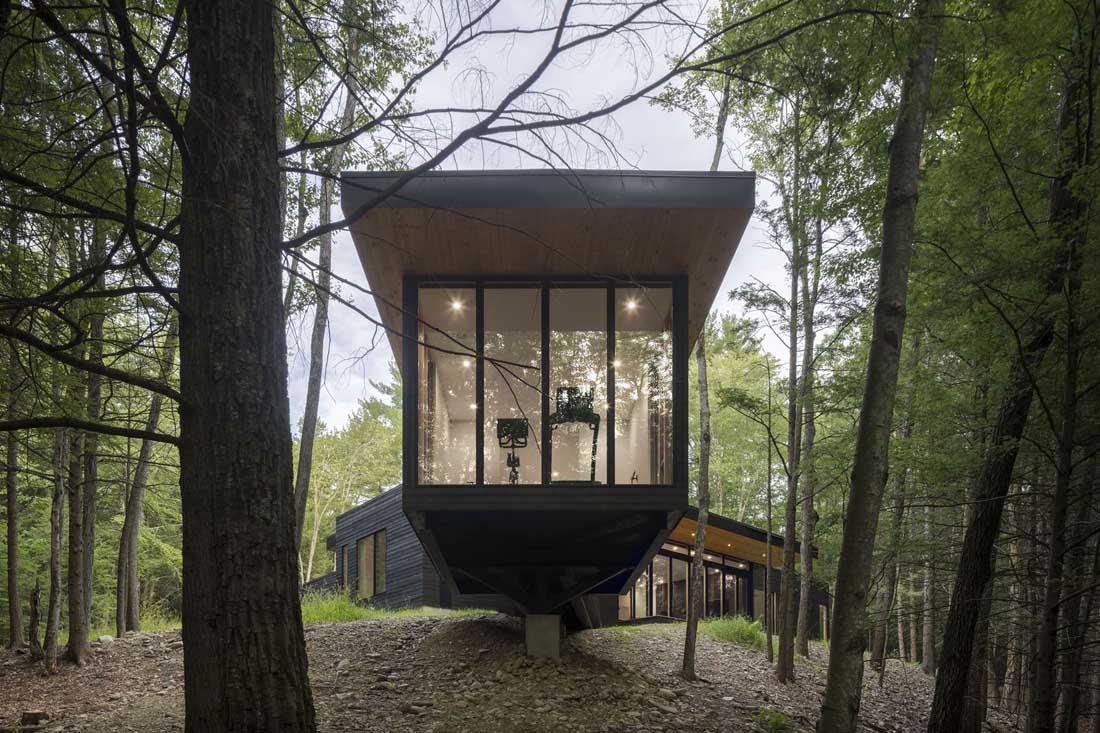 在纽约州克洪克森(Kerhonkson),一个浮动房子高耸于天然山脊之上,将精心策划的私人庇护所固定在树林中。在纽约哈德逊河谷的卡茨基尔山脉的山脚下,茂密的林地,海拔高度发生了巨大变化,这是创造独特视角的难得机会。