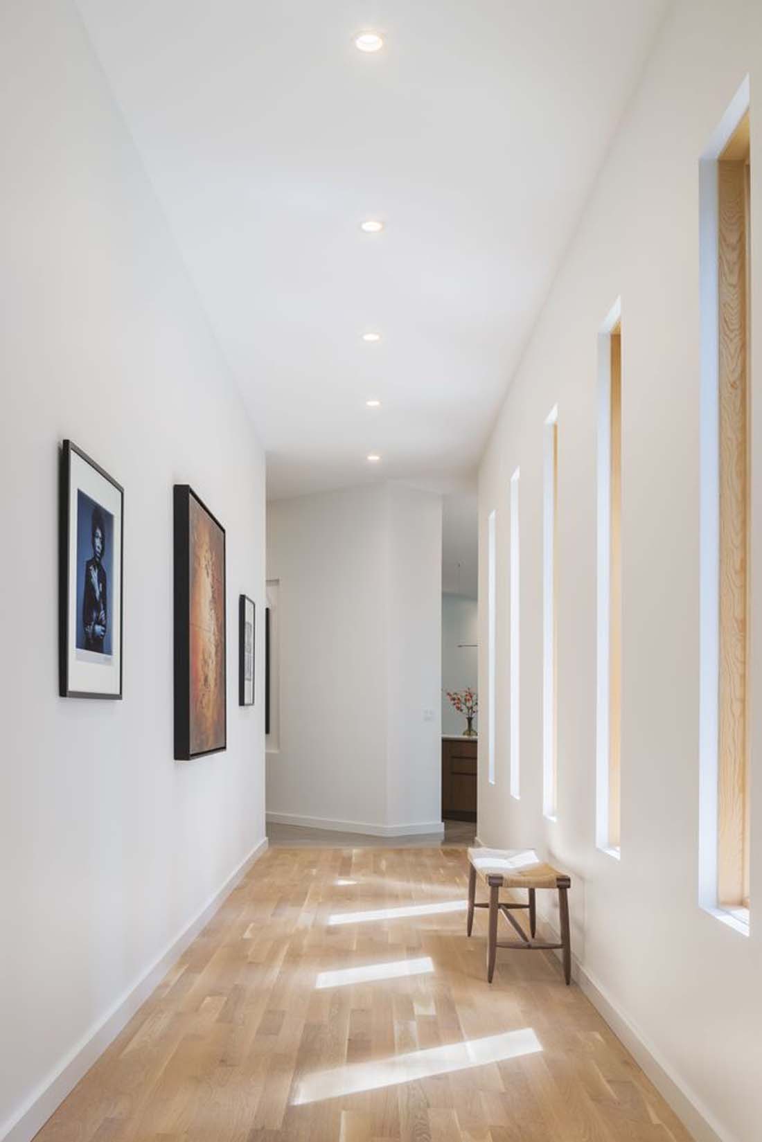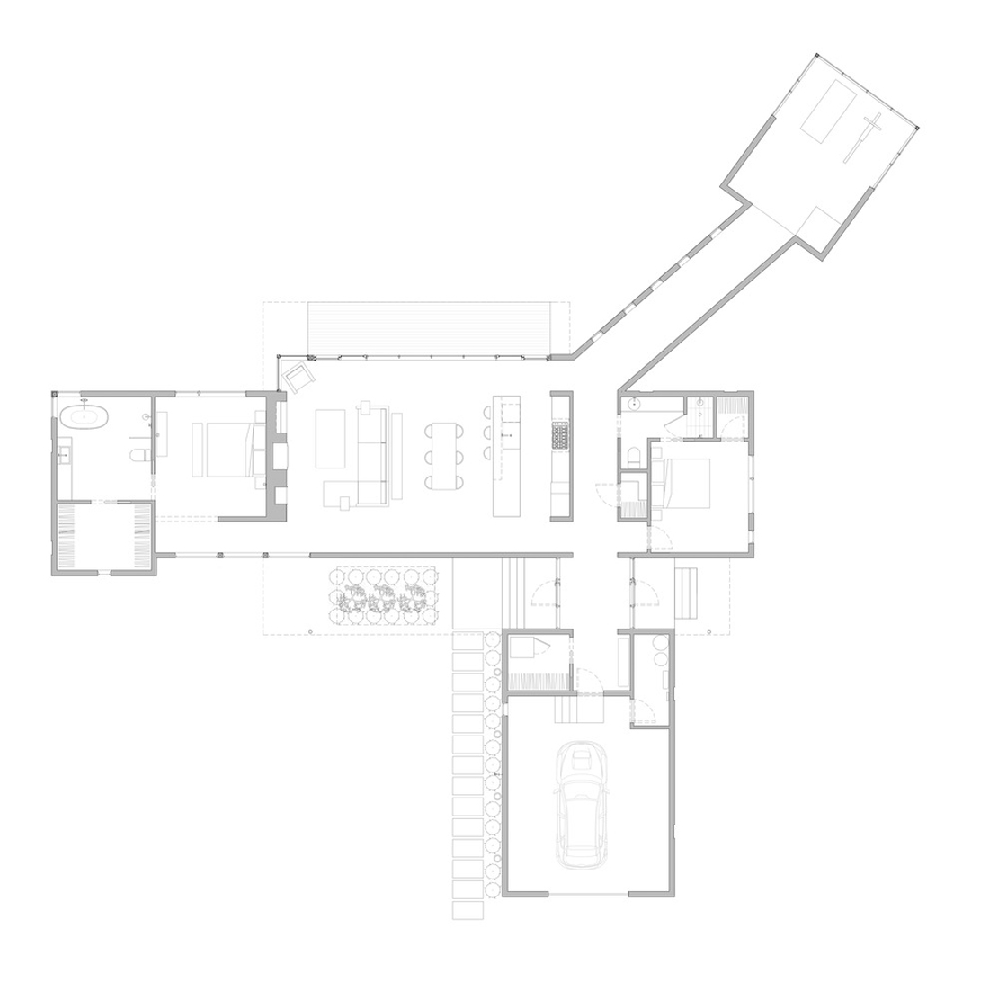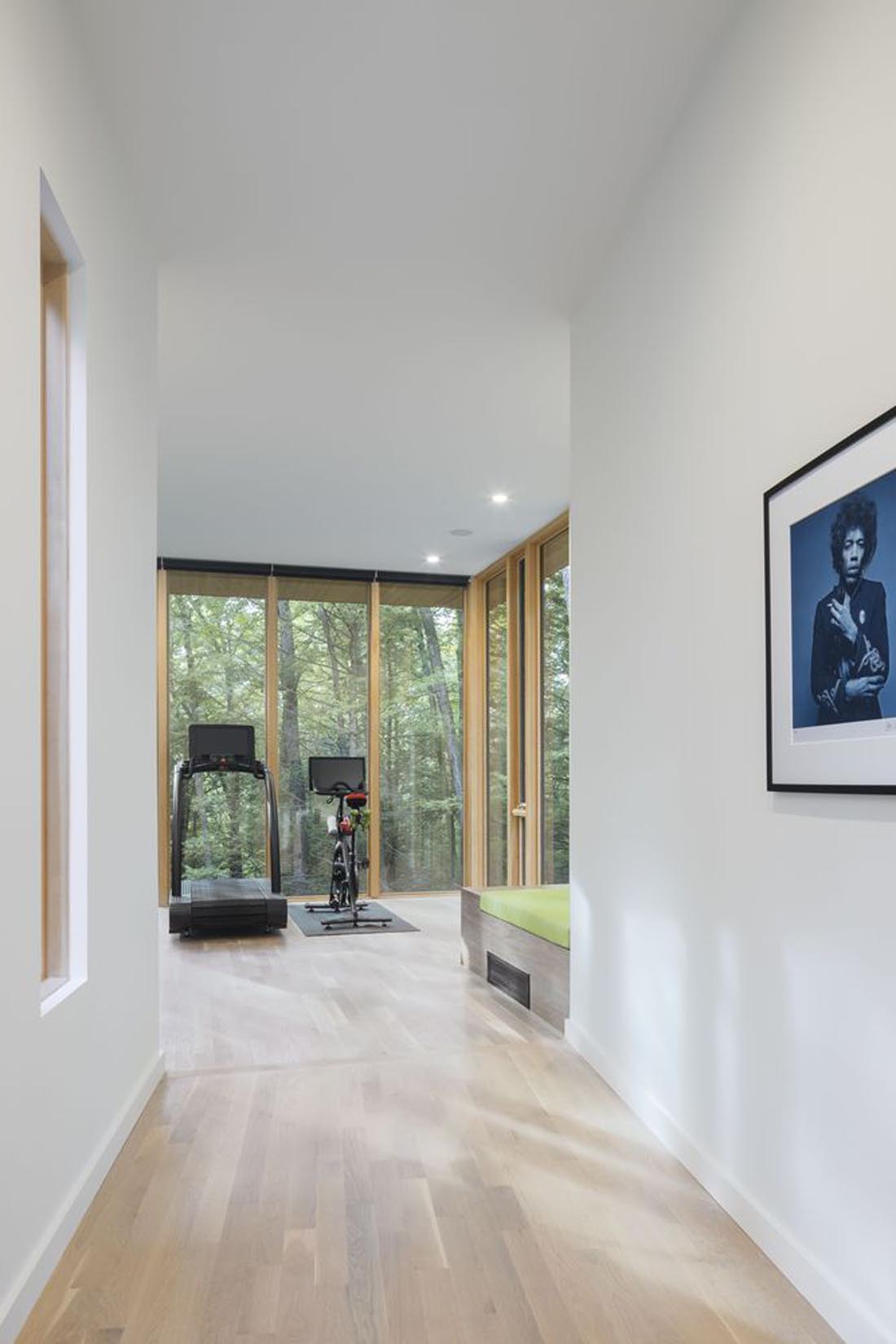 通过封闭的画廊,故意将工作室的体积与房屋的其余部分分开。沿着山脊线,画廊强调了到工作室的旅程,同时展示了深刻的个人纪念品和艺术品-视觉提醒人们形成的成就和令人难忘的生活经历。这个工作室被玻璃的三面封闭,是一个追求个人激情的专用空间–该客户正在运行。跑步机和室内自行车可以使您集中精力进行体育锻炼,同时与树木繁茂的景观保持令人振奋的视觉联系。