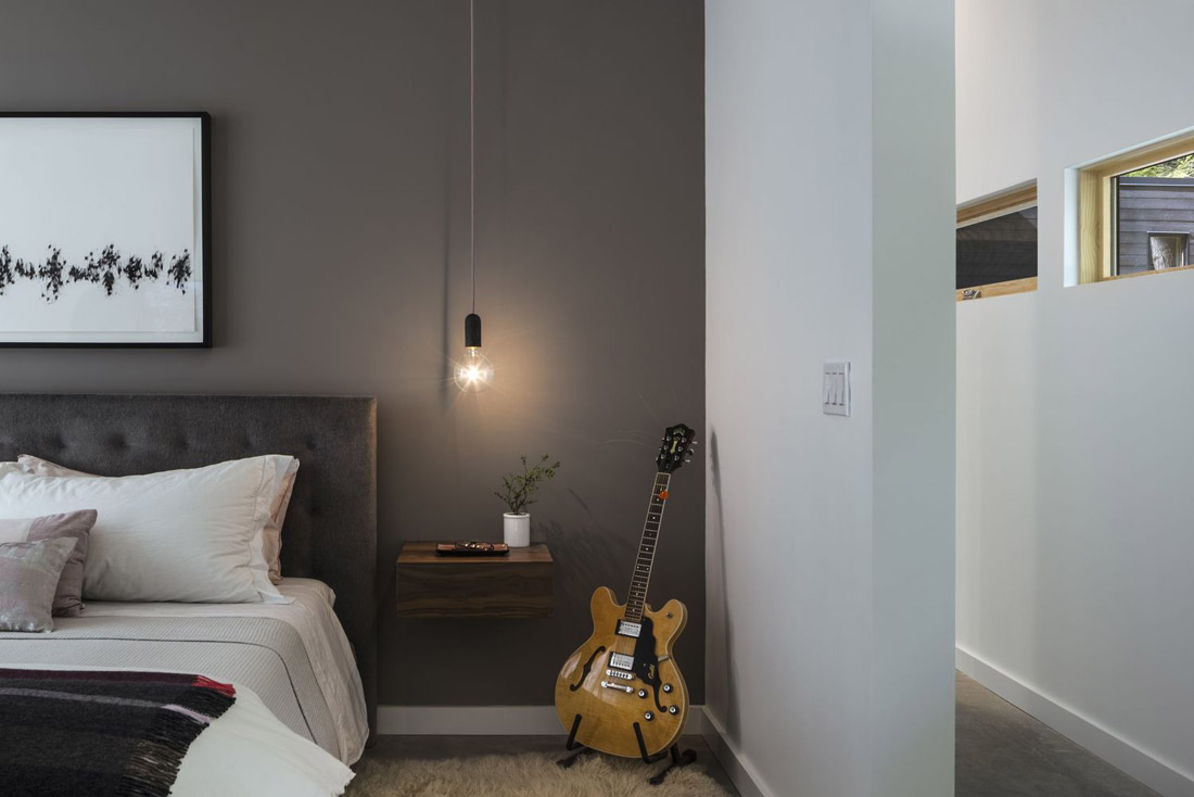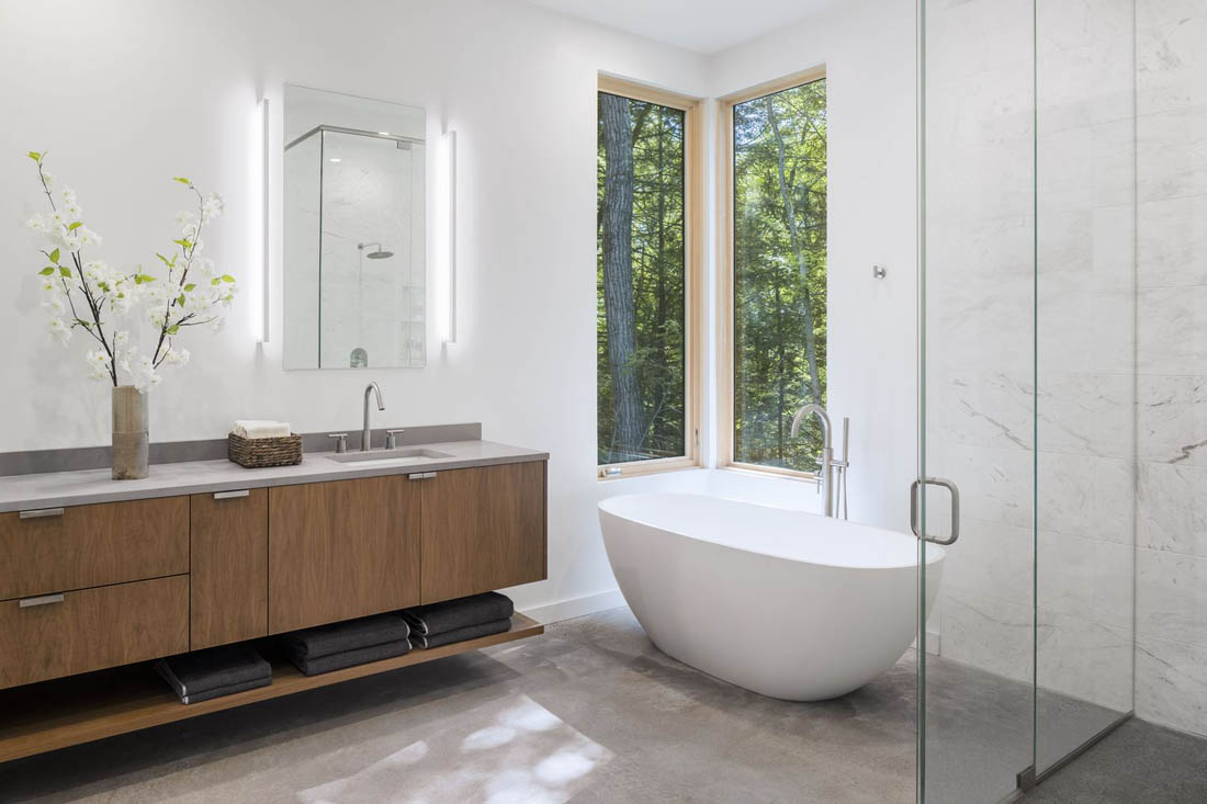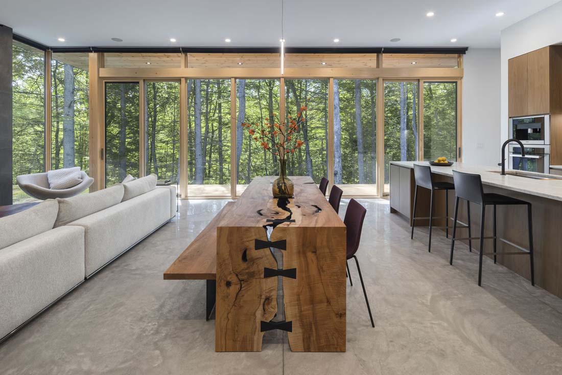 在家中的其他地方,不断变化的现场视野唤起了不同的感受,并与环境产生了新的体验互动。从房屋的开放式起居室和天井,大面积的玻璃可以将森林的美景尽收眼底。主要居住空间外部缓缓倾斜的地形呈现出与工作室不同的有利位置,让人感到身处树林之中而不是树木上方。主套房设有一个宽敞的独立式浴缸–跑步后既可以放松又可以康复的地方。