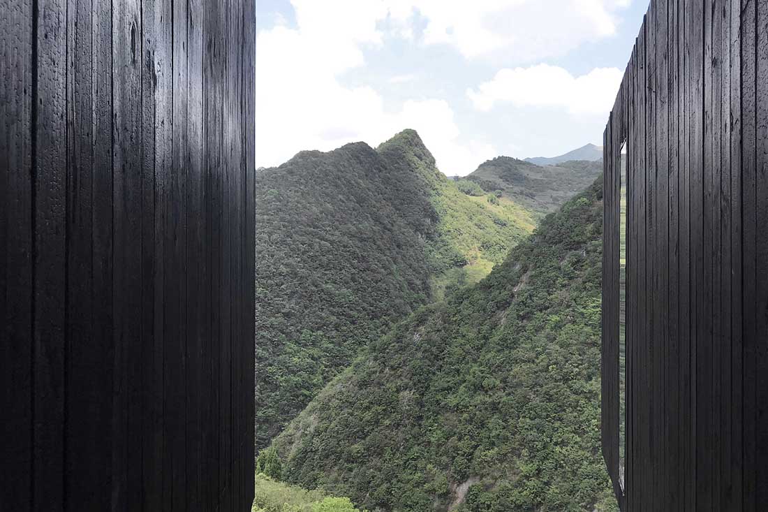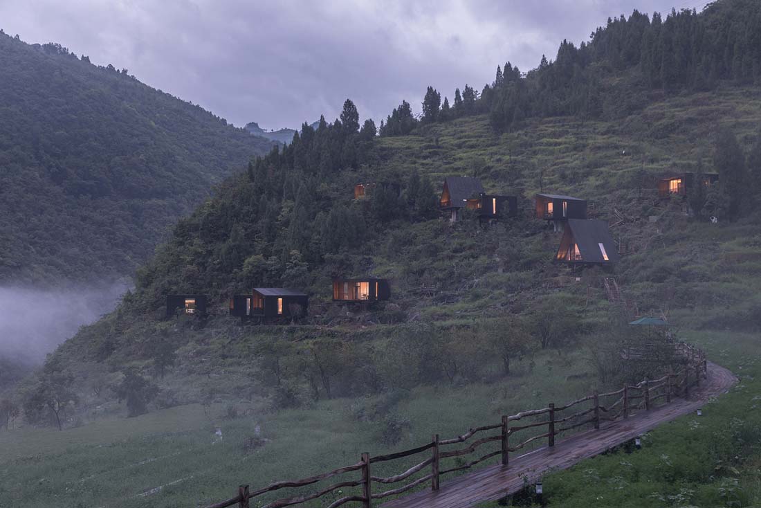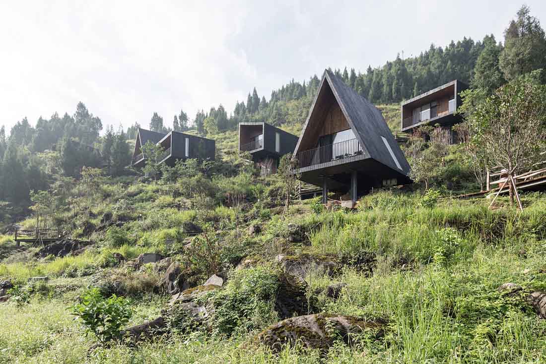 木屋的外墙以统一的材料淬火木构筑,具有耐候的特性,深色自然的质感和低调的整体形象与环境中丰茂的草丛与树林和谐共处。同时单体的视野及流线也经过充分的考量,各自望向巍然大山不受打扰。三种不同基本几何形态的木屋根据现场观景面切削出形式多样的窗口,赋予简单空间以丰富感受;内凹的阳台,也为室内营造了独揽山景的私密感。