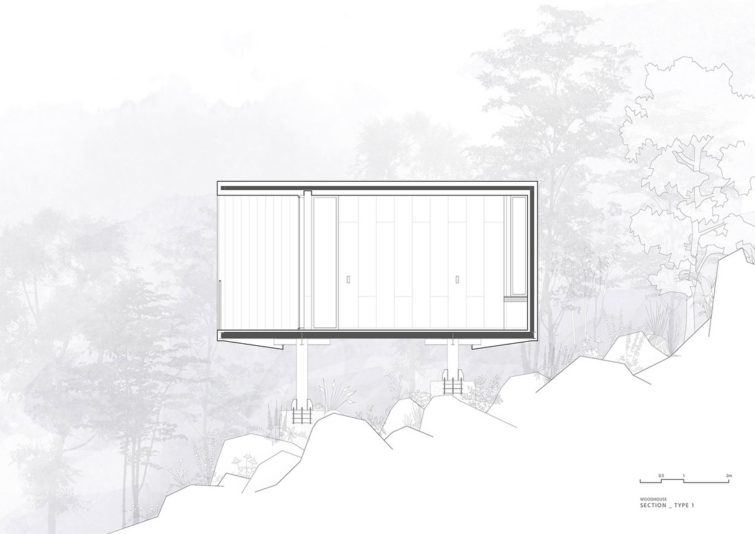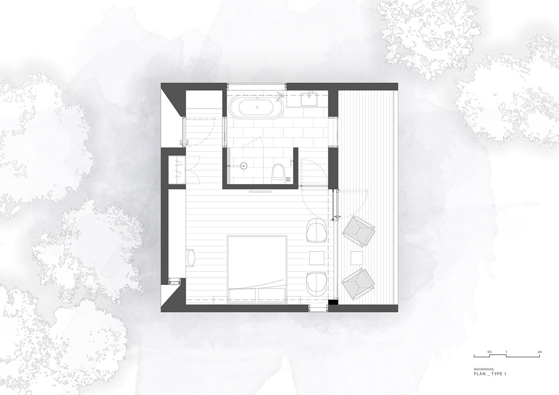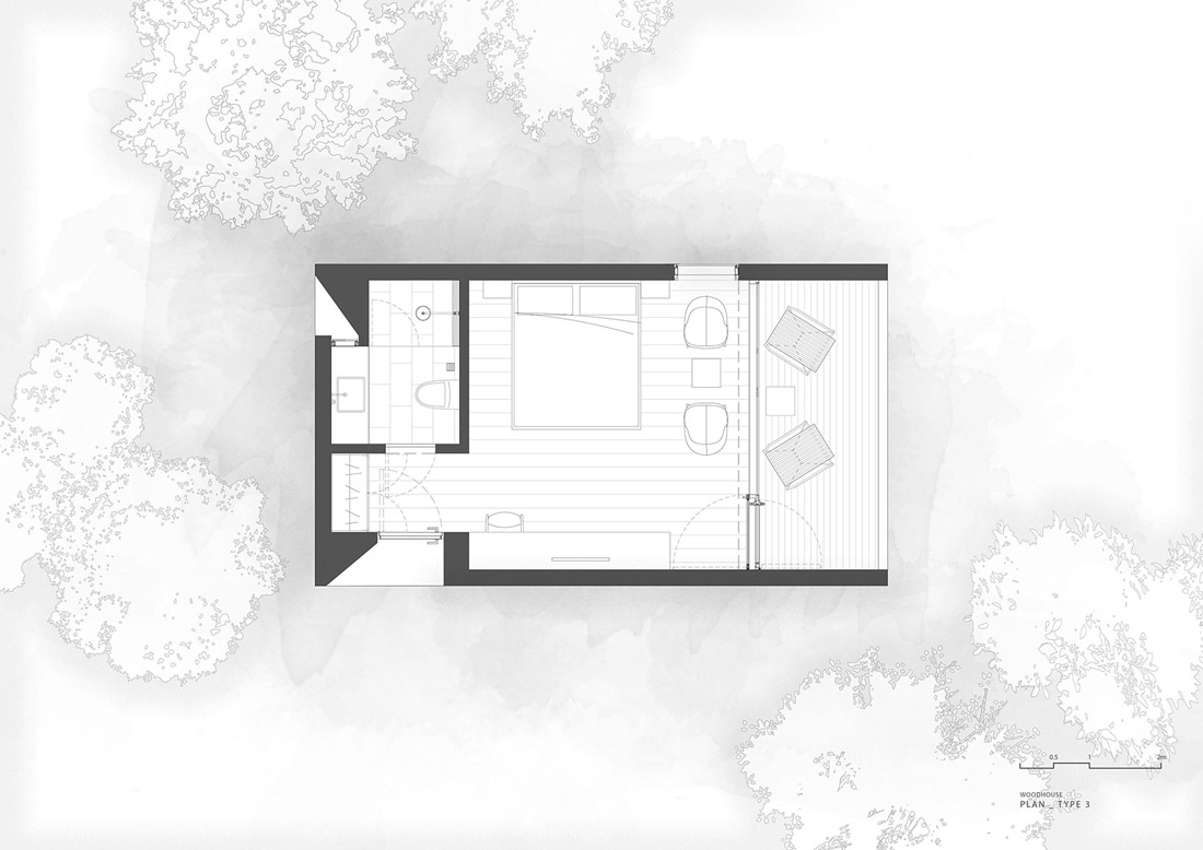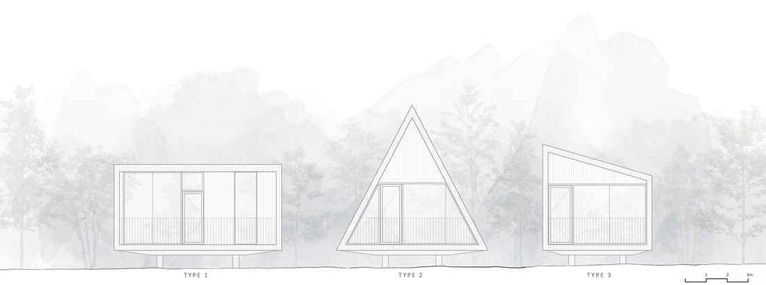 为了降低木屋酒店在环境中的存在感,设计排除了复杂或夸张的建筑形式,选取了三种简单的基本几何形态;每栋建筑作为独立客房,在保证室内舒适度的基础上将体量最小化,不过度消耗景观场地的空间。
